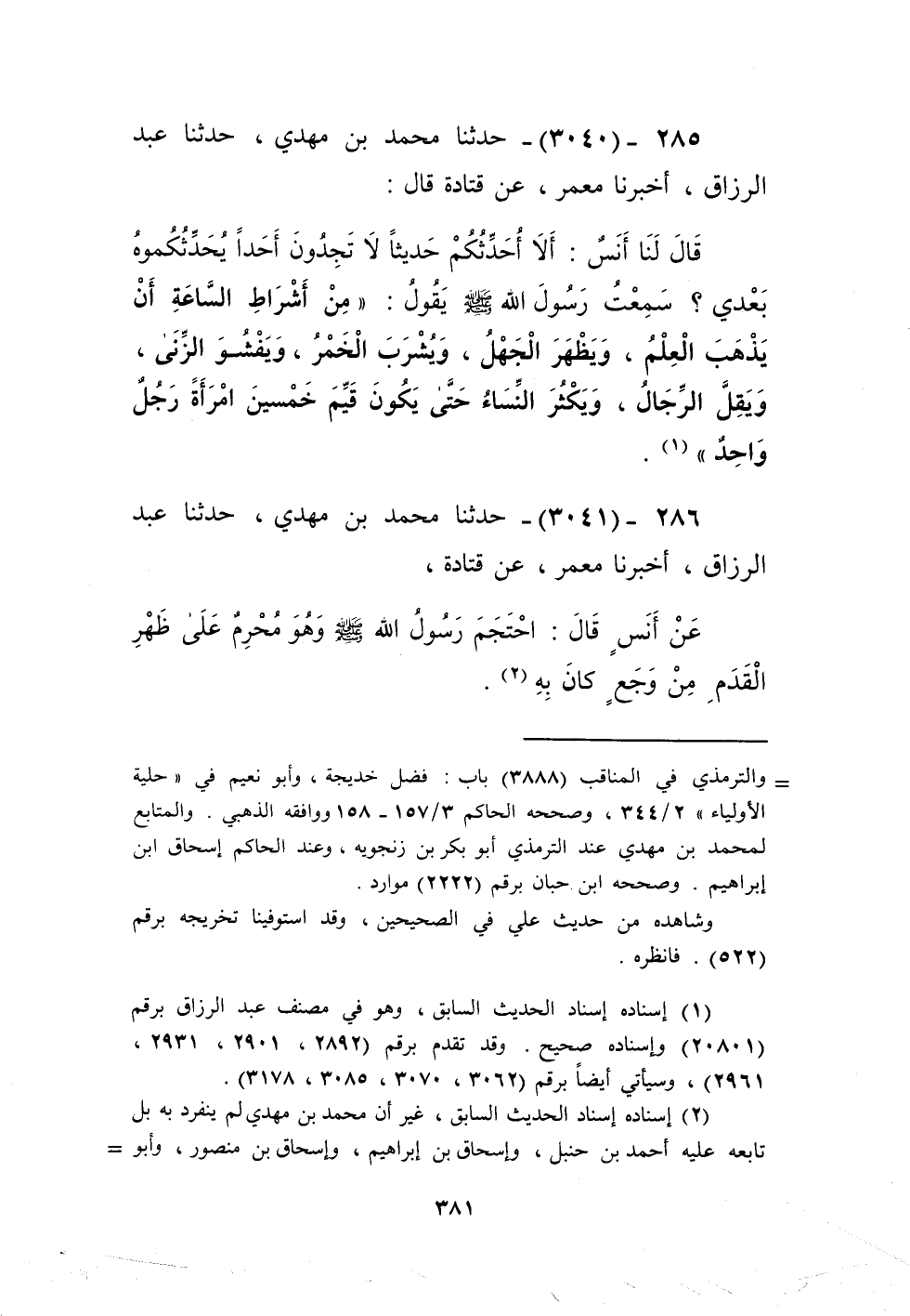 3040 - حَدَّثَنَا مُحَمَّدُ بْنُ مَهْدِيٍّ، حَدَّثَنَا عَبْدُ الرَّزَّاقِ، أَخْبَرَنَا مَعْمَرٌ، عَنْ قَتَادَةَ، قَالَ: قَالَ لَنَا أَنَسٌ: أَلَا أُحَدِّثُكُمْ حَدِيثًا لَا تَجِدُونَ أَحَدًا يُحَدِّثُكُمُوهُ بَعْدِي، سَمِعْتُ رَسُولَ اللَّهِ صَلَّى اللهُ عَلَيْهِ وَسَلَّمَ يَقُولُ: «§مِنْ أَشْرَاطِ السَّاعَةِ أَنْ يَذْهَبَ الْعِلْمُ، وَيَظْهَرَ الْجَهْلُ، وَيُشْرَبَ الْخَمْرُ وَيَفْشُوَ الزِّنَى، وَيَقِلَّ الرِّجَالُ، وَيَكْثُرَ النِّسَاءُ حَتَّى يَكُونَ قَيِّمَ خَمْسِينَ امْرَأَةً رَجُلٌ وَاحِدٌ» Kإسناده صحيح