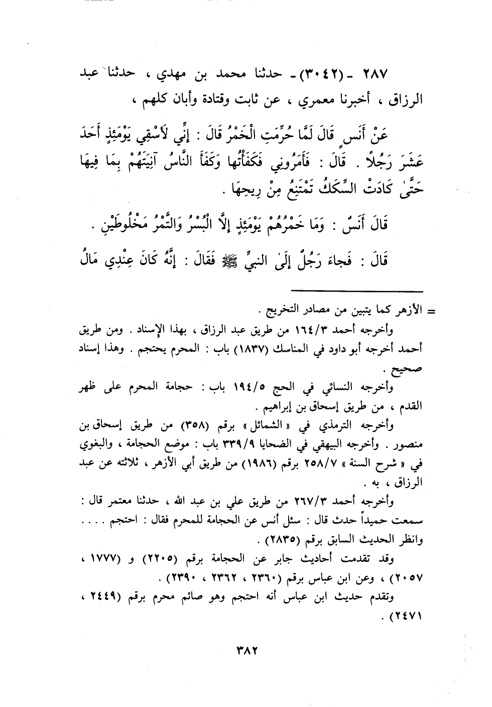 3042 - حَدَّثَنَا مُحَمَّدُ بْنُ مَهْدِيٍّ، حَدَّثَنَا عَبْدُ الرَّزَّاقِ، أَخْبَرَنَا مَعْمَرٌ، عَنْ ثَابِتٍ، وَقَتَادَةَ، وَأَبَانَ، كُلُّهُمْ، عَنْ أَنَسٍ، قَالَ: حُرِّمَتِ الْخَمْرُ، قَالَ: إِنِّي لَأَسْقِي يَوْمَئِذٍ أَحَدَ عَشَرَ رَجُلًا، قَالَ: فَأَمَرُونِي فَكَفَأْتُهَا وَكَفَأَ النَّاسُ آنِيَتَهُمْ بِمَا فِيهَا حَتَّى كَادَتِ السِّكَكُ تَمْتَنِعُ مِنْ رِيحُهَا، قَالَ أَنَسٌ: وَمَا خَمْرُهُمْ يَوْمَئِذٍ إِلَّا الْبُسْرُ وَالتَّمْرُ مَخْلُوطَيْنِ، قَالَ: فَجَاءَ رَجُلٌ إِلَى النَّبِيِّ صَلَّى اللهُ عَلَيْهِ وَسَلَّمَ فَقَالَ: إِنَّهُ كَانَ عِنْدِي مَالُ يَتِيمٍ فَاشْتَرَيْتُ بِهِ خَمْرًا، أَفَتَأْذَنُ لِي أَنْ أَبِيعَهُ فَأَرُدَّ عَلَى الْيَتِيمِ مَالَهُ؟ قَالَ: فَقَالَ النَّبِيُّ صَلَّى اللهُ عَلَيْهِ وَسَلَّمَ: «§قَاتَلَ اللَّهُ الْيَهُودَ حُرِّمَتْ عَلَيْهِمُ الثُّرُوبُ فَبَاعُوهَا وَأَكَلُوا أَثْمَانَهَا» وَلَمْ يَأْذَنْ لَهُ فِي بَيْعِ الْخَمْرِKإسناده صحيح