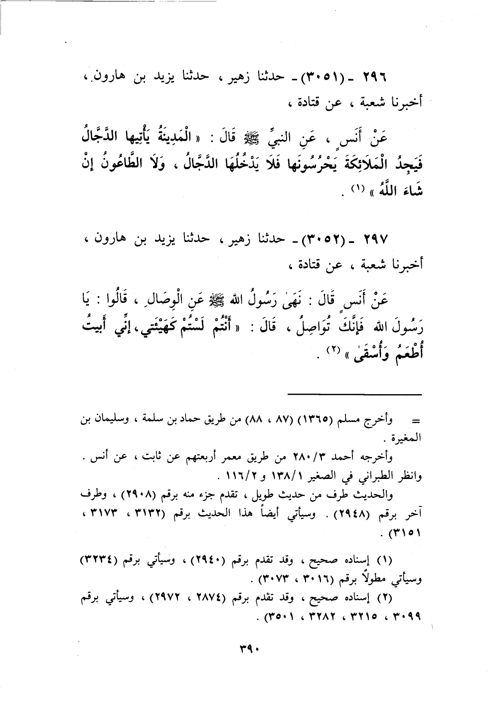 3051 - حَدَّثَنَا زُهَيْرٌ، حَدَّثَنَا يَزِيدُ بْنُ هَارُونَ، أَخْبَرَنَا شُعْبَةُ، عَنْ قَتَادَةَ، عَنْ أَنَسٍ، عَنِ النَّبِيِّ صَلَّى اللهُ عَلَيْهِ وَسَلَّمَ قَالَ: «§الْمَدِينَةُ يَأْتِيهَا الدَّجَّالُ فَيَجِدُ الْمَلَائِكَةَ يَحْرُسُونَهَا فَلَا يَدْخُلُهَا الدَّجَّالُ وَلَا الطَّاعُونُ إِنْ شَاءَ اللَّهُ» Kإسناده صحيح