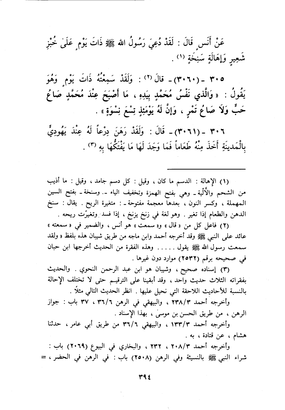 3061 - قَالَ: «وَلَقَدْ §رَهَنَ دِرْعًا لَهُ عِنْدَ يَهُودِيٍّ بِالْمَدِينَةِ أَخَذَ مِنْهُ طَعَامًا فَمَا وَجَدَ لَهَا مَا يَفْتَكُّهَا بِهِ» Kإسناده صحيح