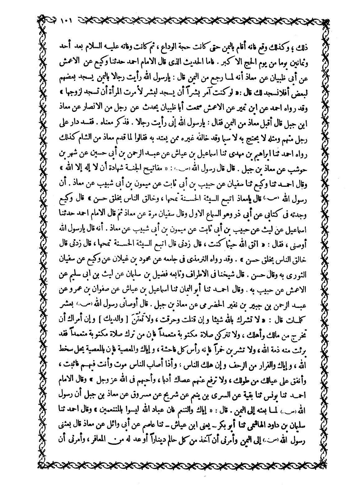 ذَلِكَ، وَكَذَلِكَ وَقَعَ فَإِنَّهُ أَقَامَ بِالْيَمَنِ حَتَّى كَانَتْ حَجَّةُ الْوَدَاعِ، ثُمَّ كَانَتْ وَفَاتُهُ عَلَيْهِ السلام بَعْدَ أَحَدٍ وَثَمَانِينَ يَوْمًا مِنْ يَوْمِ الْحَجِّ الْأَكْبَرِ. فَأَمَّا الْحَدِيثُ الَّذِي قَالَ الْإِمَامُ أَحْمَدُ حَدَّثَنَا وَكِيعٌ عَنِ الْأَعْمَشِ عَنْ أَبِي ظَبْيَانَ عَنْ مُعَاذٍ أَنَّهُ لَمَّا رَجَعَ مِنَ الْيَمَنِ قَالَ: يَا رَسُولَ اللَّهِ رَأَيْتُ رِجَالًا بِالْيَمَنِ يَسْجُدُ بَعْضُهُمْ لِبَعْضٍ أَفَلَا نَسْجُدُ لَكَ قَالَ: «لو كنت آمر بَشَرًا أَنْ يَسْجُدَ لِبَشَرٍ لَأَمَرْتُ الْمَرْأَةَ أَنْ تَسْجُدَ لِزَوْجِهَا» وَقَدْ رَوَاهُ أَحْمَدُ عَنِ ابْنِ نُمَيْرٍ عَنِ الْأَعْمَشِ سَمِعْتُ أَبَا ظَبْيَانَ يُحَدِّثُ عن رجل من الأنصار عن معاذ ابن جَبَلٍ قَالَ أَقْبَلَ مُعَاذٌ مِنَ الْيَمَنِ فَقَالَ: يَا رَسُولَ اللَّهِ إِنِّي رَأَيْتُ رِجَالًا. فَذَكَرَ معناه. فقد دار على رجل منهم وَمِثْلُهُ لَا يُحْتَجُّ بِهِ لَا سِيَّمَا وَقَدْ خَالَفَهُ غَيْرُهُ مِمَّنْ يُعْتَدُّ بِهِ فَقَالُوا لَمَّا قَدِمَ مُعَاذٌ مِنَ الشَّامِ كَذَلِكَ رَوَاهُ أَحْمَدُ ثَنَا إِبْرَاهِيمُ بْنُ مَهْدِيٍّ ثَنَا إِسْمَاعِيلُ بْنُ عياش عن عَبْدِ الرَّحْمَنِ بْنِ أَبِي حُسَيْنٍ عَنْ شَهْرِ بْنِ حَوْشَبٍ عَنْ مُعَاذِ بْنِ جَبَلٍ. قَالَ قَالَ رَسُولُ اللَّهِ صَلَّى اللَّهُ عَلَيْهِ وَسَلَّمَ: «مَفَاتِيحُ الْجَنَّةِ شَهَادَةُ أَنْ لَا إِلَهَ إِلَّا اللَّهُ» وَقَالَ أَحْمَدُ ثَنَا وَكِيعٌ ثَنَا سُفْيَانُ عَنْ حَبِيبِ بْنِ أَبِي ثَابِتٍ عَنْ مَيْمُونِ بْنِ أَبِي شَبِيبٍ عَنْ مُعَاذٍ. أَنَّ رَسُولَ اللَّهِ صَلَّى اللَّهُ عَلَيْهِ وَسَلَّمَ قَالَ يَا مُعَاذُ أَتْبِعِ السَّيِّئَةَ الْحَسَنَةَ تَمْحُهَا، وَخَالِقِ النَّاسَ بِخُلُقٍ حَسَنٍ» قَالَ وَكِيعٌ وَجَدْتُهُ فِي كِتَابِي عَنْ أَبِي ذَرٍ وَهُوَ السَّمَاعُ الْأَوَّلُ وَقَالَ سُفْيَانُ مَرَّةً عَنْ مُعَاذٍ ثُمَّ قَالَ الْإِمَامُ أَحْمَدُ حَدَّثَنَا إِسْمَاعِيلُ عَنْ لَيْثٍ عَنْ حَبِيبِ بْنِ أَبِي ثَابِتٍ عَنْ مَيْمُونِ بْنِ أَبِي شَبِيبٍ عَنْ مُعَاذٍ. أَنَّهُ قَالَ يَا رَسُولَ اللَّهِ أَوْصِنِي، فَقَالَ: «اتَّقِ اللَّهَ حَيْثُمَا كُنْتَ، قَالَ زِدْنِي قَالَ أَتْبِعِ السَّيِّئَةَ الْحَسَنَةَ تَمْحُهَا، قَالَ زِدْنِي قَالَ خَالِقِ النَّاسَ بِخُلُقٍ حَسَنٍ» . وَقَدْ رَوَاهُ التِّرْمِذِيُّ فِي جَامِعِهِ عَنْ مَحْمُودِ بْنِ غَيْلَانَ عَنْ وَكِيعٍ عَنْ سُفْيَانَ الثَّوْرِيِّ بِهِ وَقَالَ حَسَنٌ. قَالَ شَيْخُنَا فِي الْأَطْرَافِ وتابعه فضيل بن سليمان عن ليث بن ابى سليم عن الأعمش عَنْ حَبِيبٍ بِهِ. وَقَالَ أَحْمَدُ ثَنَا أَبُو الْيَمَانِ ثَنَا إِسْمَاعِيلُ بْنُ عَيَّاشٍ عَنْ صَفْوَانُ بْنُ عَمْرٍو عَنْ عَبْدِ الرَّحْمَنِ بْنِ جُبَيْرِ بْنِ نُفَيْرٍ الْحَضْرَمِيِّ عَنْ مُعَاذِ بْنِ جَبَلٍ. قَالَ أَوْصَانِي رَسُولِ اللَّهِ صَلَّى اللَّهُ عَلَيْهِ وَسَلَّمَ بِعَشْرِ كَلِمَاتٍ قَالَ: «لَا تُشْرِكْ باللَّه شَيْئًا وَإِنْ قُتِلْتَ وَحُرِّقْتَ، وَلَا تَعُقَّنَّ [وَالِدَيْكَ] وإن أمراك أن تخرج من مالك وأهلك، وَلَا تَتْرُكَنَّ صَلَاةً مَكْتُوبَةً مُتَعَمِّدًا فَإِنَّ مَنْ تَرَكَ صَلَاةً مَكْتُوبَةً مُتَعَمِّدًا فَقَدْ بَرِئَتْ مِنْهُ ذِمَّةُ اللَّهِ، وَلَا تَشْرَبَنَّ خَمْرًا فَإِنَّهُ رَأَسُ كُلِّ فَاحِشَةٍ، وَإِيَّاكَ وَالْمَعْصِيَةَ فَإِنَّ بِالْمَعْصِيَةِ يَحِلُّ سَخَطُ اللَّهِ، وَإِيَّاكَ وَالْفِرَارَ مِنَ الزَّحْفِ وَإِنْ هَلَكَ النَّاسُ، وَإِذَا أَصَابَ النَّاسَ مَوْتٌ وَأَنْتَ فِيهِمْ فَاثْبُتْ، وَأَنْفِقْ عَلَى عِيَالِكَ مِنْ طَوْلِكَ، ولا ترفع عنهم عصاك أدبا، وأحبهم فِي اللَّهِ عَزَّ وَجَلَّ» وَقَالَ الْإِمَامُ أَح
