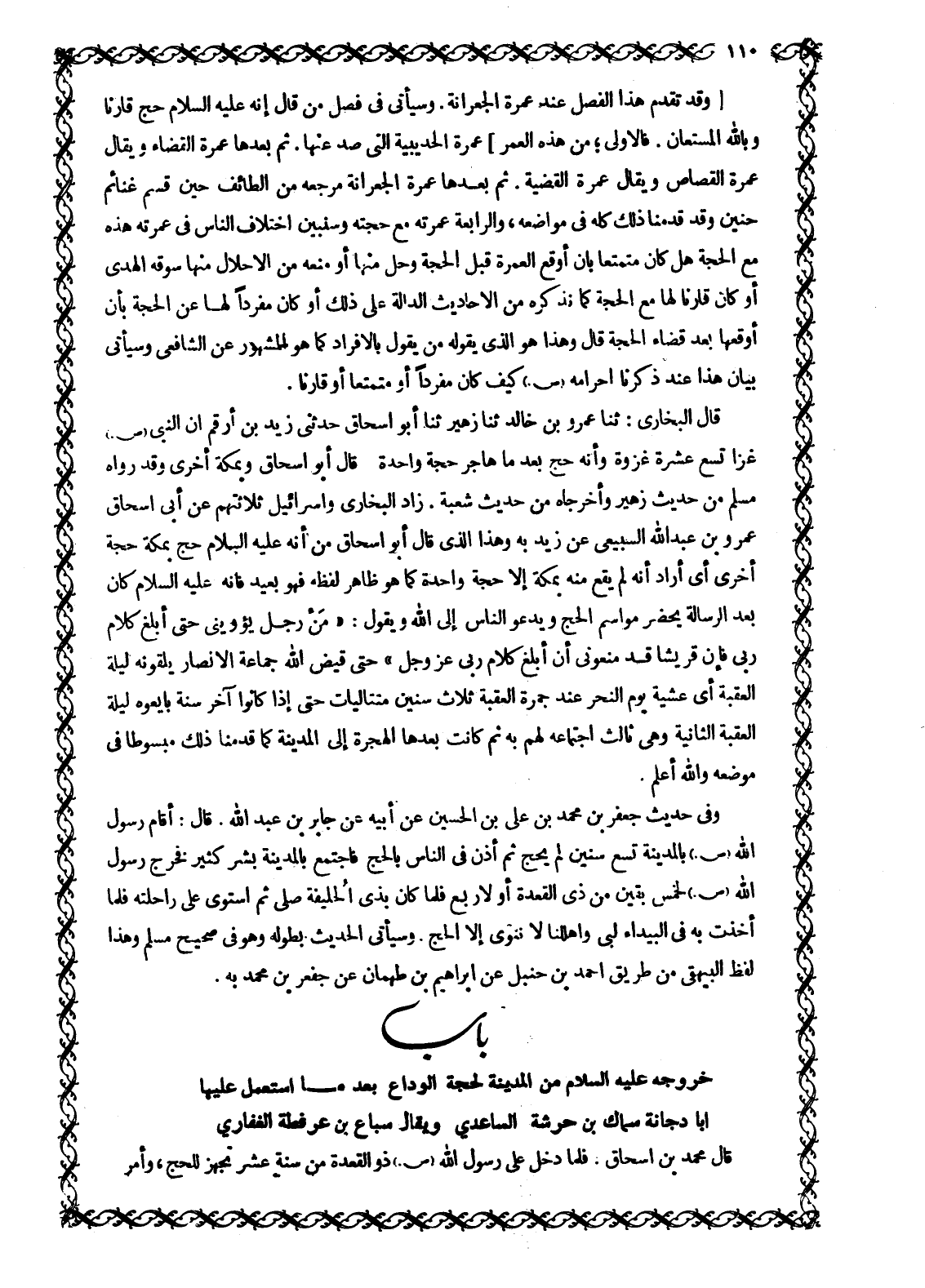 وَفِي حَدِيثِ جَعْفَرِ بْنِ مُحَمَّدِ بْنِ عَلِيِّ بْنِ الْحُسَيْنِ عَنْ أَبِيهِ عَنْ جَابِرِ بْنِ عَبْدِ اللَّهِ. قَالَ: أَقَامَ رَسُولُ اللَّهِ صَلَّى اللَّهُ عَلَيْهِ وَسَلَّمَ بِالْمَدِينَةِ تِسْعَ سِنِينَ لَمْ يَحُجَّ ثُمَّ أَذَّنَ فِي النَّاسِ بِالْحَجِّ فَاجْتَمَعَ بِالْمَدِينَةِ بَشَرٌ كَثِيرٌ فَخَرَجَ رَسُولُ اللَّهِ صَلَّى اللَّهُ عَلَيْهِ وَسَلَّمَ لِخَمْسٍ بَقِينَ مِنْ ذِي الْقَعْدَةِ أَوْ لِأَرْبَعٍ فَلَمَّا كَانَ بِذِي الْحُلَيْفَةِ صَلَّى ثُمَّ اسْتَوَى عَلَى رَاحِلَتِهِ فَلَمَّا أَخَذَتْ بِهِ فِي الْبَيْدَاءِ لَبَّى وَأَهْلَلْنَا لَا نَنْوِي إِلَّا الْحَجَّ. وَسَيَأْتِي الْحَدِيثُ بِطُولِهِ وَهُوَ فِي صَحِيحِ مُسْلِمٍ وَهَذَا لَفْظُ الْبَيْهَقِيِّ مِنْ طريق احمد بن حنبل عَنْ إِبْرَاهِيمَ بْنِ طَهْمَانَ عَنْ جَعْفَرِ بْنِ محمد به.