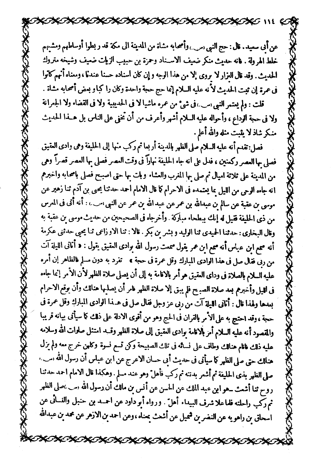 فصل: تقدم أنه عليه السلام صَلَّى الظُّهْرَ بِالْمَدِينَةِ أَرْبَعًا ثُمَّ رَكِبَ مِنْهَا إِلَى الْحُلَيْفَةِ وَهِيَ وَادِي الْعَقِيقِ فَصَلَّى بِهَا الْعَصْرَ رَكْعَتَيْنِ، فَدَلَّ عَلَى أَنَّهُ جَاءَ الْحُلَيْفَةَ نَهَارًا فِي وَقْتِ الْعَصْرِ فَصَلَّى بِهَا الْعَصْرَ قَصْرًا وَهِيَ مِنَ الْمَدِينَةِ عَلَى ثَلَاثَةِ أَمْيَالٍ ثُمَّ صَلَّى بِهَا الْمَغْرِبَ وَالْعِشَاءَ وَبَاتَ بِهَا حَتَّى أَصْبَحَ فَصَلَّى بِأَصْحَابِهِ وَأَخْبَرَهُمْ أَنَّهُ جَاءَهُ الْوَحْيُ مِنَ اللَّيْلِ بِمَا يَعْتَمِدُهُ فِي الْإِحْرَامِ كَمَا قَالَ الْإِمَامُ أَحْمَدُ حَدَّثَنَا يَحْيَى بْنُ آدَمَ ثَنَا زُهَيْرٌ عَنْ مُوسَى بْنِ عُقْبَةَ عَنْ سَالِمِ بْنِ عَبْدِ اللَّهِ بْنِ عُمَرَ عَنْ عَبْدِ اللَّهِ بْنِ عُمَرَ عَنِ النَّبِيِّ صَلَّى اللَّهُ عَلَيْهِ وَسَلَّمَ: أَنَّهُ أُتِيَ فِي الْمُعَرَّسِ مِنْ ذِي الْحُلَيْفَةِ فَقِيلَ لَهُ إِنَّكَ بِبَطْحَاءَ مُبَارَكَةٍ. وَأَخْرَجَاهُ فِي الصَّحِيحَيْنِ مِنْ حَدِيثِ مُوسَى بْنِ عُقْبَةَ بِهِ وَقَالَ الْبُخَارِيُّ: حَدَّثَنَا الْحُمَيْدِيُّ ثَنَا الْوَلِيدُ وَبِشْرُ بْنُ بَكْرٍ. قَالَا: ثَنَا الْأَوْزَاعِيُّ ثَنَا يَحْيَى حَدَّثَنِي عِكْرِمَةُ أَنَّهُ سمع ابن عباس أنه سمع ابن عمر يقول سمعت رسول الله بِوَادِي الْعَقِيقِ يَقُولُ: «أَتَانِي اللَّيْلَةَ آتٍ مِنْ رَبِّي فَقَالَ صَلِّ فِي هَذَا الْوَادِي الْمُبَارَكِ وَقُلْ عُمْرَةً فِي حَجَّةٍ» تَفَرَّدَ بِهِ دُونَ مسلم فالظاهر إن أمره عليه السلام بِالصَّلَاةِ فِي وَادِي الْعَقِيقِ هُوَ أَمْرٌ بِالْإِقَامَةِ بِهِ إِلَى أَنْ يُصَلِّيَ صَلَاةَ الظُّهْرِ لِأَنَّ الْأَمْرَ إِنَّمَا جَاءَهُ فِي اللَّيْلِ وَأَخْبَرَهُمْ بَعْدَ صَلَاةِ الصُّبْحِ فَلَمْ يَبْقَ إِلَّا صَلَاةُ الظُّهْرِ فَأُمِرَ أَنْ يُصَلِّيَهَا هُنَالِكَ وَأَنْ يُوقِعَ الْإِحْرَامَ بَعْدَهَا وَلِهَذَا قَالَ: أَتَانِي اللَّيْلَةَ آتٍ مِنْ رَبِّي عَزَّ وَجَلَّ فَقَالَ صَلِّ فِي هَذَا الْوَادِي الْمُبَارَكِ وَقُلْ عُمْرَةً فِي حَجَّةٍ، وَقَدِ احْتُجَّ بِهِ عَلَى الْأَمْرِ بِالْقِرَانِ فِي الْحَجِّ وَهُوَ مِنْ أَقْوَى الْأَدِلَّةِ عَلَى ذَلِكَ كَمَا سيأتي بيانه قريبا والمقصود أنه عليه السلام أُمِرَ بِالْإِقَامَةِ بِوَادِي الْعَقِيقِ إِلَى صَلَاةِ الظُّهْرِ وَقَدِ امْتَثَلَ صَلَوَاتُ اللَّهِ وَسَلَامُهُ عَلَيْهِ ذَلِكَ فَأَقَامَ هُنَالِكَ وَطَافَ عَلَى نِسَائِهِ فِي تِلْكَ الصَّبِيحَةِ وَكُنَّ تِسْعَ نِسْوَةٍ وَكُلُّهُنَّ خَرَجَ مَعَهُ ولم يزل لك حَتَّى صَلَّى الظُّهْرَ كَمَا سَيَأْتِي فِي حَدِيثِ أَبِي حَسَّانَ الْأَعْرَجِ عَنِ ابْنِ عَبَّاسٍ أَنَّ رَسُولَ اللَّهِ صَلَّى اللَّهُ عَلَيْهِ وَسَلَّمَ صلى الظُّهْرَ بِذِي الْحُلَيْفَةِ ثُمَّ أَشْعَرَ بَدَنَتَهُ ثُمَّ رَكِبَ فَأَهَلَّ وَهُوَ عِنْدَ مُسْلِمٍ. وَهَكَذَا قَالَ الْإِمَامُ أَحْمَدُ حَدَّثَنَا رَوْحٌ ثَنَا أَشْعَثُ- هُوَ ابْنُ عَبْدِ الْمَلِكِ عَنِ الْحَسَنِ عَنْ أَنَسِ بْنِ مَالِكٍ أَنَّ رَسُولَ اللَّهِ صَلَّى اللَّهُ عَلَيْهِ وَسَلَّمَ صَلَّى الظُّهْرَ ثُمَّ رَكِبَ رَاحِلَتَهُ فَلَمَّا عَلَا شَرَفَ الْبَيْدَاءِ أَهَلَّ. وَرَوَاهُ أَبُو دَاوُدَ عَنْ أَحْمَدَ بْنِ حَنْبَلٍ وَالنَّسَائِيِّ عَنْ إسحاق بن راهويه عن النضر بن شميل عَنْ أَشْعَثَ بِمَعْنَاهُ، وَعَنْ أَحْمَدَ بْنِ الْأَزْهَرِ عَنْ مُحَمَّدِ بْنِ عَبْدِ اللَّهِ