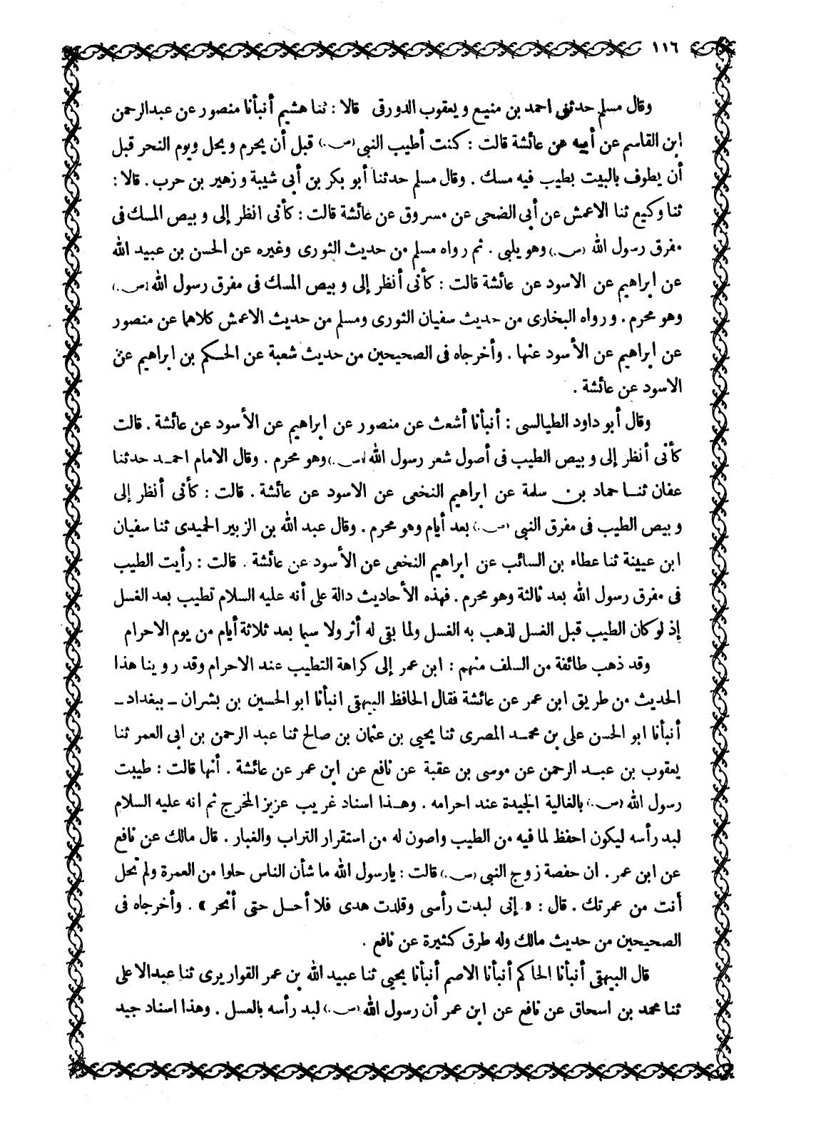 ثَنَا وَكِيعٌ ثَنَا الْأَعْمَشُ عَنْ أَبِي الضُّحَى عَنْ مَسْرُوقٍ عَنْ عَائِشَةَ قَالَتْ: كَأَنِّي أَنْظُرُ إِلَى وَبِيصِ الْمِسْكِ فِي مَفْرِقِ رَسُولِ اللَّهِ صَلَّى اللَّهُ عَلَيْهِ وَسَلَّمَ وَهُوَ يُلَبِّي. ثُمَّ رَوَاهُ مُسْلِمٌ مِنْ حَدِيثِ الثَّوْرِيِّ وَغَيْرِهِ عَنِ الْحَسَنِ بْنِ عُبَيْدِ اللَّهِ عَنْ إِبْرَاهِيمَ عَنِ الْأَسْوَدِ عَنْ عَائِشَةَ قَالَتْ: كَأَنِّي أَنْظُرُ إِلَى وَبِيصِ الْمِسْكِ فِي مَفْرِقِ رَسُولِ اللَّهِ صَلَّى اللَّهُ عَلَيْهِ وَسَلَّمَ وَهُوَ مُحْرِمٌ. وَرَوَاهُ الْبُخَارِيُّ مِنْ حَدِيثِ سُفْيَانَ الثَّوْرِيِّ وَمُسْلِمٌ مِنْ حَدِيثِ الْأَعْمَشِ كِلَاهُمَا عَنْ مَنْصُورٍ عَنْ إِبْرَاهِيمَ عَنِ الْأَسْوَدِ عَنْهَا. وَأَخْرَجَاهُ فِي الصَّحِيحَيْنِ مِنْ حَدِيثِ شُعْبَةَ عَنِ الْحَكَمِ بن إِبْرَاهِيمَ عَنِ الْأَسْوَدِ عَنْ عَائِشَةَ.