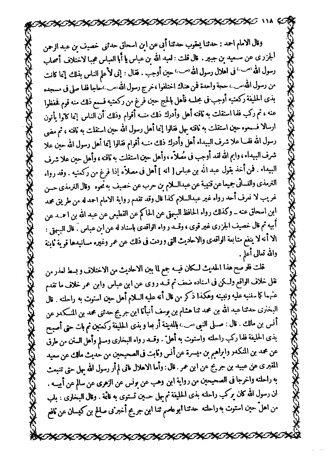 قُلْتُ فَلَوْ صَحَّ هَذَا الْحَدِيثُ لَكَانَ فِيهِ جَمْعٌ لِمَا بين الأحاديث من الاختلاف وبسط لعذر من نَقَلَ خِلَافَ الْوَاقِعِ وَلَكِنْ فِي إِسْنَادِهِ ضَعْفٌ ثُمَّ قَدْ رُوِيَ عَنِ ابْنِ عَبَّاسٍ وَابْنِ عُمَرَ خِلَافُ مَا تَقَدَّمَ عَنْهُمَا كَمَا سَنُنَبِّهُ عَلَيْهِ وَنُبَيِّنُهُ وَهَكَذَا ذَكَرَ مَنْ قَالَ أَنَّهُ عليه السلام أَهَلَّ حِينَ اسْتَوَتْ بِهِ رَاحِلَتُهُ. قَالَ الْبُخَارِيُّ حَدَّثَنَا عَبْدُ اللَّهِ بْنُ مُحَمَّدٍ ثنا هشام بْنُ يُوسُفَ أَنْبَأَنَا ابْنُ جُرَيْجٍ حَدَّثَنِي مُحَمَّدُ بْنُ الْمُنْكَدِرِ عَنْ أَنَسِ بْنِ مَالِكٍ. قَالَ: صَلَّى النَّبِيُّ صَلَّى اللَّهُ عَلَيْهِ وَسَلَّمَ بِالْمَدِينَةِ أَرْبَعًا وَبِذِي الْحُلَيْفَةِ رَكْعَتَيْنِ ثُمَّ بَاتَ حَتَّى أَصْبَحَ بِذِي الْحُلَيْفَةِ فَلَمَّا رَكِبَ رَاحِلَتَهُ وَاسْتَوَتْ بِهِ أَهَلَّ. وَقَدْ رَوَاهُ الْبُخَارِيُّ وَمُسْلِمٌ وَأَهْلُ السُّنَنِ مِنْ طُرُقٍ عَنْ مُحَمَّدِ بْنِ الْمُنْكَدِرِ وَإِبْرَاهِيمَ بْنِ مَيْسَرَةَ عَنْ أَنَسٍ وَثَابِتٌ فِي الصَّحِيحَيْنِ مِنْ حَدِيثِ مَالِكٍ عَنْ سَعِيدٍ الْمَقْبُرِيِّ عَنْ عُبَيْدِ بْنِ جُرَيْجٍ عَنِ ابْنِ عُمَرَ. قَالَ: وَأَمَّا الْإِهْلَالُ فَإِنِّي لَمْ أَرَ رَسُولَ الله يهل حتى تنبعث به راحلته واخرجا فِي الصَّحِيحَيْنِ مِنْ رِوَايَةِ ابْنِ وَهْبٍ عَنْ يُونُسَ عَنِ الزُّهْرِيِّ عَنْ سَالِمٍ عَنْ أَبِيهِ.