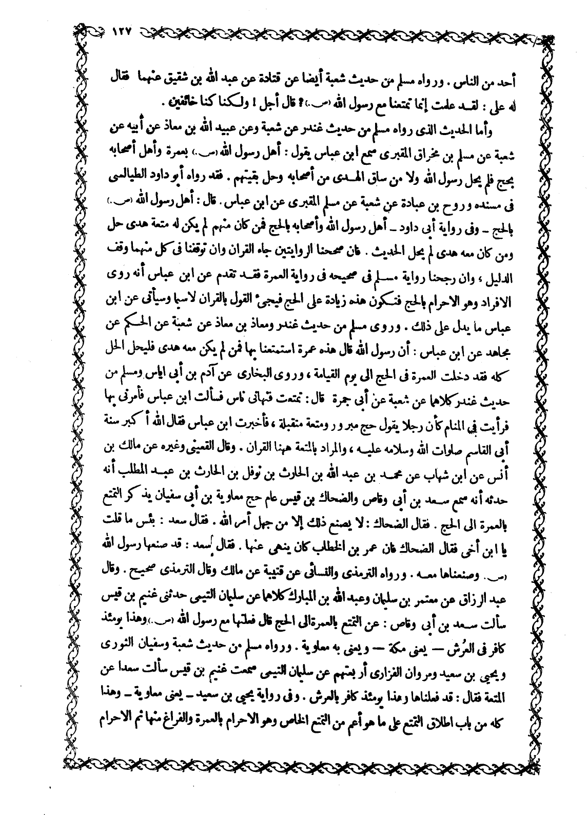 أحد من الناس. وَرَوَاهُ مُسْلِمٌ مِنْ حَدِيثِ شُعْبَةَ أَيْضًا عَنْ قَتَادَةَ عَنْ عَبْدِ اللَّهِ بْنِ شَقِيقٍ عَنْهُمَا فقال له على: لقد علمت إنما تَمَتَّعْنَا مَعَ رَسُولِ اللَّهِ صَلَّى اللَّهُ عَلَيْهِ وَسَلَّمَ؟ قَالَ أَجَلْ! وَلَكِنَّا كُنَّا خَائِفِينَ. وَأَمَّا الْحَدِيثُ الَّذِي رَوَاهُ مُسْلِمٌ مِنْ حَدِيثِ غُنْدَرٍ عَنْ شُعْبَةَ وَعَنْ عُبَيْدِ اللَّهِ بْنِ مُعَاذٍ عَنْ أَبِيهِ عَنْ شُعْبَةَ عَنْ مُسْلِمِ بْنِ مخراق المقبري سَمِعَ ابْنَ عَبَّاسٍ يَقُولُ: أَهَلَّ رَسُولُ اللَّهِ صَلَّى اللَّهُ عَلَيْهِ وَسَلَّمَ بِعُمْرَةٍ وَأَهَلَّ أَصْحَابُهُ بحج فلم يحل رسول الله وَلَا مَنْ سَاقَ الْهَدْيَ مِنْ أَصْحَابِهِ وَحَلَّ بَقِيَّتُهُمْ. فَقَدْ رَوَاهُ أَبُو دَاوُدَ الطَّيَالِسِيُّ فِي مُسْنَدِهِ وَرَوْحُ بْنُ عُبَادَةَ عَنْ شُعْبَةَ عَنْ مسلم المقبري عَنِ ابْنِ عَبَّاسٍ. قَالَ: أَهَلَّ رَسُولُ اللَّهِ صَلَّى اللَّهُ عَلَيْهِ وَسَلَّمَ بِالْحَجِّ- وَفِي رِوَايَةِ أَبِي دَاوُدَ- أَهَلَّ رَسُولُ اللَّهِ وَأَصْحَابُهُ بِالْحَجِّ فَمَنْ كَانَ مِنْهُمْ لَمْ يَكُنْ لَهُ مُتْعَةُ هَدْيٍ حَلَّ وَمَنْ كَانَ مَعَهُ هَدْيٌ لَمْ يَحِلَّ الْحَدِيثَ. فَإِنْ صَحَّحْنَا الرِّوَايَتَيْنِ جَاءَ الْقِرَانُ وَإِنْ تَوَقَّفْنَا فِي كُلٍّ مِنْهُمَا وَقَفَ الدَّلِيلُ، وَإِنْ رَجَّحْنَا رِوَايَةَ مُسْلِمٍ فِي صَحِيحِهِ فِي رِوَايَةِ الْعُمْرَةِ فَقَدْ تَقَدَّمَ عَنِ ابْنِ عَبَّاسٍ أَنَّهُ رَوَى الْإِفْرَادَ وَهُوَ الْإِحْرَامُ بِالْحَجِّ فَتَكُونُ هَذِهِ زِيَادَةٌ عَلَى الْحَجِّ فَيَجِيءُ الْقَوْلُ بِالْقِرَانِ لَا سِيَّمَا وَسَيَأْتِي عَنِ ابْنِ عَبَّاسٍ مَا يَدُلُّ عَلَى ذَلِكَ. وَرَوَى مُسْلِمٌ مِنْ حَدِيثِ غُنْدَرٍ وَمُعَاذِ بْنِ مُعَاذٍ عَنْ شُعْبَةَ عَنِ الْحَكَمِ عَنْ مُجَاهِدٍ عَنِ ابْنِ عَبَّاسٍ: أَنَّ رَسُولَ اللَّهِ قَالَ هَذِهِ عُمْرَةٌ اسْتَمْتَعْنَا بِهَا فَمَنْ لَمْ يَكُنْ مَعَهُ هَدْيٌ فَلْيَحِلَّ الْحِلَّ كله فَقَدْ دَخَلَتِ الْعُمْرَةُ فِي الْحَجِّ إِلَى يَوْمِ الْقِيَامَةِ، وَرَوَى الْبُخَارِيُّ عَنْ آدَمَ بْنِ أَبِي إِيَاسٍ وَمُسْلِمٌ مِنْ حَدِيثِ غُنْدَرٍ كِلَاهُمَا عَنْ شُعْبَةَ عَنْ أَبِي جَمْرَةَ قَالَ: تَمَتَّعْتُ فَنَهَانِي نَاسٌ فَسَأَلْتُ ابْنَ عَبَّاسٍ فَأَمَرَنِي بِهَا فَرَأَيْتُ فِي الْمَنَامِ كَأَنَّ رَجُلًا يَقُولُ حَجٌّ مَبْرُورٌ وَمُتْعَةٌ مُتَقَبَّلَةٌ، فَأَخْبَرْتُ ابْنَ عَبَّاسٍ فَقَالَ اللَّهُ أَكْبَرُ سُنَّةُ أَبِي الْقَاسِمِ صَلَوَاتُ اللَّهِ وَسَلَامُهُ عليه، والمراد بالمتعة هاهنا القران. وقال القعيني وَغَيْرُهُ عَنْ مَالِكِ بْنِ أَنَسٍ عَنِ ابْنِ شِهَابٍ عَنْ مُحَمَّدِ بْنِ عَبْدِ اللَّهِ بْنِ الْحَارِثِ بْنِ نَوْفَلٍ بْنِ الْحَارِثِ بْنِ عَبْدِ الْمُطَّلِبِ أَنَّهُ حَدَّثَهُ أَنَّهُ سَمِعَ سَعْدَ بْنَ أَبِي وَقَّاصٍ وَالضَّحَّاكَ بْنَ قَيْسٍ عَامَ حَجَّ مُعَاوِيَةُ بْنُ أَبِي سُفْيَانَ يَذْكُرُ التَّمَتُّعَ بِالْعُمْرَةِ إِلَى الْحَجِّ. فَقَالَ الضَّحَّاكُ: لَا يَصْنَعُ ذَلِكَ إِلَّا مَنْ جَهِلَ أَمْرَ اللَّهِ. فَقَالَ سَعْدٌ: بِئْسَ مَا قُلْتَ يَا ابْنَ أَخِي فَقَالَ الضَّحَّاكُ فَإِنَّ عُمَرَ بْنَ الْخَطَّابِ كَانَ يَنْهَى عَنْهَا. فَقَالَ سَعْدٌ: قَدْ صَنَعَهَا رَسُولُ اللَّهِ صَلَّى اللَّهُ عَلَيْهِ وَسَلَّمَ وَصَنَعْنَاهَا مَعَهُ. وَرَوَاهُ التِّرْمِذِيُّ وَالنَّسَائِيُّ عَنْ قُتَيْبَةَ عَنْ مَالِكٍ وَقَالَ التِّرْمِذِيُّ صَحِيحٌ. وَقَالَ عَبْدُ الرَّزَّاقِ عَنْ مُعْتَمِرِ بْنِ سُلَيْمَانَ وَعَبْدِ اللَّهِ بْنِ الْمُبَارَكِ كِلَاهُمَا عَنْ سُلَيْمَانَ التَّيْمِيِّ حَدَّثَنِي غُنَيْمُ بْنُ قَيْسٍ سَأَلْتُ سَعْدَ بْنَ أَبِي وَق