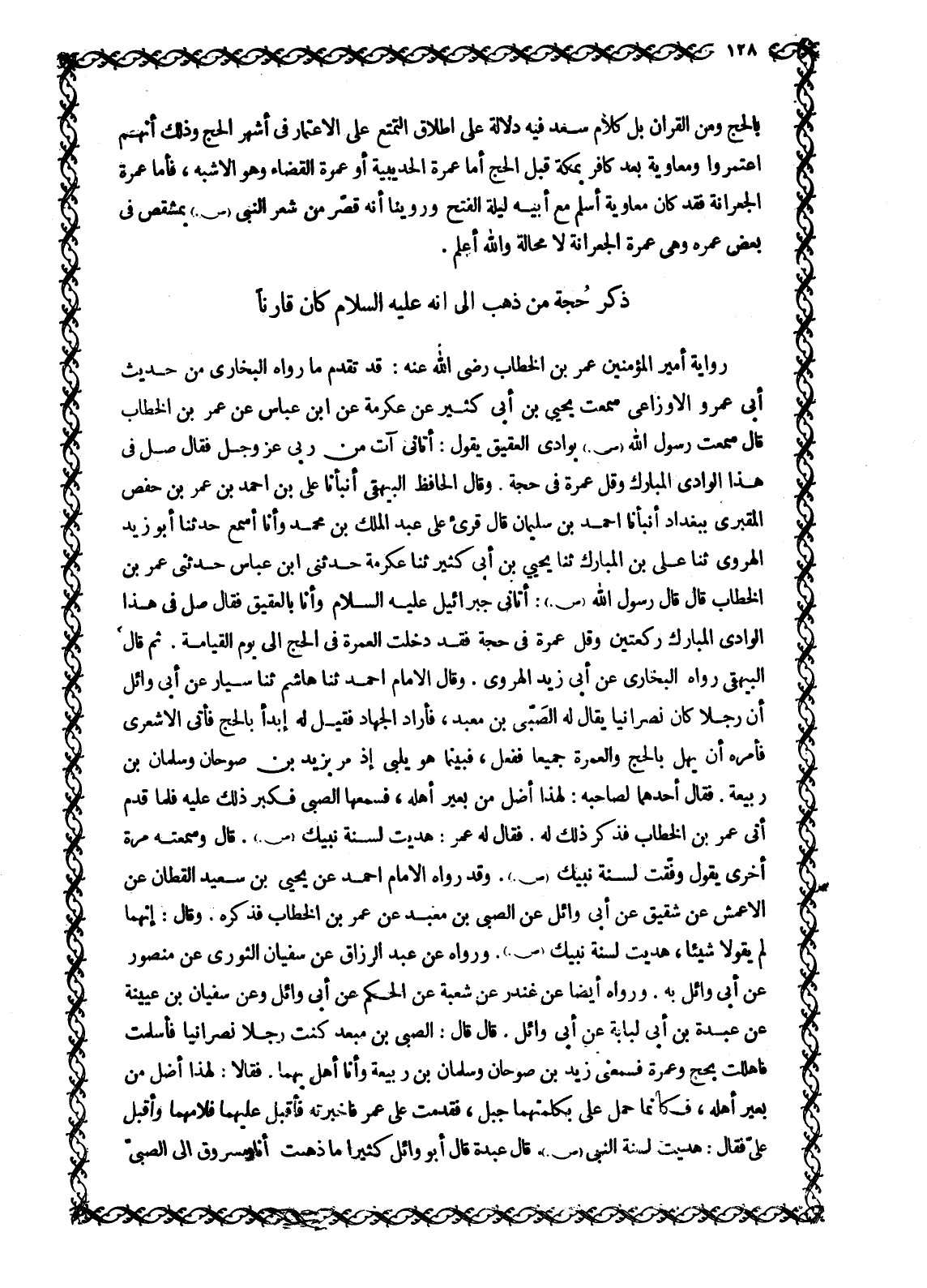 رِوَايَةُ أَمِيرِ الْمُؤْمِنِينَ عُمَرَ بْنِ الْخَطَّابِ رَضِيَ اللَّهُ عَنْهُ: قَدْ تَقَدَّمَ مَا رَوَاهُ الْبُخَارِيُّ مِنْ حَدِيثِ أَبِي عَمْرٍو الْأَوْزَاعِيِّ سَمِعْتُ يَحْيَى بْنَ أَبِي كَثِيرٍ عَنْ عِكْرِمَةَ عَنِ ابْنِ عَبَّاسٍ عَنْ عُمَرَ بْنِ الْخَطَّابِ قَالَ سَمِعْتُ رَسُولَ اللَّهِ صَلَّى اللَّهُ عَلَيْهِ وَسَلَّمَ بِوَادِي الْعَقِيقِ يَقُولُ: أَتَانِي آتٍ مِنْ رَبِّي عَزَّ وَجَلَّ فَقَالَ صَلِّ فِي هَذَا الْوَادِي الْمُبَارَكِ وَقُلْ عُمْرَةً فِي حَجَّةٍ. وَقَالَ الْحَافِظُ الْبَيْهَقِيُّ أَنْبَأَنَا عَلِيُّ بْنُ أَحْمَدَ بْنِ عُمَرَ بْنِ حَفْصٍ المقبري ببغداد أنبأنا احمد بن سليمان قَالَ قُرِئَ عَلَى عَبْدِ الْمَلِكِ بْنِ مُحَمَّدٍ وَأَنَا أَسْمَعُ حَدَّثَنَا أَبُو زَيْدٍ الْهَرَوِيُّ ثَنَا عَلِيُّ بْنُ الْمُبَارَكِ ثَنَا يَحْيَى بْنُ أَبِي كَثِيرٍ ثَنَا عِكْرِمَةُ حَدَّثَنِي ابْنُ عَبَّاسٍ حَدَّثَنِي عُمَرُ بْنُ الْخَطَّابِ قَالَ قَالَ رَسُولُ اللَّهِ صَلَّى اللَّهُ عَلَيْهِ وسلّم: أتانى جبرائيل عَلَيْهِ السَّلَامُ وَأَنَا بِالْعَقِيقِ فَقَالَ صَلِّ فِي هَذَا الْوَادِي الْمُبَارَكِ رَكْعَتَيْنِ وَقُلْ عُمْرَةً فِي حَجَّةٍ فَقَدْ دَخَلَتِ الْعُمْرَةُ فِي الْحَجِّ إِلَى يَوْمِ الْقِيَامَةِ. ثُمَّ قَالَ الْبَيْهَقِيُّ رَوَاهُ الْبُخَارِيُّ عَنْ أَبِي زَيْدٍ الْهَرَوِيِّ. وَقَالَ الْإِمَامُ أَحْمَدُ ثنا هاشم ثَنَا سَيَّارٌ عَنْ أَبِي وَائِلٍ أَنَّ رَجُلًا كَانَ نَصْرَانِيًّا يُقَالُ لَهُ الصُّبَيُّ بْنُ مَعْبَدٍ، فَأَرَادَ الْجِهَادَ فَقِيلَ لَهُ ابْدَأْ بِالْحَجِّ فَأَتَى الْأَشْعَرِيَّ فَأَمَرَهُ أَنْ يُهِلَّ بِالْحَجِّ وَالْعُمْرَةِ جَمِيعًا فَفَعَلَ، فَبَيْنَمَا هُوَ يُلَبِّي إِذْ مَرَّ بِزَيْدِ بْنِ صُوحَانَ وَسَلْمَانَ بْنِ رَبِيعَةَ. فَقَالَ أَحَدُهُمَا لِصَاحِبِهِ: لَهَذَا أَضَلُّ مِنْ بَعِيرِ أَهْلِهِ، فَسَمِعَهَا الصُّبَيُّ فَكَبُرَ ذَلِكَ عَلَيْهِ فَلَمَّا قَدِمَ أَتَى عُمَرَ بْنَ الْخَطَّابِ فَذَكَرَ ذَلِكَ لَهُ. فَقَالَ لَهُ عُمَرُ: هُدِيتَ لِسُنَّةِ نَبِيِّكَ صَلَّى اللَّهُ عَلَيْهِ وَسَلَّمَ. قَالَ وَسَمِعْتُهُ مَرَّةً أُخْرَى يَقُولُ وُفِّقْتَ لِسُنَّةِ نَبِيِّكَ صَلَّى اللَّهُ عَلَيْهِ وَسَلَّمَ. وَقَدْ رَوَاهُ الْإِمَامُ أَحْمَدُ عَنْ يَحْيَى بْنِ سَعِيدٍ الْقَطَّانِ عَنِ الْأَعْمَشِ عَنْ شَقِيقٍ عَنْ أَبِي وَائِلٍ عَنِ الصُّبَيِّ بْنِ مَعْبَدٍ عَنْ عُمَرَ بْنِ الْخَطَّابِ فَذَكَرَهُ. وَقَالَ: إِنَّهُمَا لَمْ يَقُولَا شَيْئًا، هُدِيتَ لِسُنَّةِ نَبِيِّكَ صَلَّى اللَّهُ عَلَيْهِ وَسَلَّمَ. وَرَوَاهُ عَنْ عَبْدِ الرَّزَّاقِ عَنْ سُفْيَانَ الثَّوْرِيِّ عَنْ مَنْصُورٍ عَنْ أَبِي وَائِلٍ بِهِ. وَرَوَاهُ أَيْضًا عَنْ غُنْدَرٍ عَنْ شُعْبَةَ عَنِ الْحَكَمِ عَنْ أَبِي وَائِلٍ وَعَنْ سُفْيَانَ بْنِ عُيَيْنَةَ عَنْ عَبْدَةَ بْنِ أَبِي لُبَابَةَ عَنْ أَبِي وَائِلٍ. قَالَ قَالَ: الصُّبَيُّ بْنُ مبعد كنت رجلا نصرانيا فأسلمت فأهلكت بِحَجٍّ وَعُمْرَةٍ فَسَمِعَنِي زَيْدُ بْنُ صُوحَانَ وَسَلْمَانُ بْنُ رَبِيعَةَ وَأَنَا أُهِلَّ بِهِمَا. فَقَالَا: لَهَذَا أَضَلُّ مِنْ بَعِيرِ أَهْلِهِ، فَكَأَنَّمَا حُمِّلَ عَلَيَّ بِكَلِمَتِهِمَا جَبَلٌ، فَقَدِمْتُ عَلَى عُمَرَ فَأَخْبَرْتُهُ فَأَقْبَلَ عَلَيْهِمَا فَلَامَهُمَا وَأَقْبَلَ عَلَيَّ فَقَالَ: هُدِيتَ لِسُنَّةِ النَّبِيِّ صَلَّى اللَّهُ عَلَيْهِ وَسَلَّمَ. قَالَ عَبْدَةُ قال أبو وائل كثيرا ما ذهبت وأنا مسروق الى الصبىّ