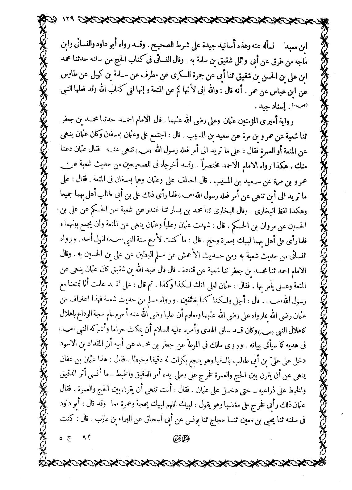 رِوَايَةُ أَمِيرَيِ الْمُؤْمِنِينَ عُثْمَانَ وَعَلِيٍّ رَضِيَ اللَّهُ عَنْهُمَا. قَالَ الْإِمَامُ أَحْمَدُ حَدَّثَنَا مُحَمَّدُ بْنُ جَعْفَرٍ ثَنَا شُعْبَةُ عَنْ عَمْرِو بْنِ مُرَّةَ عَنْ سَعِيدِ بْنِ الْمُسَيَّبِ. قَالَ: اجْتَمَعَ عَلِيٌّ وَعُثْمَانُ بِعُسْفَانَ وَكَانَ عُثْمَانُ يَنْهَى عَنِ الْمُتْعَةِ أَوِ الْعُمْرَةِ فَقَالَ: عَلِيٌّ مَا تُرِيدُ إِلَى أَمْرٍ فَعَلَهُ رَسُولُ اللَّهِ صَلَّى اللَّهُ عَلَيْهِ وَسَلَّمَ تَنْهَى عَنْهُ. فَقَالَ عُثْمَانُ دَعْنَا مِنْكَ. هَكَذَا رواه الامام الأحمد مُخْتَصَرًا. وَقَدْ أَخْرَجَاهُ فِي الصَّحِيحَيْنِ مِنْ حَدِيثِ شُعْبَةَ عَنْ عَمْرِو بْنِ مُرَّةَ عَنْ سَعِيدٍ بْنِ الْمُسَيَّبِ. قَالَ اخْتَلَفَ عَلِيٌّ وَعُثْمَانُ وَهُمَا بِعُسْفَانَ فِي الْمُتْعَةِ. فَقَالَ: عَلِيٌّ مَا تُرِيدُ الى أين تَنْهَى عَنْ أَمْرٍ فَعَلَهُ رَسُولُ اللَّهِ صَلَّى اللَّهُ عَلَيْهِ وَسَلَّمَ فَلَمَّا رَأَى ذَلِكَ عَلِيُّ بْنُ أَبِي طَالِبٍ أَهَلَّ بِهِمَا جَمِيعًا وَهَكَذَا لَفْظُ الْبُخَارِيِّ. وَقَالَ الْبُخَارِيُّ ثَنَا مُحَمَّدُ بْنُ يسار ثَنَا غُنْدَرٌ عَنْ شُعْبَةَ عَنِ الْحَكَمِ عَنْ عَلِيِّ بْنِ الْحُسَيْنِ عَنْ مَرْوَانَ بْنِ الْحَكَمِ. قَالَ: شَهِدْتُ عُثْمَانَ وَعَلِيًّا وَعُثْمَانُ يَنْهَى عَنِ الْمُتْعَةِ وَأَنْ يُجْمَعَ بَيْنَهُمَا، فَلَمَّا رَأَى عَلِيٌّ أَهَلَّ بِهِمَا لَبَّيْكَ بِعُمْرَةٍ وَحَجٍّ. قَالَ: مَا كُنْتُ لِأَدَعَ سُنَّةَ النَّبِيِّ صَلَّى اللَّهُ عَلَيْهِ وَسَلَّمَ لِقَوْلِ أَحَدٍ. وَرَوَاهُ النَّسَائِيُّ مِنْ حَدِيثِ شُعْبَةَ بِهِ وَمِنْ حَدِيثِ الْأَعْمَشِ عَنْ مُسْلِمٍ الْبَطِينِ عَنْ عَلِيِّ بْنِ الْحُسَيْنِ بِهِ. وَقَالَ الْإِمَامُ أَحْمَدُ ثَنَا مُحَمَّدُ بْنُ جَعْفَرٍ ثَنَا شُعْبَةُ عَنْ قَتَادَةَ. قَالَ قَالَ عَبْدُ اللَّهِ بْنُ شَقِيقٍ كَانَ عُثْمَانُ يَنْهَى عَنِ الْمُتْعَةِ وَعَلِيٌّ يَأْمُرُ بِهَا. فَقَالَ: عُثْمَانُ لِعَلِيٍّ إِنَّكَ لَكَذَا وَكَذَا. ثُمَّ قَالَ: عَلِيٌّ لَقَدْ عَلِمْتَ أَنَّا تَمَتَّعْنَا مَعَ رَسُولِ اللَّهِ صَلَّى اللَّهُ عَلَيْهِ وَسَلَّمَ. قَالَ: أَجَلْ وَلَكِنَّا كُنَّا خَائِفِينَ. وَرَوَاهُ مُسْلِمٌ مِنْ حَدِيثِ شُعْبَةَ فَهَذَا اعْتِرَافٌ من عثمان رضى الله بما رواه على رضى الله عنهما وَمَعْلُومٌ أَنَّ عَلِيًّا رَضِيَ اللَّهُ عَنْهُ أَحْرَمَ عَامَ حَجَّةِ الْوَدَاعِ بِإِهْلَالٍ كَإِهْلَالِ النَّبِيِّ صَلَّى اللَّهُ عَلَيْهِ وَسَلَّمَ وَكَانَ قَدْ سَاقَ الْهَدْيَ وأمره عليه السلام أَنْ يَمْكُثَ حَرَامًا وَأَشْرَكَهُ النَّبِيُّ صَلَّى اللَّهُ عَلَيْهِ وَسَلَّمَ فِي هَدْيِهِ كَمَا سَيَأْتِي بَيَانُهُ. وَرَوَى مَالِكٌ فِي الْمُوَطَّأِ عَنْ جَعْفَرِ بْنِ مُحَمَّدٍ عَنْ أَبِيهِ أَنَّ الْمِقْدَادَ بْنَ الْأَسْوَدِ دَخَلَ عَلَى عَلِيِّ بْنِ أَبِي طَالِبٍ بِالسُّقْيَا وَهُوَ يَنْجَعُ بَكَرَاتٍ لَهُ دَقِيقًا وَخَبَطًا فَقَالَ: هَذَا عُثْمَانُ بْنُ عَفَّانَ يَنْهَى عَنْ أَنْ يُقْرَنَ بَيْنَ الْحَجِّ وَالْعُمْرَةِ فَخَرَجَ عَلِيٌّ وَعَلَى يده أمر الدَّقِيقِ وَالْخَبَطِ- مَا أَنْسَى أَثَرَ الدَّقِيقِ وَالْخَبَطِ عَلَى ذِرَاعَيْهِ- حَتَّى دَخَلَ عَلَى عُثْمَانَ. فَقَالَ: أَنْتَ تَنْهَى أَنْ يُقْرَنَ بَيْنَ الْحَجِّ وَالْعُمْرَةِ. فَقَالَ عُثْمَانُ ذَلِكَ رَأْيِي فَخَرَجَ عَلِيٌّ مُغْضَبًا وَهُوَ يَقُولُ: لَبَّيْكَ اللَّهمّ لَبَّيْكَ بِحَجَّةٍ وَعُمْرَةٍ مَعًا. وَقَدْ قَالَ: أَبُو دَاوُدَ فِي سُنَنِهِ ثَنَا يَحْيَى بْنُ مَعِينٍ ثَنَا حَجَّاجٌ ثَنَا يُونُسُ عَنْ أَبِي إِسْحَاقَ عَنِ الْبَرَاءِ بْنِ عَازِبٍ. قال: كنت