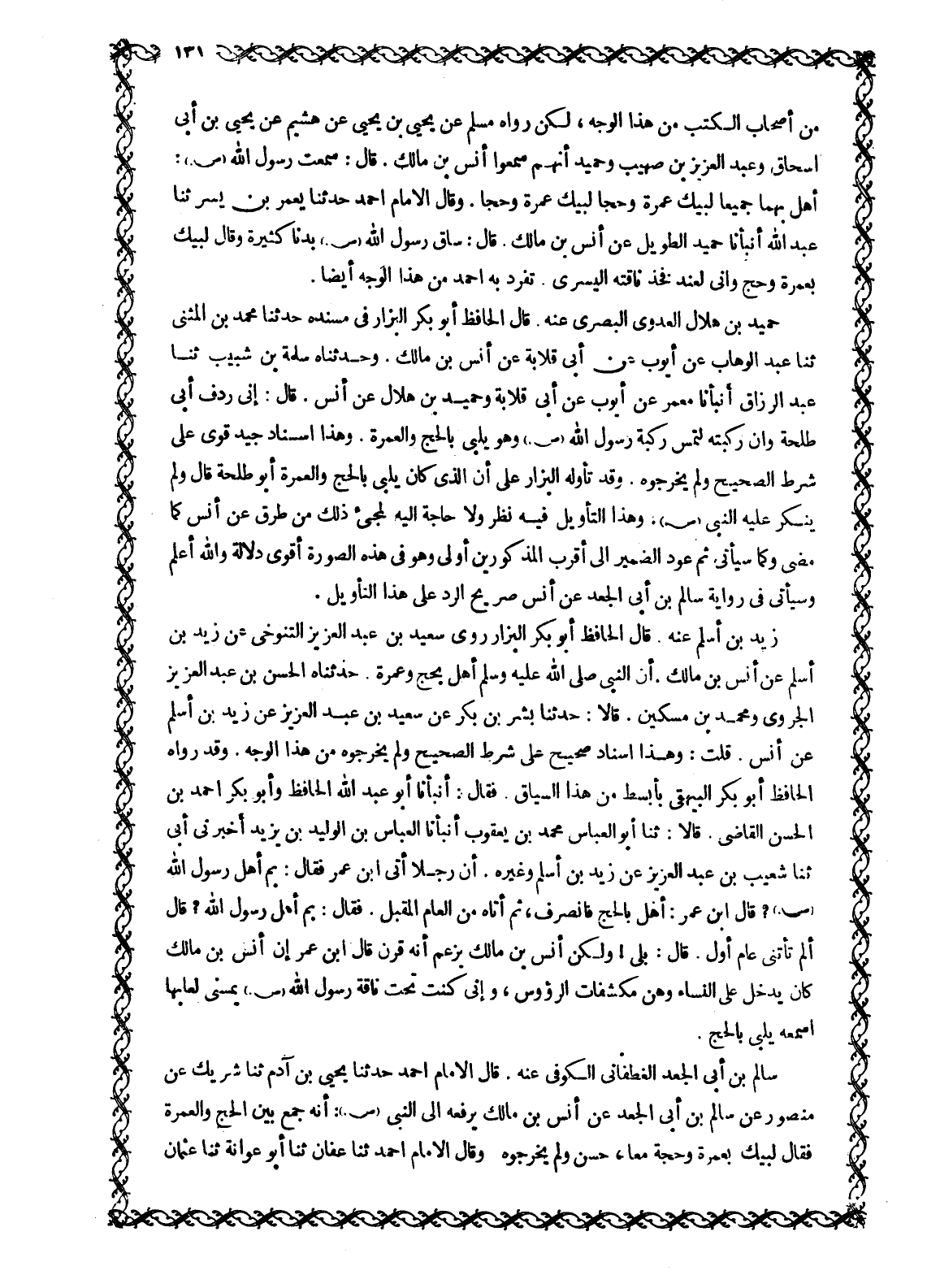 زَيْدُ بْنُ أَسْلَمَ عَنْهُ. قَالَ الْحَافِظُ أَبُو بَكْرٍ الْبَزَّارُ رَوَى سَعِيدُ بْنُ عَبْدِ الْعَزِيزِ التَّنُوخِيُّ عَنْ زَيْدِ بْنِ أَسْلَمَ عَنْ أَنَسِ بْنِ مَالِكٍ. أَنَّ النَّبِيَّ صَلَّى اللَّهُ عَلَيْهِ وَسَلَّمَ أَهَلَّ بِحَجٍّ وَعُمْرَةٍ. حَدَّثَنَاهُ الْحَسَنُ بْنُ عَبْدِ الْعَزِيزِ الْجَرَوِيُّ وَمُحَمَّدُ بْنُ مِسْكِينٍ. قَالَا: حَدَّثَنَا بِشْرُ بْنُ بَكْرٍ عَنْ سَعِيدِ بْنِ عَبْدِ الْعَزِيزِ عَنْ زَيْدِ بْنِ أَسْلَمَ عَنْ أَنَسٍ. قُلْتُ: وَهَذَا إِسْنَادٌ صَحِيحٌ عَلَى شَرْطِ الصَّحِيحِ وَلَمْ يُخْرِجُوهُ مِنْ هَذَا الْوَجْهِ. وَقَدْ رَوَاهُ الْحَافِظُ أَبُو بَكْرٍ الْبَيْهَقِيُّ بِأَبْسَطَ مِنْ هَذَا السِّيَاقِ. فَقَالَ: أَنْبَأَنَا أَبُو عَبْدِ اللَّهِ الْحَافِظُ وَأَبُو بَكْرٍ أَحْمَدُ بْنُ الْحَسَنِ الْقَاضِي. قَالَا: ثَنَا أَبُو الْعَبَّاسِ مُحَمَّدُ بْنُ يَعْقُوبَ أَنْبَأَنَا الْعَبَّاسُ بْنُ الوليد بن يزيد أخبرنى أبى ثنا شعيب بن عبد العزيز عن زيد بن أسلم وَغَيْرِهِ. أَنَّ رَجُلًا أَتَى ابْنَ عُمَرَ فَقَالَ: بِمَ أَهَلَّ رَسُولُ اللَّهِ صَلَّى اللَّهُ عَلَيْهِ وَسَلَّمَ؟ قَالَ ابْنُ عُمَرَ: أَهَلَّ بِالْحَجِّ فَانْصَرَفَ، ثُمَّ أَتَاهُ مِنَ الْعَامِ الْمُقْبِلِ. فَقَالَ: بِمَ أَهَلَّ رَسُولُ اللَّهِ؟ قَالَ أَلَمْ تَأْتِنِي عَامَ أَوَّلٍ. قَالَ: بَلَى! وَلَكِنَّ أَنَسَ بْنَ مَالِكٍ يَزْعُمُ أَنَّهُ قَرَنَ قَالَ ابْنُ عُمَرَ إِنَّ أَنَسَ بْنَ مَالِكٍ كَانَ يَدْخُلُ عَلَى النِّسَاءِ وَهُنَّ مُكَشِّفَاتُ الرُّءُوسِ، وَإِنِّي كُنْتُ تَحْتَ نَاقَةِ رَسُولِ اللَّهِ صَلَّى اللَّهُ عَلَيْهِ وَسَلَّمَ يَمَسُّنِي لُعَابُهَا أَسْمَعُهُ يُلَبِّي بِالْحَجِّ.