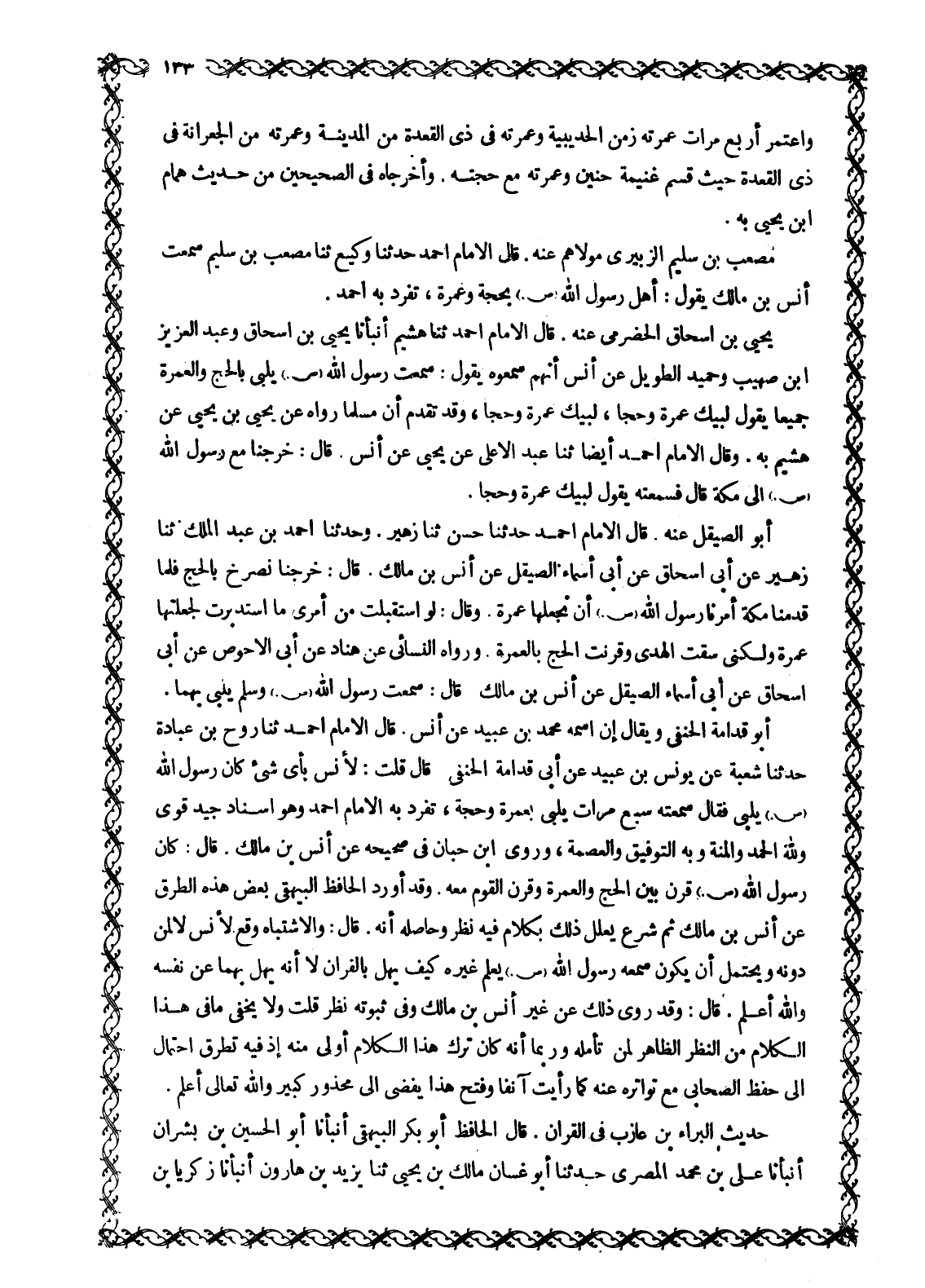 يَحْيَى بْنُ إِسْحَاقَ الْحَضْرَمِيُّ عَنْهُ. قَالَ الْإِمَامُ أَحْمَدُ ثنا هشيم أنبأنا يحيى بن إسحاق وعبد العزيز ابن صُهَيْبٍ وَحُمَيْدٌ الطَّوِيلُ عَنْ أَنَسٍ أَنَّهُمْ سَمِعُوهُ يَقُولُ: سَمِعْتُ رَسُولَ اللَّهِ صَلَّى اللَّهُ عَلَيْهِ وَسَلَّمَ يُلَبِّي بِالْحَجِّ وَالْعُمْرَةِ جَمِيعًا يَقُولُ لَبَّيْكَ عُمْرَةً وَحَجًّا، لَبَّيْكَ عُمْرَةً وَحَجًّا، وَقَدْ تَقَدَّمَ أَنَّ مُسْلِمًا رَوَاهُ عَنْ يَحْيَى بْنِ يَحْيَى عَنْ هُشَيْمٍ بِهِ. وَقَالَ الْإِمَامُ أَحْمَدُ أَيْضًا ثَنَا عَبْدُ الْأَعْلَى عَنْ يَحْيَى عَنْ أَنَسٍ. قَالَ: خَرَجْنَا مَعَ رَسُولِ اللَّهِ صَلَّى اللَّهُ عَلَيْهِ وَسَلَّمَ إِلَى مَكَّةَ قَالَ فَسَمِعْتُهُ يَقُولُ لبيك عمرة وحجا. أبو الصَّيْقَلُ عَنْهُ. قَالَ الْإِمَامُ أَحْمَدُ حَدَّثَنَا حَسَنٌ ثَنَا زُهَيْرٌ. وَحَدَّثَنَا أَحْمَدُ بْنُ عَبْدِ الْمَلِكِ ثَنَا زُهَيْرٌ عَنْ أَبِي إِسْحَاقَ عَنْ أَبِي أَسْمَاءَ الصَّيْقَلِ عَنْ أَنَسِ بْنِ مَالِكٍ. قَالَ: خَرَجْنَا نَصْرُخُ بِالْحَجِّ فَلَمَّا قَدِمْنَا مَكَّةَ أَمَرَنَا رَسُولُ اللَّهِ صَلَّى اللَّهُ عَلَيْهِ وَسَلَّمَ إِنَّ نَجْعَلَهَا عُمْرَةً. وَقَالَ: لَوِ اسْتَقْبَلْتُ مِنْ أَمْرِي مَا اسْتَدْبَرْتُ لَجَعَلْتُهَا عُمْرَةً وَلَكِنِّي سُقْتُ الْهَدْيَ وَقَرَنْتُ الْحَجَّ بِالْعُمْرَةِ. وَرَوَاهُ النَّسَائِيُّ عَنْ هَنَّادٍ عَنْ أَبِي الْأَحْوَصِ عَنْ أَبِي إِسْحَاقَ عَنْ أَبِي أَسْمَاءَ الصَّيْقَلِ عَنْ أَنَسِ بْنِ مَالِكٍ. قَالَ: سَمِعْتُ رَسُولَ اللَّهِ صَلَّى اللَّهُ عَلَيْهِ وَسَلَّمَ وَسَلَّمَ يُلَبِّي بِهِمَا. أَبُو قُدَامَةَ الْحَنَفِيُّ وَيُقَالُ إِنَّ اسْمَهُ مُحَمَّدُ بْنُ عُبَيْدٍ عَنْ أَنَسٍ. قَالَ الْإِمَامُ أَحْمَدُ ثَنَا رَوْحُ بْنُ عُبَادَةَ حَدَّثَنَا شُعْبَةُ عَنْ يُونُسَ بْنِ عُبَيْدٍ عَنْ أَبِي قُدَامَةَ الْحَنَفِيِّ. قَالَ قُلْتُ: لِأَنَسٍ بِأَيِّ شَيْءٍ كَانَ رَسُولُ اللَّهِ صَلَّى اللَّهُ عَلَيْهِ وَسَلَّمَ يُلَبِّي فَقَالَ سَمِعْتُهُ سَبْعَ مَرَّاتٍ يلبى بِعُمْرَةٍ وَحَجَّةٍ، تَفَرَّدَ بِهِ الْإِمَامُ أَحْمَدُ وَهُوَ إِسْنَادٌ جَيِّدٌ قَوِيٌّ وللَّه الْحَمْدُ وَالْمِنَّةُ وَبِهِ التَّوْفِيقُ وَالْعِصْمَةُ، وَرَوَى ابْنُ حِبَّانَ فِي صَحِيحِهِ عَنْ أَنَسِ بْنِ مَالِكٍ. قَالَ: كَانَ رَسُولُ اللَّهِ صَلَّى اللَّهُ عَلَيْهِ وَسَلَّمَ قَرَنَ بَيْنَ الْحَجِّ وَالْعُمْرَةِ وَقَرَنَ الْقَوْمُ مَعَهُ. وَقَدْ أَوْرَدَ الْحَافِظُ الْبَيْهَقِيُّ بَعْضَ هَذِهِ الطُّرُقِ عَنْ أَنَسِ بْنِ مَالِكٍ ثُمَّ شَرَعَ يُعَلِّلُ ذَلِكَ بِكَلَامٍ فِيهِ نَظَرٌ وَحَاصِلُهُ أَنَّهُ. قَالَ: وَالِاشْتِبَاهُ وَقَعَ لِأَنَسٍ لَا لِمَنْ دُونَهُ وَيُحْتَمَلُ أَنْ يَكُونَ سَمِعَهُ رَسُولُ اللَّهِ صَلَّى اللَّهُ عَلَيْهِ وَسَلَّمَ يُعَلِّمُ غَيْرَهُ كَيْفَ يُهِلُّ بِالْقِرَانِ لَا أَنَّهُ يُهِلُّ بِهِمَا عَنْ نَفْسِهِ وَاللَّهُ أَعْلَمُ. قَالَ: وَقَدْ رُوِيَ ذَلِكَ عَنْ غَيْرِ أَنَسِ بْنِ مَالِكٍ وَفِي ثُبُوتِهِ نَظَرٌ قُلْتُ وَلَا يَخْفَى مَا فِي هَذَا الْكَلَامِ مِنَ النَّظَرِ الظَّاهِرِ لِمَنْ تَأَمَّلَهُ وَرُبَّمَا أنه كَانَ تَرْكُ هَذَا الْكَلَامِ أَوْلَى مِنْهُ إِذْ فِيهِ تَطَرُّقُ احْتِمَالٍ إِلَى حِفْظِ الصَّحَابِيِّ مَعَ تَوَاتُرِهِ عَنْهُ كَمَا رَأَيْتَ آنِفًا وَفَتْحُ هَذَا يُفْضِي إِلَى مَحْذُورٍ كَبِيرٍ وَاللَّهُ تَعَالَى أَعْلَمُ.