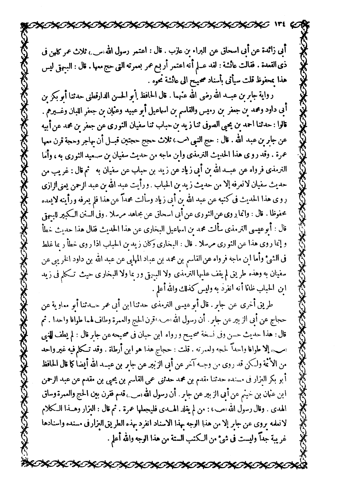 قَالُوا: حَدَّثَنَا أَحْمَدُ بْنُ يَحْيَى الصُّوفِيُّ ثَنَا زيد بن حباب ثَنَا سُفْيَانُ الثَّوْرِيُّ عَنْ جَعْفَرِ بْنِ مُحَمَّدٍ عَنْ أَبِيهِ عَنْ جَابِرِ بْنِ عَبْدِ اللَّهِ. قَالَ: حَجَّ النَّبِيُّ صَلَّى اللَّهُ عَلَيْهِ وَسَلَّمَ ثَلَاثَ حِجَجٍ حَجَّتَيْنِ قَبْلَ أَنْ يُهَاجِرَ وَحَجَّةٌ قَرَنَ مَعَهَا عُمْرَةً. وَقَدْ رَوَى هَذَا الْحَدِيثَ التِّرْمِذِيُّ وَابْنُ مَاجَهْ مِنْ حَدِيثِ سُفْيَانَ بْنِ سعيد الثوري به، وأما التِّرْمِذِيُّ فَرَوَاهُ عَنْ عَبْدِ اللَّهِ بْنِ أَبِي زِيَادٍ عَنْ زيد بن حباب عَنْ سُفْيَانَ بِهِ ثُمَّ قَالَ: غَرِيبٌ مِنْ حَدِيثِ سُفْيَانَ لَا نَعْرِفُهُ إِلَّا مِنْ حَدِيثِ زَيْدِ بْنِ الْحُبَابِ. وَرَأَيْتُ عَبْدَ اللَّهِ بْنَ عبد الرحمن يعنى الرازيّ رَوَى هَذَا الْحَدِيثَ فِي كُتُبِهِ عَنْ عَبْدِ اللَّهِ بْنِ أَبِي زِيَادٍ وَسَأَلْتُ مُحَمَّدًا عَنْ هَذَا فَلَمْ يَعْرِفْهُ وَرَأَيْتُهُ لَا يَعُدُّهُ مَحْفُوظًا. قَالَ: وَإِنَّمَا رُوِيَ عَنِ الثَّوْرِيِّ عَنْ أَبِي إِسْحَاقَ عَنْ مُجَاهِدٍ مُرْسَلًا. وَفِي السُّنَنِ الْكَبِيرِ لِلْبَيْهَقِيِّ قَالَ: أَبُو عِيسَى التِّرْمِذِيُّ سَأَلْتُ مُحَمَّدَ بْنَ إِسْمَاعِيلَ الْبُخَارِيَّ عَنْ هَذَا الْحَدِيثِ فَقَالَ هَذَا حَدِيثٌ خَطَأٌ وَإِنَّمَا رُوِيَ هَذَا عَنِ الثَّوْرِيِّ مُرْسَلًا. قَالَ: الْبُخَارِيُّ وَكَانَ زَيْدُ بْنُ الحباب إذا روى خطأ رُبَّمَا غَلَطَ فِي الشَّيْءِ وَأَمَّا ابْنُ مَاجَهْ فَرَوَاهُ عَنِ الْقَاسِمِ بْنِ مُحَمَّدِ بْنِ عَبَّادٍ الْمُهَلَّبِيِّ عَنْ عَبْدِ اللَّهِ بْنِ دَاوُدَ الْخُرَيْبِيِّ عَنْ سُفْيَانَ بِهِ وَهَذِهِ طَرِيقٌ لَمْ يَقِفْ عَلَيْهَا التِّرْمِذِيُّ وَلَا الْبَيْهَقِيُّ وَرُبَّمَا وَلَا الْبُخَارِيُّ حيث تكلم في زيد ابن الْحُبَابِ ظَانًّا أَنَّهُ انْفَرَدَ بِهِ وَلَيْسَ كَذَلِكَ وَاللَّهُ أَعْلَمُ.