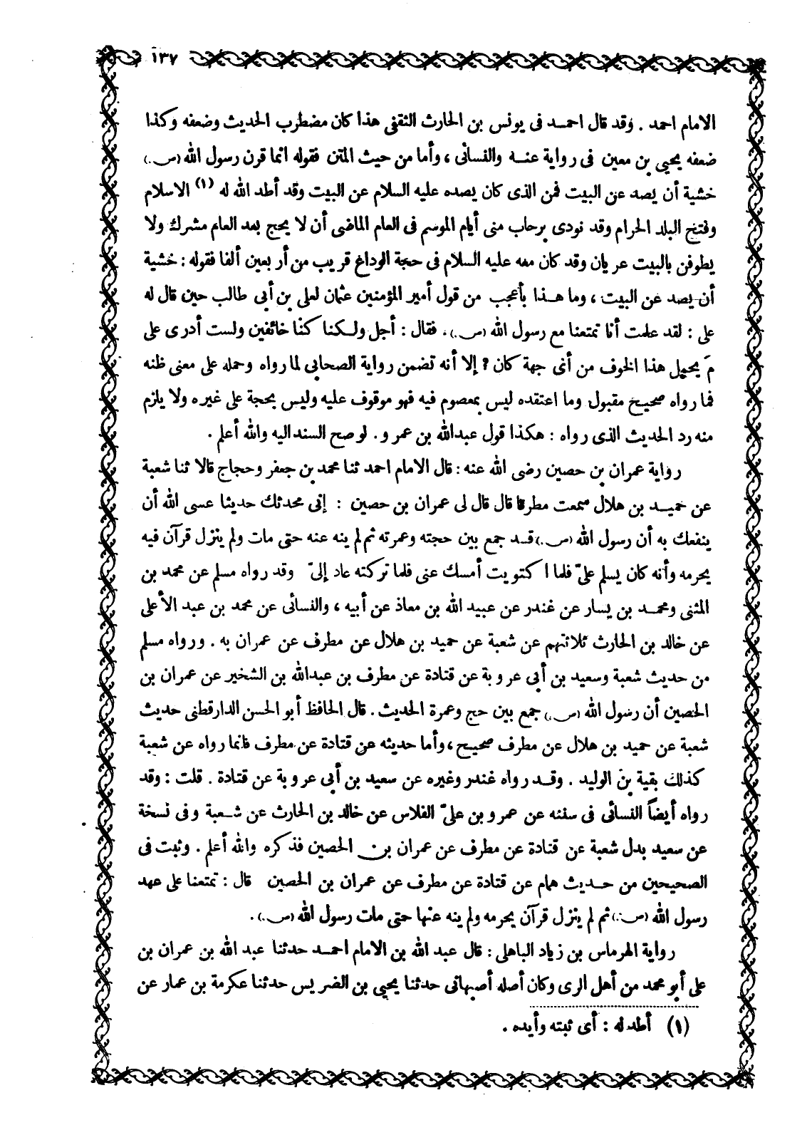 رِوَايَةُ عِمْرَانِ بْنِ حُصَيْنٍ رَضِيَ اللَّهُ عَنْهُ: قَالَ الْإِمَامُ أَحْمَدُ ثَنَا مُحَمَّدُ بْنُ جَعْفَرٍ وَحَجَّاجٌ قَالَا ثَنَا شُعْبَةُ عَنْ حُمَيْدِ بْنِ هِلَالٍ سَمِعْتُ مُطَرِّفًا قَالَ قَالَ لِي عِمْرَانُ بْنُ حُصَيْنٍ: إِنِّي مُحَدِّثُكَ حَدِيثًا عَسَى اللَّهُ أَنْ يَنْفَعَكَ بِهِ أَنَّ رَسُولَ اللَّهِ صَلَّى اللَّهُ عَلَيْهِ وَسَلَّمَ قد جمع بين حجته وعمرته ثُمَّ لَمْ يَنْهَ عَنْهُ حَتَّى مَاتَ وَلَمْ يَنْزِلْ قُرْآنٌ فِيهِ يُحَرِّمُهُ وَإِنَّهُ كَانَ يُسَلِّمُ عَلَيَّ فَلَمَّا اكْتَوَيْتُ أَمْسَكَ عَنِّي فَلَمَّا تَرَكْتُهُ عَادَ إِلَيَّ. وَقَدْ رَوَاهُ مُسْلِمٌ عَنْ مُحَمَّدِ بْنِ الْمُثَنَّى ومحمد بن يسار عن غندر عَنْ عُبَيْدِ اللَّهِ بْنِ مُعَاذٍ عَنْ أَبِيهِ، وَالنَّسَائِيُّ عَنْ مُحَمَّدِ بْنِ عَبْدِ الْأَعْلَى عَنْ خَالِدِ بْنِ الْحَارِثِ ثَلَاثَتُهُمْ عَنْ شُعْبَةَ عَنْ حُمَيْدِ بْنِ هِلَالٍ عَنْ مُطَرِّفٍ عَنْ عِمْرَانَ بِهِ. وَرَوَاهُ مُسْلِمٌ مِنْ حَدِيثِ شُعْبَةَ وَسَعِيدُ بْنُ أَبِي عَرُوبَةَ عَنْ قَتَادَةَ عَنِ مُطَرِّفِ بْنِ عَبْدِ اللَّهِ بْنِ الشِّخِّيرِ عَنْ عِمْرَانَ بْنِ الْحُصَيْنِ أَنَّ رَسُولَ اللَّهِ صَلَّى اللَّهُ عَلَيْهِ وَسَلَّمَ جَمَعَ بَيْنَ حَجٍّ وَعُمْرَةٍ الْحَدِيثَ. قَالَ الحافظ أبو الحسن الدار قطنى حَدِيثُ شُعْبَةَ عَنْ حُمَيْدِ بْنِ هِلَالٍ عَنْ مُطَرِّفٍ صَحِيحٌ، وَأَمَّا حَدِيثُهُ عَنْ قَتَادَةَ عَنْ مُطَرِّفٍ فَإِنَّمَا رَوَاهُ عَنْ شُعْبَةَ كَذَلِكَ بَقِيَّةُ بْنُ الْوَلِيدِ. وَقَدْ رَوَاهُ غُنْدَرٌ وَغَيْرُهُ عَنْ سَعِيدِ بْنِ أَبِي عَرُوبَةَ عَنْ قَتَادَةَ. قُلْتُ: وَقَدْ رَوَاهُ أَيْضًا النَّسَائِيُّ فِي سُنَنِهِ عَنْ عَمْرِو بْنِ عَلِيٍّ الْفَلَّاسِ عَنْ خَالِدِ بْنِ الْحَارِثِ عَنْ شُعْبَةَ وَفِي نُسْخَةٍ عَنْ سَعِيدٍ بَدَلَ شُعْبَةَ عَنْ قَتَادَةَ عَنْ مُطَرِّفٍ عَنْ عِمْرَانَ بْنِ الْحُصَيْنِ فَذَكَرَهُ وَاللَّهُ أَعْلَمُ. وَثَبَتَ فِي الصَّحِيحَيْنِ مِنْ حَدِيثِ هَمَّامٍ عَنْ قَتَادَةَ عَنْ مُطَرِّفٍ عَنْ عِمْرَانَ بْنِ الْحُصَيْنِ قَالَ: تَمَتَّعْنَا عَلَى عَهْدِ رَسُولُ اللَّهِ صَلَّى اللَّهُ عَلَيْهِ وَسَلَّمَ ثُمَّ لَمْ يَنْزِلْ قُرْآنٌ يُحَرِّمُهُ وَلَمْ يُنْهَ عَنْهَا حَتَّى مَاتَ رَسُولُ اللَّهِ صَلَّى اللَّهُ عَلَيْهِ وَسَلَّمَ. رِوَايَةُ الْهِرْمَاسِ بْنِ زِيَادٍ الْبَاهِلِيِّ: قَالَ عَبْدُ اللَّهِ بْنُ الْإِمَامِ أَحْمَدَ حَدَّثَنَا عَبْدُ اللَّهِ بْنُ عِمْرَانَ بْنِ عَلِيٍّ أَبُو مُحَمَّدٍ مِنْ أَهْلِ الرَّيِّ وَكَانَ أصله أصبهانيّ حَدَّثَنَا يَحْيَى بْنُ الضُّرَيْسِ حَدَّثَنَا عِكْرِمَةُ بْنُ عمار عن
