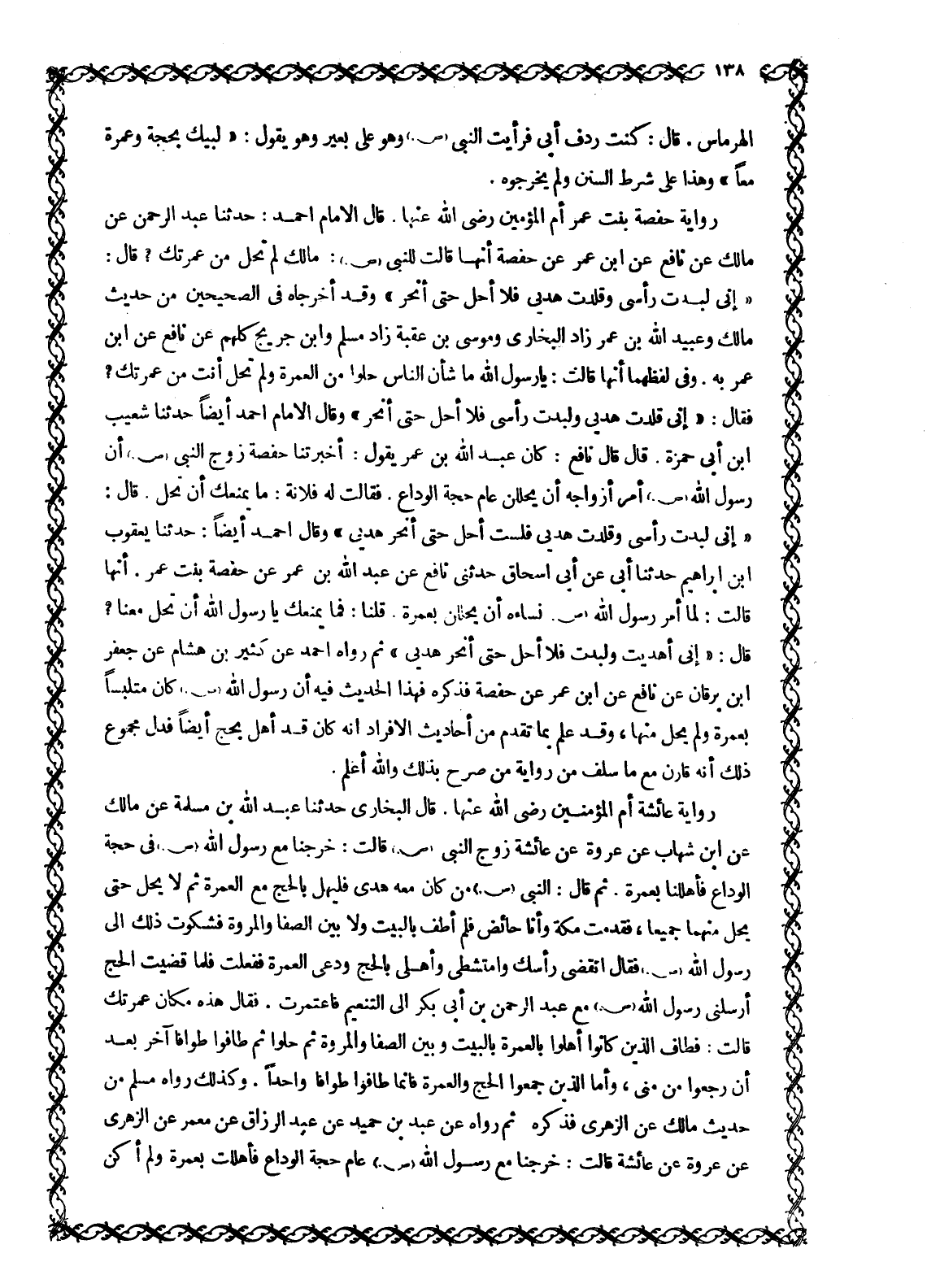 «إِنِّي لَبَّدْتُ رَأْسِي وَقَلَّدْتُ هَدْيِي فَلَسْتُ أُحِلُّ حَتَّى أَنْحَرَ هَدْيِي» وَقَالَ أَحْمَدُ أَيْضًا: حَدَّثَنَا يَعْقُوبُ ابن إبراهيم حدثنا أبى عن أبى إِسْحَاقَ حَدَّثَنِي نَافِعٌ عَنْ عَبْدِ اللَّهِ بْنِ عُمَرَ عَنْ حَفْصَةَ بِنْتِ عُمَرَ. أَنَّهَا قَالَتْ: لَمَّا أَمَرَ رَسُولُ اللَّهِ صَلَّى اللَّهُ عَلَيْهِ وَسَلَّمَ نِسَاءَهُ أَنْ يَحْلِلْنَ بِعُمْرَةٍ. قُلْنَا: فَمَا يَمْنَعُكَ يَا رَسُولَ اللَّهِ أَنْ تَحِلَّ مَعَنَا؟