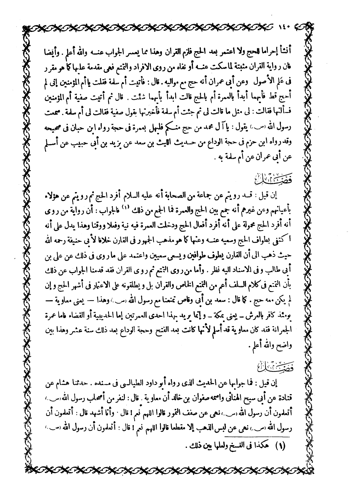 أَنْشَأَ إِحْرَامًا لِلْحَجِّ وَلَا اعْتَمَرَ بَعْدَ الْحَجِّ فَلَزِمَ الْقِرَانُ وَهَذَا مِمَّا يَعْسُرُ الْجَوَابُ عَنْهُ وَاللَّهُ أَعْلَمُ. وَأَيْضًا فَإِنَّ رِوَايَةَ الْقِرَانِ مُثْبِتَةٌ لِمَا سَكَتَ عَنْهُ أَوْ نَفَاهُ مَنْ رَوَى الْإِفْرَادَ وَالتَّمَتُّعَ فَهِيَ مُقَدَّمَةٌ عَلَيْهَا كَمَا هُوَ مُقَرَّرٌ فِي عِلْمِ الْأُصُولِ وَعَنْ أَبِي عِمْرَانَ أَنَّهُ حَجَّ مَعَ مَوَالِيهِ. قَالَ: فَأَتَيْتُ أُمَّ سَلَمَةَ فَقُلْتُ يَا أُمَّ الْمُؤْمِنِينَ إِنِّي لَمْ أحج قط فأيهما أَبْدَأُ بِالْعُمْرَةِ أَمْ بِالْحَجِّ قَالَتْ ابْدَأْ بِأَيِّهِمَا شِئْتَ. قَالَ ثُمَّ أَتَيْتُ صَفِيَّةَ أُمَّ الْمُؤْمِنِينَ فسألنها فقالت: لي مثل ما قالت لي ثُمَّ جِئْتُ أُمَّ سَلَمَةَ فَأَخْبَرْتُهَا بِقَوْلِ صَفِيَّةَ فَقَالَتْ لِي أُمُّ سَلَمَةَ. سَمِعْتُ رَسُولَ اللَّهِ صَلَّى اللَّهُ عَلَيْهِ وَسَلَّمَ يَقُولُ: يَا آلَ مُحَمَّدٍ مَنْ حَجَّ مِنْكُمْ فَلْيُهِلَّ بِعُمْرَةٍ فِي حَجَّةٍ رَوَاهُ ابْنُ حِبَّانَ فِي صَحِيحِهِ وَقَدْ رَوَاهُ ابْنُ حَزْمٍ فِي حَجَّةِ الْوَدَاعِ مِنْ حَدِيثِ اللَّيْثِ بْنِ سَعْدٍ عَنْ يَزِيدَ بْنِ أَبِي حَبِيبٍ عَنْ أَسْلَمَ عَنْ أَبِي عِمْرَانَ عن أم سلمة به.