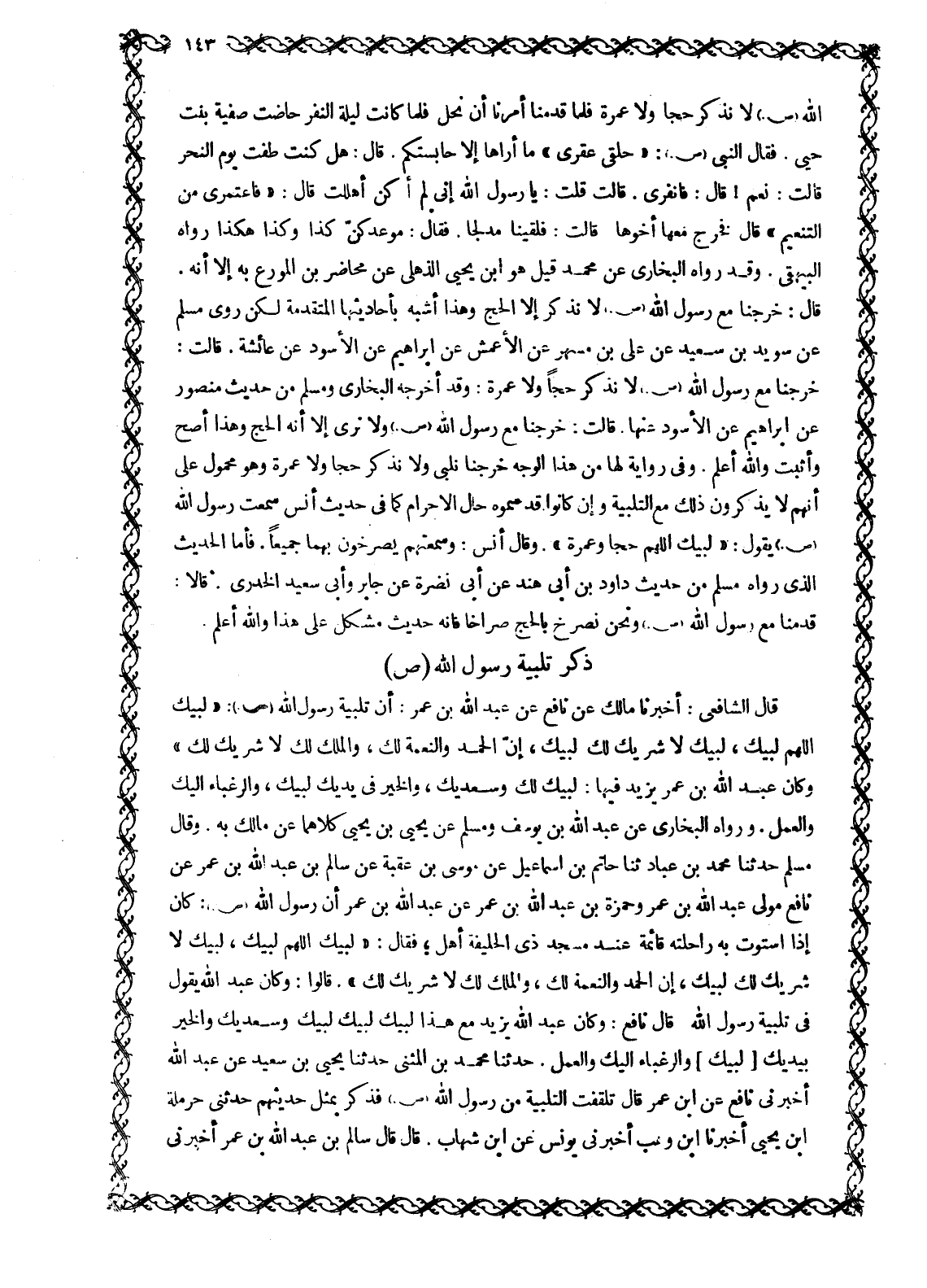 قَالَ الشَّافِعِيُّ: أَخْبَرَنَا مَالِكٌ عَنْ نَافِعٍ عَنْ عَبْدِ اللَّهِ بْنِ عُمَرَ: أَنَّ تَلْبِيَةَ رَسُولِ اللَّهِ صَلَّى اللَّهُ عَلَيْهِ وَسَلَّمَ: «لَبَّيْكَ اللَّهمّ لَبَّيْكَ، لَبَّيْكَ لَا شَرِيكَ لَكَ لَبَّيْكَ، إِنَّ الْحَمْدَ وَالنِّعْمَةَ لَكَ، وَالْمُلْكَ لك لَا شَرِيكَ لَكَ» وَكَانَ عَبْدُ اللَّهِ بْنُ عمر يزيد فيها: لبيك لك وَسَعْدَيْكَ، وَالْخَيْرُ فِي يَدَيْكَ لَبَّيْكَ، وَالرَّغْبَاءُ إِلَيْكَ وَالْعَمَلُ. وَرَوَاهُ الْبُخَارِيُّ عَنْ عَبْدِ اللَّهِ بْنِ يُوسُفَ وَمُسْلِمٌ عَنْ يَحْيَى بْنِ يَحْيَى كِلَاهُمَا عَنْ مَالِكٍ بِهِ. وَقَالَ مُسْلِمٌ حَدَّثَنَا مُحَمَّدُ بْنُ عَبَّادٍ ثَنَا حَاتِمُ بْنُ إِسْمَاعِيلَ عَنْ مُوسَى بْنِ عُقْبَةَ عَنْ سَالِمِ بْنِ عَبْدِ اللَّهِ بْنِ عُمَرَ عن نافع مولى عبد الله بن عمرو حَمْزَةَ بْنِ عَبْدِ اللَّهِ بْنِ عُمَرَ عَنْ عَبْدِ اللَّهِ بْنِ عُمَرَ أَنَّ رَسُولَ اللَّهِ صَلَّى اللَّهُ عَلَيْهِ وَسَلَّمَ: كَانَ إِذَا اسْتَوَتْ بِهِ رَاحِلَتُهُ قَائِمَةً عِنْدَ مَسْجِدِ ذِي الْحُلَيْفَةِ أَهَلَّ، فَقَالَ: «لَبَّيْكَ اللَّهمّ لَبَّيْكَ، لَبَّيْكَ لَا شَرِيكَ لَكَ لَبَّيْكَ، إِنَّ الْحَمْدَ وَالنِّعْمَةَ لَكَ، والملك لك لَا شَرِيكَ لَكَ» . قَالُوا: وَكَانَ عَبْدُ اللَّهِ يقول في تلبية رسول الله. قَالَ نَافِعٌ: وَكَانَ عَبْدُ اللَّهِ يَزِيدُ مَعَ هَذَا لَبَّيْكَ لَبَّيْكَ لَبَّيْكَ وَسَعْدَيْكَ وَالْخَيْرُ بِيَدَيْكَ [لَبَّيْكَ] وَالرَّغْبَاءُ إِلَيْكَ وَالْعَمَلُ. حَدَّثَنَا مُحَمَّدُ بْنُ الْمُثَنَّى حَدَّثَنَا يَحْيَى بْنُ سعيد عن عبد اللَّهِ أَخْبَرَنِي نَافِعٌ عَنِ ابْنِ عُمَرَ قَالَ تلقفت التلبية مِنْ رَسُولِ اللَّهِ صَلَّى اللَّهُ عَلَيْهِ وَسَلَّمَ فذكر بمثل حديثهم حدثني حرملة ابن يَحْيَى أَخْبَرَنَا ابْنُ وَهْبٍ أَخْبَرَنِي يُونُسُ عَنِ ابْنِ شِهَابٍ. قال قال سَالِمَ بْنَ عَبْدِ اللَّهِ بْنِ عُمَرَ أَخْبَرَنِي