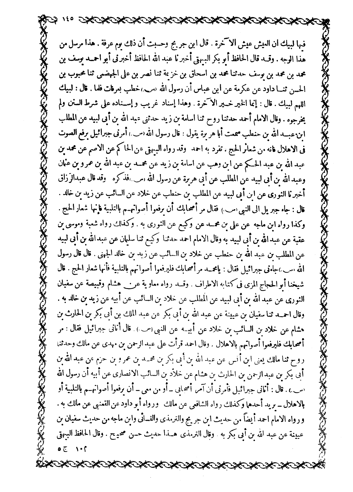 فِيهَا لَبَّيْكَ إِنَّ الْعَيْشَ عَيْشُ الْآخِرَةِ. قَالَ ابْنُ جُرَيْجٍ وَحَسِبْتُ أَنَّ ذَلِكَ يَوْمَ عَرَفَةَ. هَذَا مُرْسَلٌ مِنْ هَذَا الْوَجْهِ. وَقَدْ قَالَ الْحَافِظُ أَبُو بَكْرٍ الْبَيْهَقِيُّ أَخْبَرَنَا عَبْدُ اللَّهِ الْحَافِظُ أَخْبَرَنِي أَبُو أَحْمَدَ يُوسُفُ بْنُ مُحَمَّدِ بْنِ مُحَمَّدِ بْنِ يُوسُفَ حَدَّثَنَا مُحَمَّدُ بْنُ إِسْحَاقَ بْنِ خُزَيْمَةَ ثَنَا نَصْرُ بْنُ عَلِيٍّ الْجَهْضَمِيُّ ثَنَا مَحْبُوبُ بْنُ الْحَسَنِ ثَنَا دَاوُدُ عَنْ عِكْرِمَةَ عَنِ ابْنِ عَبَّاسٍ أَنَّ رَسُولَ اللَّهِ صَلَّى اللَّهُ عَلَيْهِ وَسَلَّمَ خَطَبَ بِعَرَفَاتٍ فَلَمَّا. قَالَ: لَبَّيْكَ اللَّهمّ لَبَّيْكَ. قَالَ: إِنَّمَا الْخَيْرُ خَيْرُ الْآخِرَةِ. وَهَذَا إِسْنَادٌ غَرِيبٌ وَإِسْنَادُهُ عَلَى شَرْطِ السُّنَنِ وَلَمْ يُخْرِجُوهُ. وَقَالَ الْإِمَامُ أَحْمَدُ حَدَّثَنَا رَوْحٌ ثَنَا أُسَامَةُ بْنُ زَيْدٍ حَدَّثَنِي عَبْدُ اللَّهِ بْنُ أَبِي لَبِيدٍ عَنِ المطلب ابن عَبْدِ اللَّهِ بْنِ حَنْطَبٍ سَمِعْتُ أَبَا هُرَيْرَةَ يَقُولُ: قَالَ رَسُولُ اللَّهِ صَلَّى اللَّهُ عَلَيْهِ وَسَلَّمَ أمرنى جبرائيل بِرَفْعِ الصَّوْتِ فِي الْإِهْلَالِ فَإِنَّهُ مِنْ شَعَائِرِ الْحَجِّ. تَفَرَّدَ بِهِ أَحْمَدُ وَقَدْ رَوَاهُ الْبَيْهَقِيُّ عَنِ الْحَاكِمِ عَنِ الْأَصَمِّ عَنْ مُحَمَّدُ بْنُ عَبْدِ اللَّهِ بْنِ عَبْدِ الْحَكَمِ عَنِ ابْنِ وَهْبٍ عَنْ أُسَامَةَ بْنِ زَيْدٍ عَنْ مُحَمَّدِ بْنِ عَبْدِ اللَّهِ بْنِ عَمْرِو بْنِ عُثْمَانَ وَعَبْدِ اللَّهِ بْنِ أَبِي لَبِيدٍ عَنِ الْمُطَّلِبِ عَنْ أَبِي هُرَيْرَةَ عَنْ رَسُولِ اللَّهِ صَلَّى اللَّهُ عَلَيْهِ وَسَلَّمَ فَذَكَرَهُ وَقَدْ قَالَ عَبْدُ الرَّزَّاقِ أَخْبَرَنَا الثَّوْرِيُّ عَنِ ابْنِ أَبِي لَبِيدٍ عن المطلب بن حنطب عن خلاد عن السَّائِبِ عَنْ زَيْدِ بْنِ خَالِدٍ.