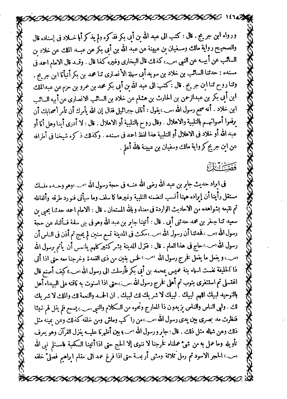 فِي إِيرَادِ حَدِيثِ جَابِرِ بْنِ عَبْدِ اللَّهِ رَضِيَ اللَّهُ عَنْهُ فِي حَجَّةِ رَسُولِ اللَّهِ صَلَّى اللَّهُ عَلَيْهِ وَسَلَّمَ وَهُوَ وَحْدَهُ مَنْسَكٌ مُسْتَقِلٌّ رَأَيْنَا أَنَّ إِيرَادَهُ هَاهُنَا أَنْسَبُ لِتَضَمُّنِهِ التَّلْبِيَةَ وغيرها كما سَلَفَ وَمَا سَيَأْتِي فَنُورِدُ طُرُقَهُ وَأَلْفَاظَهُ ثُمَّ نُتْبِعُهُ بِشَوَاهِدِهِ مِنَ الْأَحَادِيثِ الْوَارِدَةِ فِي مَعْنَاهُ وباللَّه الْمُسْتَعَانُ. قَالَ: الْإِمَامُ أَحْمَدُ حَدَّثَنَا يَحْيَى بْنُ سَعِيدٍ ثَنَا جَعْفَرُ بْنُ مُحَمَّدٍ حَدَّثَنِي أَبِي. قَالَ: أَتَيْنَا جَابِرَ بْنَ عَبْدِ اللَّهِ وَهُوَ فِي بَنِي سَلَمَةَ فَسَأَلْنَاهُ عَنْ حَجَّةِ رَسُولِ اللَّهِ صَلَّى اللَّهُ عَلَيْهِ وَسَلَّمَ فَحَدَّثَنَا أَنَّ رَسُولَ اللَّهِ صَلَّى اللَّهُ عَلَيْهِ وَسَلَّمَ مَكَثَ فِي الْمَدِينَةِ تِسْعَ سِنِينَ لَمْ يَحُجَّ ثُمَّ أُذِّنَ فِي النَّاسِ أَنَّ رَسُولَ اللَّهِ صَلَّى اللَّهُ عَلَيْهِ وَسَلَّمَ حاج في هَذَا الْعَامَ. قَالَ: فَنَزَلَ الْمَدِينَةَ بَشَرٌ كَثِيرٌ كُلُّهُمْ يَلْتَمِسُ أَنْ يَأْتَمَّ بِرَسُولِ اللَّهِ صَلَّى اللَّهُ عَلَيْهِ وَسَلَّمَ وَيَفْعَلَ مَا يَفْعَلُ فَخَرَجَ رَسُولُ اللَّهِ صَلَّى اللَّهُ عَلَيْهِ وَسَلَّمَ لخمس بَقِينَ مِنْ ذِي الْقَعْدَةِ وَخَرَجْنَا مَعَهُ حَتَّى إِذَا أَتَى ذَا الْحُلَيْفَةِ نَفِسَتْ أَسْمَاءُ بِنْتُ عُمَيْسٍ بِمُحَمَّدِ بْنِ أَبِي بَكْرٍ فَأَرْسَلَتْ إِلَى رَسُولِ اللَّهِ صَلَّى اللَّهُ عَلَيْهِ وَسَلَّمَ كَيْفَ أَصْنَعُ قَالَ اغْتَسِلِي ثُمَّ اسْتَثْفِرِي بِثَوْبٍ ثُمَّ أَهِلِّي فَخَرَجَ رَسُولِ اللَّهِ صَلَّى اللَّهُ عَلَيْهِ وَسَلَّمَ حَتَّى إِذَا اسْتَوَتْ بِهِ نَاقَتُهُ عَلَى الْبَيْدَاءِ أَهَلَّ بِالتَّوْحِيدِ لَبَّيْكَ اللَّهمّ لَبَّيْكَ. لَبَّيْكَ لَا شَرِيكَ لَكَ لَبَّيْكَ. إِنَّ الْحَمْدَ وَالنِّعْمَةَ لَكَ وَالْمُلْكَ لَا شَرِيكَ لَكَ. وَلَبَّى النَّاسُ وَالنَّاسُ يَزِيدُونَ ذَا الْمَعَارِجِ وَنَحْوَهُ مِنَ الْكَلَامِ وَالنَّبِيُّ صَلَّى اللَّهُ عَلَيْهِ وَسَلَّمَ يَسْمَعُ فَلَمْ يَقُلْ لَهُمْ شَيْئًا فَنَظَرْتُ مَدَّ بَصَرِي بَيْنَ يَدَيْ رَسُولِ اللَّهِ صَلَّى اللَّهُ عَلَيْهِ وَسَلَّمَ مَنْ راكب وماش ومن خلفه كذلك وَعَنْ يَمِينِهِ مِثْلُ ذَلِكَ وَعَنْ شِمَالِهِ مِثْلُ ذَلِكَ. قَالَ: جَابِرٌ وَرَسُولُ اللَّهِ صَلَّى اللَّهُ عَلَيْهِ وَسَلَّمَ بَيْنَ أَظْهُرِنَا عَلَيْهِ يَنْزِلُ الْقُرْآنُ وَهُوَ يَعْرِفُ تَأْوِيلَهُ وَمَا عَمِلَ بِهِ مِنْ شيء علمناه فَخَرَجْنَا لَا نَنْوِي إِلَّا الْحَجَّ حَتَّى إِذَا أَتَيْنَا الْكَعْبَةَ فَاسْتَلَمَ نَبِيُّ اللَّهِ صَلَّى اللَّهُ عَلَيْهِ وَسَلَّمَ الْحَجَرَ الْأَسْوَدَ ثُمَّ رَمَلَ ثَلَاثَةً وَمَشَى أَرْبَعَةً حَتَّى إِذَا فَرَغَ عَمَدَ إِلَى مَقَامِ إِبْرَاهِيمَ فَصَلَّى خَلْفَهُ