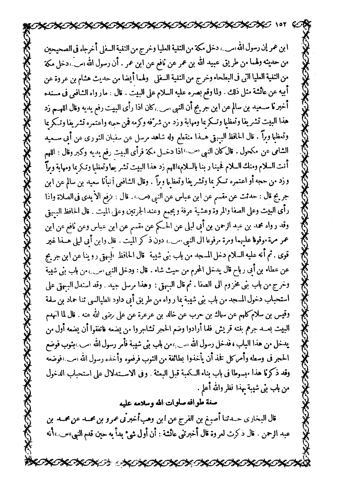 ابْنِ عُمَرَ أَنَّ رَسُولَ اللَّهِ صَلَّى اللَّهُ عَلَيْهِ وَسَلَّمَ دَخَلَ مَكَّةَ مِنَ الثَّنِيَّةِ الْعُلْيَا وَخَرَجَ مِنَ الثَّنِيَّةِ السُّفْلَى أَخْرَجَاهُ فِي الصَّحِيحَيْنِ مِنْ حَدِيثِهِ وَلَهُمَا مِنْ طَرِيقِ عُبَيْدُ اللَّهِ بْنُ عُمَرَ عَنْ نَافِعٍ عَنِ ابْنِ عُمَرَ. أَنَّ رَسُولَ اللَّهِ صَلَّى اللَّهُ عَلَيْهِ وَسَلَّمَ دَخَلَ مَكَّةَ مِنَ الثَّنِيَّةِ الْعُلْيَا الَّتِي فِي الْبَطْحَاءِ وَخَرَجَ مِنَ الثَّنِيَّةِ السُّفْلَى. وَلَهُمَا أَيْضًا مِنْ حَدِيثِ هِشَامِ بْنِ عُرْوَةَ عَنْ أَبِيهِ عَنْ عَائِشَةَ مِثْلُ ذَلِكَ. وَلَمَّا وَقَعَ بَصَرُهُ عليه السلام عَلَى الْبَيْتِ. قَالَ: مَا رَوَاهُ الشَّافِعِيُّ فِي مُسْنَدِهِ أَخْبَرَنَا سَعِيدُ بْنُ سَالِمٍ عَنِ ابْنِ جُرَيْجٍ أَنَّ النَّبِيَّ صَلَّى اللَّهُ عَلَيْهِ وَسَلَّمَ كَانَ إِذَا رَأَى الْبَيْتَ رَفَعَ يَدَيْهِ وَقَالَ اللَّهمّ زِدْ هَذَا الْبَيْتَ تَشْرِيفًا وَتَعْظِيمًا وَتَكْرِيمًا ومهابة وزد من شرّفه وكرمه فمن حَجَّهُ وَاعْتَمَرَهُ تَشْرِيفًا وَتَكْرِيمًا وَتَعْظِيمًا وَبِرًّا. قَالَ الْحَافِظُ الْبَيْهَقِيُّ هَذَا مُنْقَطِعٌ وَلَهُ شَاهِدٌ مُرْسَلٌ عَنْ سُفْيَانَ الثَّوْرِيِّ عَنْ أَبِي سَعِيدٍ الشَّامِيِّ عَنْ مَكْحُولٍ. قَالَ كَانَ النَّبِيُّ صَلَّى اللَّهُ عَلَيْهِ وَسَلَّمَ إِذَا دَخَلَ مَكَّةَ فَرَأَى الْبَيْتَ رَفَعَ يَدَيْهِ وَكَبَّرَ وَقَالَ: اللَّهمّ أَنْتَ السَّلَامُ وَمِنْكَ السَّلَامُ فَحَيِّنَا رَبَّنَا بِالسَّلَامِ، اللَّهمّ زِدْ هذا البيت تشريفا وتعظيما وتكريما ومهابة وبرا وَزِدْ مَنْ حَجَّهُ أَوِ اعْتَمَرَهُ تَكْرِيمًا وَتَشْرِيفًا وَتَعْظِيمًا وَبِرًّا. وَقَالَ الشَّافِعِيُّ أَنْبَأَنَا سَعِيدُ بْنُ سَالِمٍ عَنِ ابْنِ جُرَيْجٍ قَالَ: حُدِّثْتُ عَنْ مِقْسَمٍ عَنِ ابْنِ عَبَّاسٍ عَنِ النَّبِيِّ صَلَّى اللَّهُ عَلَيْهِ وَسَلَّمَ. قَالَ: تُرْفَعُ الْأَيْدِي فِي الصَّلَاةِ وَإِذَا رَأَى الْبَيْتَ وَعَلَى الصَّفَا وَالْمَرْوَةِ وَعَشِيَّةَ عَرَفَةَ وَبِجَمْعٍ وَعِنْدَ الْجَمْرَتَيْنِ وَعَلَى الْمَيِّتِ. قَالَ الْحَافِظُ الْبَيْهَقِيُّ وَقَدْ رَوَاهُ مُحَمَّدُ بْنُ عَبْدِ الرَّحْمَنِ بْنِ أَبِي لَيْلَى عَنِ الْحَكَمِ عَنْ مِقْسَمٍ عَنِ ابْنِ عَبَّاسٍ وَعَنْ نَافِعٍ عَنِ ابْنِ عُمَرَ مَرَّةً مَوْقُوفًا عَلَيْهِمَا وَمَرَّةً مَرْفُوعًا إِلَى النَّبِيِّ صَلَّى اللَّهُ عَلَيْهِ وَسَلَّمَ دُونَ ذِكْرِ الْمَيِّتِ. قَالَ وَابْنُ أَبِي لَيْلَى هذا غير قوى. ثم أنه عليه السلام دَخَلَ الْمَسْجِدَ مِنْ بَابِ بَنِي شَيْبَةَ قَالَ الْحَافِظُ الْبَيْهَقِيُّ رُوِّينَا عَنِ ابْنِ جُرَيْجٍ عَنْ عَطَاءِ بْنِ أَبِي رَبَاحٍ قَالَ يَدْخُلُ الْمُحْرِمُ مِنْ حَيْثُ شَاءَ. قَالَ: وَدَخَلَ النَّبِيُّ صَلَّى اللَّهُ عَلَيْهِ وَسَلَّمَ مِنْ بَابِ بَنِي شَيْبَةَ وَخَرَجَ مِنْ بَابِ بَنِي مَخْزُومٍ إِلَى الصَّفَا. ثُمَّ قَالَ الْبَيْهَقِيُّ: وَهَذَا مُرْسَلٌ جَيِّدٌ. وَقَدِ اسْتَدَلَّ الْبَيْهَقِيُّ عَلَى اسْتِحْبَابِ دُخُولِ الْمَسْجِدِ مِنْ بَابِ بَنِي شَيْبَةَ بِمَا رَوَاهُ مِنْ طَرِيقِ أَبِي دَاوُدَ الطَّيَالِسِيِّ ثَنَا حَمَّادُ بْنُ سَلَمَةَ وقيس بن سلام كُلُّهُمْ عَنْ سِمَاكِ بْنِ حَرْبٍ عَنْ خَالِدِ بْنِ عُرْعُرَةَ عَنْ عَلِيٍّ رَضِيَ اللَّهُ عَنْهُ. قَالَ لَمَّا انْهَدَمَ الْبَيْتُ بَعْدَ جُرْهُمٍ بَنَتْهُ قُرَيْشٌ فَلَمَّا أَرَادُوا وَضْعَ الْحَجَرِ تَشَاجَرُوا مَنْ يَضَعُهُ فَاتَّفَقُوا أَنْ يَضَعَهُ أَوَّلُ مَنْ يَدْخُلُ مِنْ هَذَا الْبَابِ، فَدَخَلَ رَسُولُ اللَّهِ صَلَّى اللَّهُ عَلَيْهِ وَسَلَّمَ مِنْ بَابِ بَنِي شَيْبَةَ فَأَمَرَ رَسُولُ اللَّهِ صَلَّى اللَّهُ عَلَيْهِ وَسَلَّمَ ب