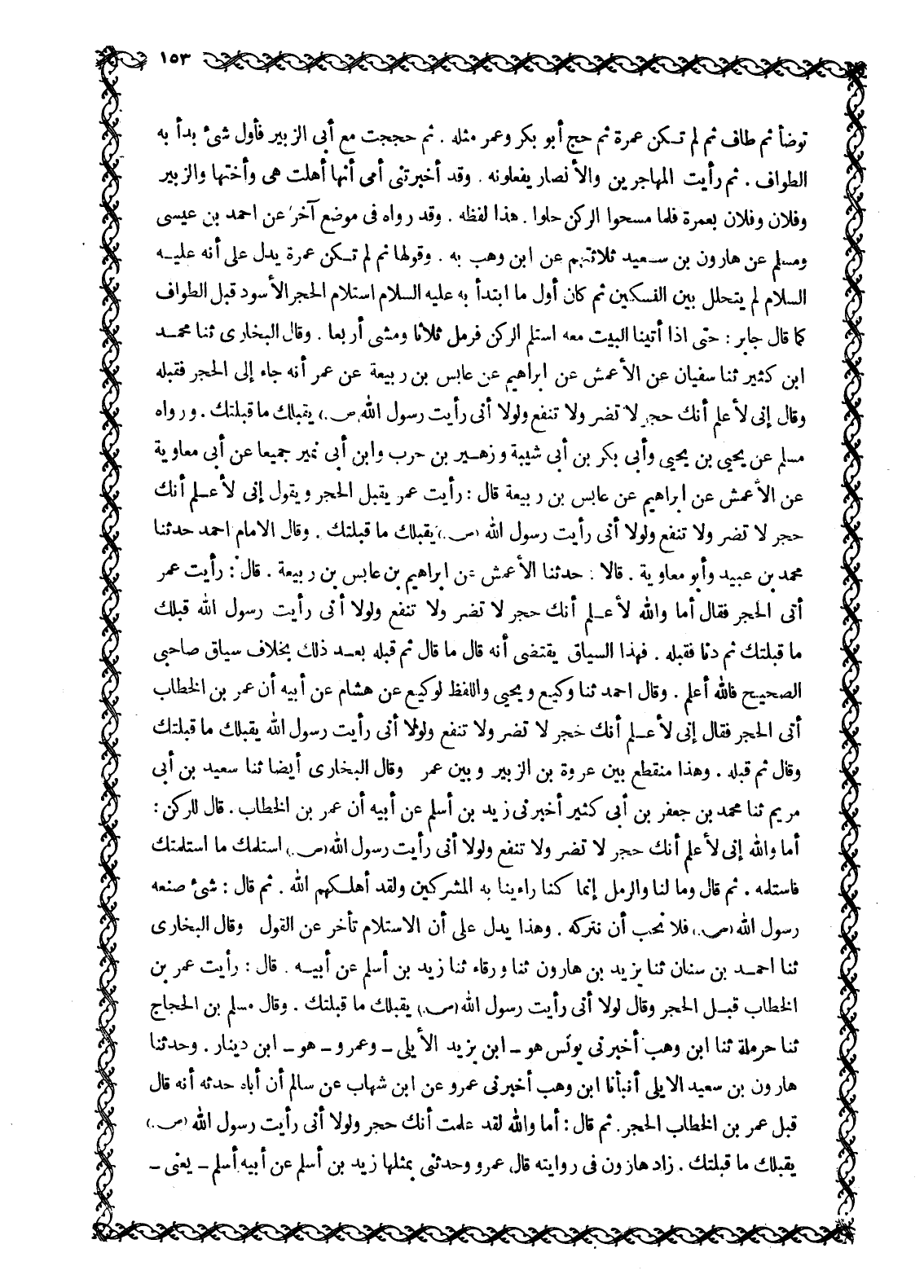أَمَا وَاللَّهِ إِنِّي لَأَعْلَمُ أَنَّكَ حَجَرٌ لَا تَضُرُّ وَلَا تَنْفَعُ وَلَوْلَا أَنِّي رَأَيْتُ رَسُولَ اللَّهِ صَلَّى اللَّهُ عَلَيْهِ وَسَلَّمَ اسْتَلَمَكَ مَا اسْتَلَمْتُكَ فَاسْتَلَمَهُ. ثُمَّ قال وما لنا والرمل إِنَّمَا كُنَّا رَاءَيْنَا بِهِ الْمُشْرِكِينَ وَلَقَدْ أَهَلَكَهُمُ اللَّهُ. ثُمَّ قَالَ: شَيْءٌ صَنَعَهُ رَسُولِ اللَّهِ صَلَّى اللَّهُ عَلَيْهِ وَسَلَّمَ فَلَا نُحِبُّ أَنْ نَتْرُكَهُ. وَهَذَا يَدُلُّ عَلَى أَنَّ الِاسْتِلَامَ تَأَخَّرَ عَنِ الْقَوْلِ. وَقَالَ الْبُخَارِيُّ ثَنَا أَحْمَدُ بْنُ سِنَانٍ ثَنَا يَزِيدُ بْنُ هَارُونَ ثَنَا وَرْقَاءُ ثَنَا زَيْدُ بْنُ أَسْلَمَ عَنْ أَبِيهِ. قَالَ: رَأَيْتُ عُمَرَ بْنَ الْخَطَّابِ قَبَّلَ الْحَجَرَ وَقَالَ لَوْلَا أَنِّي رَأَيْتُ رَسُولَ اللَّهِ صَلَّى اللَّهُ عَلَيْهِ وَسَلَّمَ يُقَبِّلُكَ مَا قَبَّلْتُكَ. وَقَالَ مُسْلِمُ بْنُ الْحَجَّاجِ ثَنَا حَرْمَلَةُ ثَنَا ابْنُ وَهْبٍ أَخْبَرَنِي يُونُسُ هُوَ- ابْنُ يَزِيدَ الْأَيْلِيُّ- وَعَمْرٌو- هو- ابن دينار. وَحَدَّثَنَا هَارُونُ بْنُ سَعِيدٍ الْأَيْلِيُّ أَنْبَأَنَا ابْنُ وَهْبٍ أَخْبَرَنِي عَمْرٌو عَنِ ابْنِ شِهَابٍ عَنْ سَالِمٍ أَنَّ أَبَاهُ حَدَّثَهُ أَنَّهُ قَالَ قَبَّلَ عُمَرُ بْنُ الْخَطَّابِ الْحَجَرَ. ثُمَّ قَالَ: أَمَا وَاللَّهِ لَقَدْ عَلِمْتُ أَنَّكَ حَجَرٌ وَلَوْلَا أَنِّي رَأَيْتُ رَسُولَ اللَّهِ صَلَّى اللَّهُ عَلَيْهِ وَسَلَّمَ يُقَبِّلُكَ مَا قَبَّلْتُكَ. زَادَ هَارُونُ فِي رِوَايَتِهِ قَالَ عَمْرٌو وَحَدَّثَنِي بِمِثْلِهَا زَيْدُ بْنُ أَسْلَمَ عَنْ أَبِيهِ أَسْلَمَ- يَعْنِي-