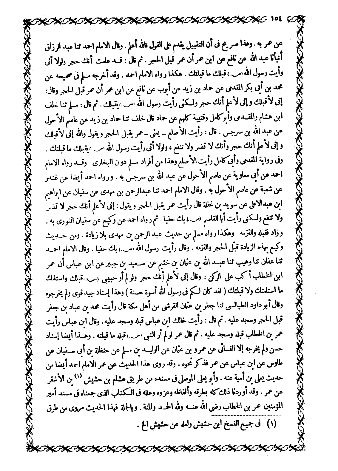 وَزَادَ فَقَبَّلَهُ وَالْتَزَمَهُ وَهَكَذَا رَوَاهُ مُسْلِمٌ مِنْ حَدِيثِ عَبْدِ الرَّحْمَنِ بْنِ مَهْدِيٍّ بِلَا زِيَادَةٍ. وَمِنْ حَدِيثِ وَكِيعٍ بِهَذِهِ الزِّيَادَةِ قَبَّلَ الْحَجَرَ وَالْتَزَمَهُ. وَقَالَ رَأَيْتُ رَسُولَ اللَّهِ صَلَّى اللَّهُ عَلَيْهِ وَسَلَّمَ بِكَ حَفِيًّا. وَقَالَ الْإِمَامُ أَحْمَدُ ثَنَا عَفَّانُ ثَنَا وُهَيْبٌ ثَنَا عَبْدُ اللَّهِ بْنُ عُثْمَانَ بْنِ خُثَيْمٍ عَنْ سَعِيدِ بْنِ جُبَيْرٍ عَنِ ابْنِ عَبَّاسٍ أَنَّ عمر ابن الْخَطَّابِ أَكَبَّ عَلَى الرُّكْنِ: وَقَالَ إِنِّي لَأَعْلَمُ أَنَّكَ حَجَرٌ وَلَوْ لَمْ أَرَ حَبِيبِي صَلَّى اللَّهُ عَلَيْهِ وَسَلَّمَ قَبَّلَكَ وَاسْتَلَمَكَ مَا اسْتَلَمْتُكَ وَلَا قَبَّلْتُكَ لَقَدْ كانَ لَكُمْ فِي رَسُولِ اللَّهِ أُسْوَةٌ حَسَنَةٌ 33: 21 وَهَذَا إِسْنَادٌ جَيِّدٌ قَوِيٌّ وَلَمْ يُخْرِجُوهُ وَقَالَ أبو داود الطيالسي ثنا جعفر بْنِ عُثْمَانَ الْقُرَشِيُّ مِنْ أَهْلِ مَكَّةَ قَالَ رَأَيْتُ مُحَمَّدَ بْنَ عَبَّادِ بْنِ جَعْفَرٍ قَبَّلَ الْحَجَرَ وَسَجَدَ عَلَيْهِ. ثُمَّ قَالَ: رَأَيْتُ خَالَكَ ابْنَ عَبَّاسٍ قَبَّلَهُ وَسَجَدَ عَلَيْهِ. وَقَالَ ابْنُ عَبَّاسٍ رَأَيْتُ عُمَرَ بْنَ الْخَطَّابِ قَبَّلَهُ وَسَجَدَ عَلَيْهِ. ثُمَّ قَالَ عُمَرُ لَوْ لَمْ أَرَ النَّبِيَّ صَلَّى اللَّهُ عَلَيْهِ وَسَلَّمَ قَبَّلَهُ مَا قَبَّلْتُهُ. وَهَذَا أَيْضًا إِسْنَادٌ حَسَنٌ وَلَمْ يُخْرِجْهُ إِلَّا النَّسَائِيُّ عَنْ عَمْرِو بْنِ عُثْمَانَ عَنِ الْوَلِيدِ بْنِ مُسْلِمٍ عَنْ حَنْظَلَةَ بْنِ أَبِي سُفْيَانَ عَنْ طَاوُسٍ عَنِ ابْنِ عَبَّاسٍ عَنْ عُمَرَ فَذَكَرَ نَحْوَهُ. وَقَدْ رَوَى هَذَا الْحَدِيثَ عَنْ عُمَرَ الْإِمَامُ أَحْمَدُ أَيْضًا مِنْ حَدِيثِ يَعْلَى بْنِ أُمَيَّةَ عَنْهُ. وَأَبُو يَعْلَى الْمَوْصِلِيُّ في مسندة من طريق هشام بن حشيش [1] بن الأشقر عَنْ عُمَرَ. وَقَدْ أَوْرَدْنَا ذَلِكَ كُلَّهُ بِطُرُقِهِ وَأَلْفَاظِهِ وَعَزْوِهِ وَعِلَلِهِ فِي الْكِتَابِ الَّذِي جَمَعْنَاهُ فِي مُسْنَدِ أَمِيرِ الْمُؤْمِنِينَ عُمَرَ بْنِ الْخَطَّابِ رَضِيَ اللَّهُ عَنْهُ وللَّه الْحَمْدُ وَالْمِنَّةُ. وَبِالْجُمْلَةِ فهذا الحديث مروى من طرق