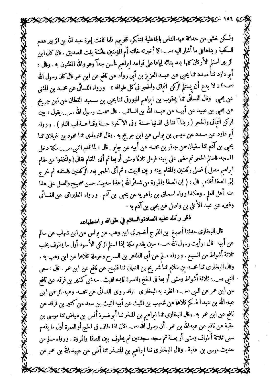 قَالَ الْبُخَارِيُّ حَدَّثَنَا أَصْبَغُ بْنُ الْفَرَجِ أَخْبَرَنِي ابْنُ وَهْبٍ عَنْ يُونُسَ عَنِ ابْنِ شِهَابٍ عَنْ سَالِمٍ عَنْ أَبِيهِ. قَالَ: رَأَيْتُ رَسُولَ اللَّهِ صَلَّى اللَّهُ عَلَيْهِ وَسَلَّمَ حِينَ يَقْدَمُ مَكَّةَ إِذَا اسْتَلَمَ الرُّكْنَ الْأَسْوَدَ أَوَّلَ مَا يَطُوفُ يَخُبُّ ثَلَاثَةَ أَشْوَاطٍ مِنَ السَّبْعِ. وَرَوَاهُ مُسْلِمٌ عَنْ أَبِي الطَّاهِرِ بْنِ السَّرْحِ وَحَرْمَلَةَ كِلَاهُمَا عَنِ ابْنِ وَهْبٍ بِهِ. وَقَالَ الْبُخَارِيُّ ثَنَا محمد بن سلام ثنا شريح بْنُ النُّعْمَانِ ثَنَا فُلَيْحٌ عَنْ نَافِعٍ عَنِ ابْنِ عُمَرَ. قَالَ: سَعَى النَّبِيُّ صَلَّى اللَّهُ عَلَيْهِ وَسَلَّمَ ثَلَاثَةَ أَشْوَاطٍ وَمَشَى أَرْبَعَةً فِي الْحَجِّ وَالْعُمْرَةِ تَابَعَهُ اللَّيْثُ. حَدَّثَنِي كَثِيرُ بْنُ فَرْقَدٍ عَنْ نَافِعٍ عَنِ ابْنِ عُمَرَ عَنِ النَّبِيِّ صَلَّى اللَّهُ عَلَيْهِ وَسَلَّمَ انْفَرَدَ بِهِ الْبُخَارِيُّ. وَقَدْ رَوَى النَّسَائِيُّ عَنْ مُحَمَّدٍ وَعَبْدِ الرَّحْمَنِ ابْنَيْ عَبْدِ اللَّهِ بْنِ عَبْدِ الْحَكَمِ كِلَاهُمَا عَنْ شُعَيْبِ بْنِ اللَّيْثِ عَنْ أَبِيهِ اللَّيْثِ بْنِ سَعْدٍ عَنْ كَثِيرِ بْنِ فَرْقَدٍ عَنْ نَافِعٍ عَنِ ابْنِ عُمَرَ بِهِ. وَقَالَ الْبُخَارِيُّ ثَنَا إِبْرَاهِيمُ بْنُ الْمُنْذِرِ ثَنَا أَبُو ضَمْرَةَ أَنَسُ بْنُ عِيَاضٍ ثَنَا مُوسَى بْنُ عُقْبَةَ عَنْ نَافِعٍ عَنْ عَبْدِ اللَّهِ بْنِ عُمَرَ. أَنَّ رَسُولَ اللَّهِ صَلَّى اللَّهُ عَلَيْهِ وَسَلَّمَ كَانَ إِذَا طَافَ فِي الْحَجِّ أَوِ الْعُمْرَةِ أَوَّلَ مَا يَقْدَمُ سَعَى ثَلَاثَةَ أَطْوَافٍ وَمَشَى أَرْبَعَةً ثُمَّ سَجَدَ سَجْدَتَيْنِ ثُمَّ يَطُوفُ بَيْنَ الصَّفَا وَالْمَرْوَةِ. وَرَوَاهُ مُسْلِمٌ مِنْ حَدِيثِ مُوسَى بْنِ عُقْبَةَ. وَقَالَ الْبُخَارِيُّ ثَنَا إِبْرَاهِيمُ بْنُ الْمُنْذِرِ ثَنَا أَنَسٌ عَنْ عُبَيْدُ اللَّهِ بْنُ عُمَرَ عَنْ
