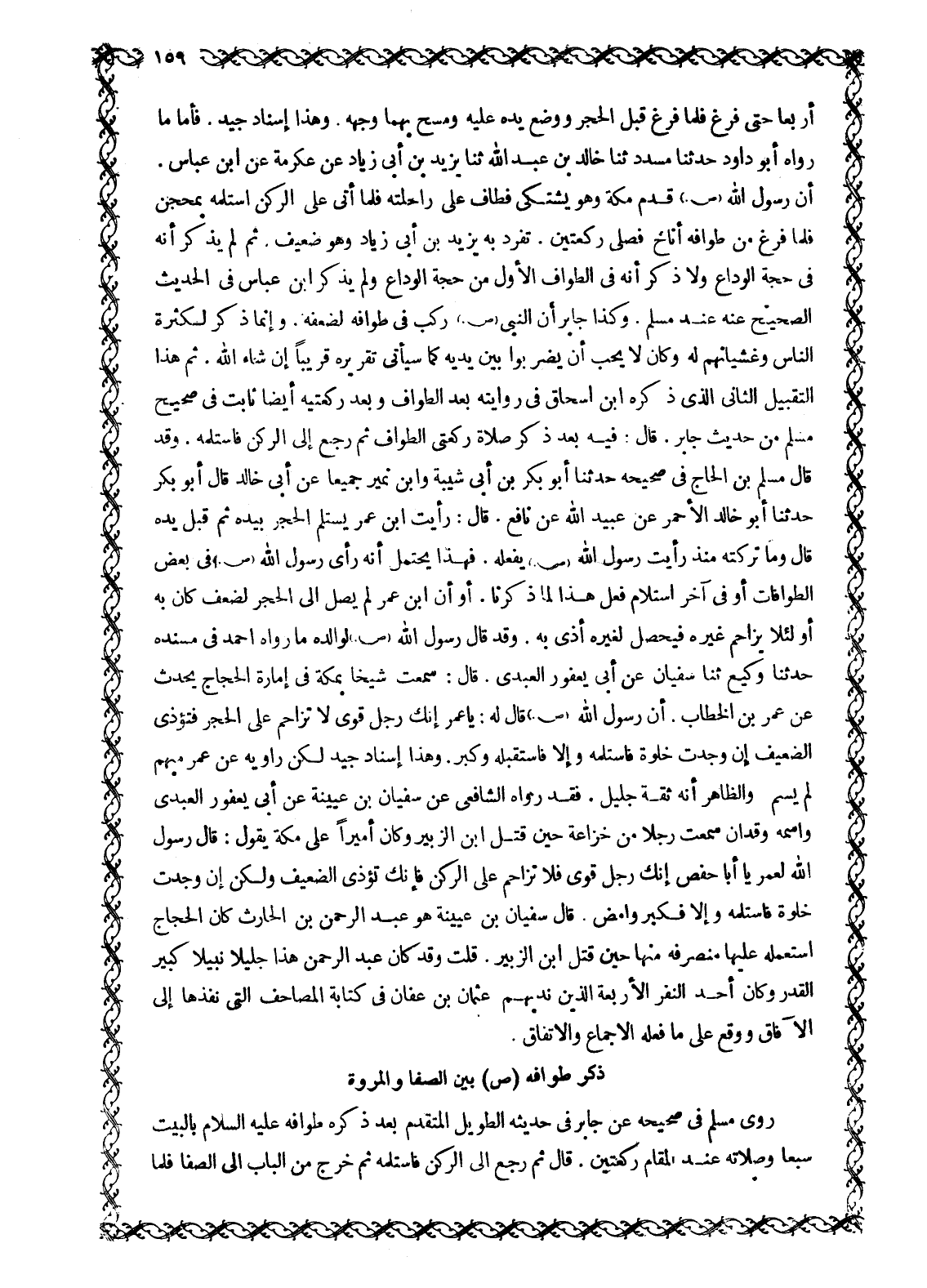 أَرْبَعًا حَتَّى فَرَغَ فَلَمَّا فَرَغَ قَبَّلَ الْحَجَرَ ووضع يده عَلَيْهِ وَمَسَحَ بِهِمَا وَجْهَهُ. وَهَذَا إِسْنَادٌ جَيِّدٌ. فَأَمَّا مَا رَوَاهُ أَبُو دَاوُدَ حَدَّثَنَا مُسَدَّدٌ ثَنَا خَالِدُ بْنُ عَبْدِ اللَّهِ ثَنَا يَزِيدُ بن أبي زياد عَنْ عِكْرِمَةَ عَنِ ابْنِ عَبَّاسٍ. أَنَّ رَسُولَ اللَّهِ صَلَّى اللَّهُ عَلَيْهِ وَسَلَّمَ قَدِمَ مَكَّةَ وَهُوَ يَشْتَكِي فَطَافَ عَلَى رَاحِلَتِهِ فَلَمَّا أَتَى عَلَى الرُّكْنِ اسْتَلَمَهُ بِمِحْجَنٍ فَلَمَّا فَرَغَ مِنْ طَوَافِهِ أَنَاخَ فَصَلَّى رَكْعَتَيْنِ. تَفَرَّدَ بِهِ يَزِيدُ بْنُ أَبِي زِيَادٍ وَهُوَ ضَعِيفٌ. ثُمَّ لَمْ يَذْكُرْ أَنَّهُ فِي حَجَّةِ الْوَدَاعِ وَلَا ذَكَرَ أَنَّهُ فِي الطَّوَافِ الْأَوَّلِ مِنْ حَجَّةِ الْوَدَاعِ وَلَمْ يَذْكُرِ ابْنُ عَبَّاسٍ فِي الْحَدِيثِ الصَّحِيحِ عَنْهُ عِنْدَ مُسْلِمٍ. وَكَذَا جَابِرٌ أَنَّ النَّبِيَّ صَلَّى اللَّهُ عَلَيْهِ وَسَلَّمَ ركب في طوافه لضعفه. وإنما ذكر لكثرة النَّاسِ وَغِشْيَانَهُمْ لَهُ وَكَانَ لَا يُحِبُّ أَنْ يُضْرَبُوا بَيْنَ يَدَيْهِ كَمَا سَيَأْتِي تَقْرِيرُهُ قَرِيبًا إِنْ شَاءَ اللَّهُ. ثُمَّ هَذَا التَّقْبِيلُ الثَّانِي الَّذِي ذَكَرَهُ ابْنُ إِسْحَاقَ فِي رِوَايَتِهِ بَعْدَ الطَّوَافِ وَبَعْدَ رَكْعَتَيْهِ أَيْضًا ثَابِتٌ فِي صَحِيحِ مُسْلِمٍ مِنْ حَدِيثِ جَابِرٍ. قَالَ: فِيهِ بَعْدَ ذِكْرِ صَلَاةِ رَكْعَتِيِ الطَّوَافِ ثُمَّ رَجَعَ إِلَى الركن فاستلمه. وقد قال مسلم بن الحاج فِي صَحِيحِهِ حَدَّثَنَا أَبُو بَكْرِ بْنُ أَبِي شَيْبَةَ وَابْنُ نُمَيْرٍ جَمِيعًا عَنْ أَبِي خَالِدٍ قَالَ أَبُو بَكْرٍ حَدَّثَنَا أَبُو خَالِدٍ الْأَحْمَرُ عَنْ عُبَيْدِ اللَّهِ عَنْ نَافِعٍ. قَالَ: رَأَيْتُ ابْنَ عُمَرَ يَسْتَلِمُ الْحَجَرَ بِيَدِهِ ثُمَّ قَبَّلَ يده قال وما تَرَكْتُهُ مُنْذُ رَأَيْتُ رَسُولَ اللَّهِ صَلَّى اللَّهُ عَلَيْهِ وَسَلَّمَ يَفْعَلُهُ. فَهَذَا يَحْتَمِلُ أَنَّهُ رَأَى رَسُولُ اللَّهِ صَلَّى اللَّهُ عَلَيْهِ وَسَلَّمَ في بعض الطوافات أو في آخر استلام فعل هذا لما ذَكَرْنَا. أَوْ أَنَّ ابْنَ عُمَرَ لَمْ يَصِلْ إِلَى الْحَجَرِ لِضَعْفٍ كَانَ بِهِ أَوْ لِئَلَّا يُزَاحِمَ غَيْرَهُ فَيَحْصُلُ لِغَيْرِهِ أَذًى بِهِ. وَقَدْ قَالَ رَسُولُ اللَّهِ صَلَّى اللَّهُ عَلَيْهِ وَسَلَّمَ لِوَالِدِهِ مَا رَوَاهُ أَحْمَدُ فِي مُسْنَدِهِ حَدَّثَنَا وَكِيعٌ ثَنَا سُفْيَانُ عَنْ أَبِي يَعْفُورٍ الْعَبْدِيِّ. قَالَ: سَمِعْتُ شَيْخًا بِمَكَّةَ فِي إِمَارَةِ الْحَجَّاجِ يُحَدِّثُ عَنْ عُمَرُ بْنُ الْخَطَّابِ. أَنَّ رَسُولَ اللَّهِ صَلَّى اللَّهُ عَلَيْهِ وَسَلَّمَ قَالَ لَهُ: يَا عُمَرُ إِنَّكَ رَجُلٌ قَوِيٌّ لَا تُزَاحِمْ عَلَى الْحَجَرِ فَتُؤْذِيَ الضَّعِيفَ إِنْ وَجَدْتَ خَلْوَةً فاستلمه وإلا فاستقبله وَكَبِّرْ. وَهَذَا إِسْنَادٌ جَيِّدٌ لَكِنَّ رَاوِيَهُ عَنْ عمر مهم لَمْ يُسَمَّ وَالظَّاهِرُ أَنَّهُ ثِقَةٌ جَلِيلٌ. فَقَدْ رَوَاهُ الشَّافِعِيُّ عَنْ سُفْيَانَ بْنِ عُيَيْنَةَ عَنْ أَبِي يَعْفُورٍ الْعَبْدِيِّ وَاسْمُهُ وَقْدَانُ سَمِعْتُ رَجُلًا مِنْ خُزَاعَةَ حِينَ قُتِلَ ابْنُ الزُّبَيْرِ وَكَانَ أَمِيرًا عَلَى مَكَّةَ يَقُولُ: قَالَ رَسُولُ اللَّهِ لِعُمَرَ يَا أَبَا حَفْصٍ إِنَّكَ رَجُلٌ قَوِيٌّ فَلَا تُزَاحِمْ عَلَى الرُّكْنِ فَإِنَّكَ تُؤْذِي الضَّعِيفَ وَلَكِنْ إِنْ وَجَدْتَ خَلْوَةً فَاسْتَلِمْهُ وَإِلَّا فَكَبِّرْ وَامْضِ. قَالَ سُفْيَانُ بْنُ عُيَيْنَةَ هُوَ عَبْدُ الرَّحْمَنِ بْنُ الْحَارِثِ كَانَ الْحَجَّاجُ اسْتَعْمَلَهُ عَلَيْهَا مُنْصَرَفَهُ مِنْهَا حِينَ قُتِلَ ابْنُ الزُّبَيْرِ. قُلْتُ وَقَدْ كَانَ عَبْدُ الرَّحْمَنِ هَذَا جَلِيلًا نَبِيلًا كَبِيرَ 