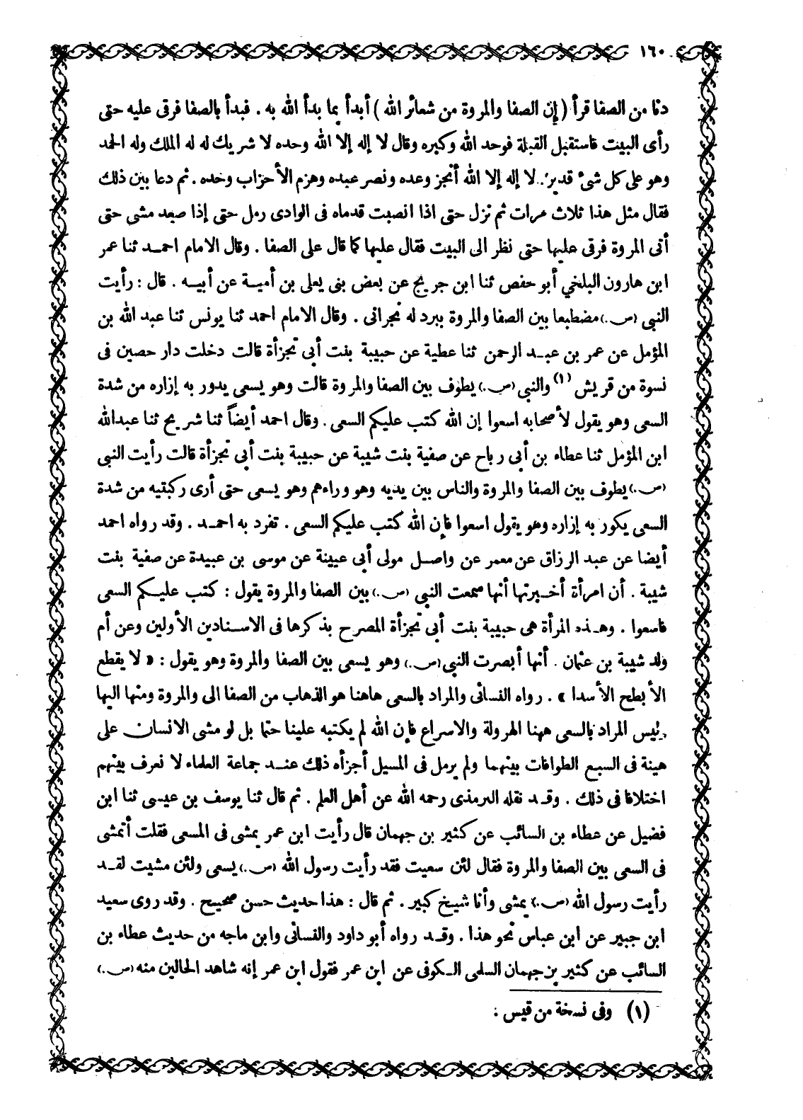دَنَا مِنَ الصَّفَا قَرَأَ إِنَّ الصَّفا وَالْمَرْوَةَ من شَعائِرِ الله 2: 158 أَبْدَأُ بِمَا بَدَأَ اللَّهُ بِهِ. فَبَدَأَ بِالصَّفَا فَرَقِيَ عَلَيْهِ حَتَّى رَأَى الْبَيْتَ فَاسْتَقْبَلَ الْقِبْلَةَ فَوَحَّدَ اللَّهَ وَكَبَّرَهُ وَقَالَ لَا إِلَهَ إِلَّا اللَّهُ وَحْدَهُ لَا شَرِيكَ لَهُ لَهُ الْمُلْكُ وَلَهُ الْحَمْدُ وَهُوَ عَلَى كُلِّ شَيْءٍ قَدِيرٌ. لا إله إلا الله أَنْجَزَ وَعْدَهُ وَنَصَرَ عَبْدَهُ وَهَزَمَ الْأَحْزَابَ وَحْدَهُ. ثُمَّ دَعَا بَيْنَ ذَلِكَ فَقَالَ مِثْلَ هَذَا ثَلَاثَ مَرَّاتٍ ثُمَّ نَزَلَ حَتَّى إِذَا انْصَبَّتْ قدماه في الوادي رمل حتى إذا صعد مَشَى حَتَّى أَتَى الْمَرْوَةَ فَرَقِيَ عَلَيْهَا حَتَّى نَظَرَ إِلَى الْبَيْتِ فَقَالَ عَلَيْهَا كَمَا قَالَ عَلَى الصَّفَا. وَقَالَ الْإِمَامُ أَحْمَدُ ثَنَا عُمَرُ ابن هَارُونَ الْبَلْخِيُّ أَبُو حَفْصٍ ثَنَا ابْنُ جُرَيْجٍ عَنْ بَعْضِ بَنِي يَعْلَى بْنِ أُمَيَّةَ عَنْ أَبِيهِ. قَالَ: رَأَيْتُ النَّبِيَّ صَلَّى اللَّهُ عَلَيْهِ وَسَلَّمَ مُضْطَبِعًا بَيْنَ الصَّفَا وَالْمَرْوَةِ بِبُرْدٍ لَهُ نَجْرَانِيٍّ. وَقَالَ الْإِمَامُ أَحْمَدُ ثَنَا يُونُسُ ثَنَا عَبْدُ اللَّهِ بْنُ الْمُؤَمَّلِ عَنْ عُمَرَ بْنِ عبد الرحمن ثنا عطية عن حبيبة بنت أبى تجزأة قالت دخلت دار حصين فِي نِسْوَةٍ مِنْ قُرَيْشٍ [1] وَالنَّبِيُّ صَلَّى اللَّهُ عَلَيْهِ وَسَلَّمَ يَطُوفُ بَيْنَ الصَّفَا وَالْمَرْوَةِ قَالَتْ وَهُوَ يَسْعَى يَدُورُ بِهِ إِزَارُهُ مِنْ شِدَّةِ السَّعْيِ وَهُوَ يَقُولُ لِأَصْحَابِهِ اسْعَوْا إِنَّ اللَّهَ كَتَبَ عَلَيْكُمُ السَّعْيَ. وَقَالَ أَحْمَدُ أَيْضًا ثَنَا شريح ثنا عبد الله ابن المؤمل ثَنَا عَطَاءُ بْنُ أَبِي رَبَاحٍ عَنْ صَفِيَّةَ بنت شيبة عن حبيبة بنت أبى تجزأة قَالَتْ رَأَيْتُ النَّبِيَّ صَلَّى اللَّهُ عَلَيْهِ وَسَلَّمَ يَطُوفُ بَيْنَ الصَّفَا وَالْمَرْوَةِ وَالنَّاسُ بَيْنَ يَدَيْهِ وَهُوَ وَرَاءَهُمْ وَهُوَ يَسْعَى حَتَّى أَرَى رُكْبَتَيْهِ من شدة السعي يكور بِهِ إِزَارُهُ وَهُوَ يَقُولُ اسْعَوْا فَإِنَّ اللَّهَ كَتَبَ عَلَيْكُمُ السَّعْيَ. تَفَرَّدَ بِهِ أَحْمَدُ. وَقَدْ رَوَاهُ أَحْمَدُ أَيْضًا عَنْ عَبْدِ الرَّزَّاقِ عَنْ مَعْمَرٍ عَنْ وَاصِلٍ مَوْلَى أَبِي عُيَيْنَةَ عَنْ مُوسَى بْنِ عُبَيْدَةَ عَنْ صَفِيَّةَ بِنْتِ شَيْبَةَ. أَنَّ امْرَأَةً أَخْبَرَتْهَا أَنَّهَا سَمِعَتِ النَّبِيَّ صَلَّى اللَّهُ عَلَيْهِ وَسَلَّمَ بَيْنَ الصَّفَا وَالْمَرْوَةِ يَقُولُ: كُتِبَ عَلَيْكُمُ السَّعْيُ فَاسْعَوْا. وَهَذِهِ الْمَرْأَةُ هِيَ حبيبة بنت أبى تجزأة الْمُصَرَّحُ بِذِكْرِهَا فِي الْإِسْنَادَيْنِ الْأَوَّلَيْنِ وَعَنْ أُمِّ وَلَدِ شَيْبَةَ بْنِ عُثْمَانَ. أَنَّهَا أَبْصَرَتِ النَّبِيَّ صَلَّى اللَّهُ عَلَيْهِ وَسَلَّمَ وَهُوَ يَسْعَى بَيْنَ الصَّفَا وَالْمَرْوَةِ وَهُوَ يَقُولُ: «لَا يُقْطَعُ الْأَبْطَحُ الأسدا» . رواه النسائي والمراد بالسعي ها هنا هو الذهاب من الصفا الى والمروة وَمِنْهَا إِلَيْهَا وَلَيْسَ الْمُرَادُ بِالسَّعْيِ هَاهُنَا الْهَرْوَلَةَ وَالْإِسْرَاعَ فَإِنَّ اللَّهَ لَمْ يَكْتُبْهُ عَلَيْنَا حَتْمًا بَلْ لَوْ مَشَى الْإِنْسَانُ عَلَى هِينَةٍ فِي السبع الطوافات بَيْنَهُمَا وَلَمْ يَرْمُلْ فِي الْمَسِيلِ أَجْزَأَهُ ذَلِكَ عند جماعة العلماء لا نعرف بينهم اختلافا فِي ذَلِكَ. وَقَدْ نَقَلَهُ التِّرْمِذِيُّ رَحِمَهُ اللَّهُ عَنْ أَهْلِ الْعِلْمِ. ثُمَّ قَالَ ثَنَا يُوسُفُ بْنُ عِيسَى ثَنَا ابْنُ فُضَيْلٍ عَنْ عَطَاءِ بن السائب عن كثير بن جهمان قَالَ رَأَيْتُ ابْنَ عُمَرَ يَمْشِي فِي الْمَسْعَى فَقُلْتُ أَتَمْشِي فِي السَّعْيِ بَيْنَ الصَّفَا وَالْمَرْوَةِ فقال لئن سعيت فَقَدْ رَأَيْتُ رَسُول