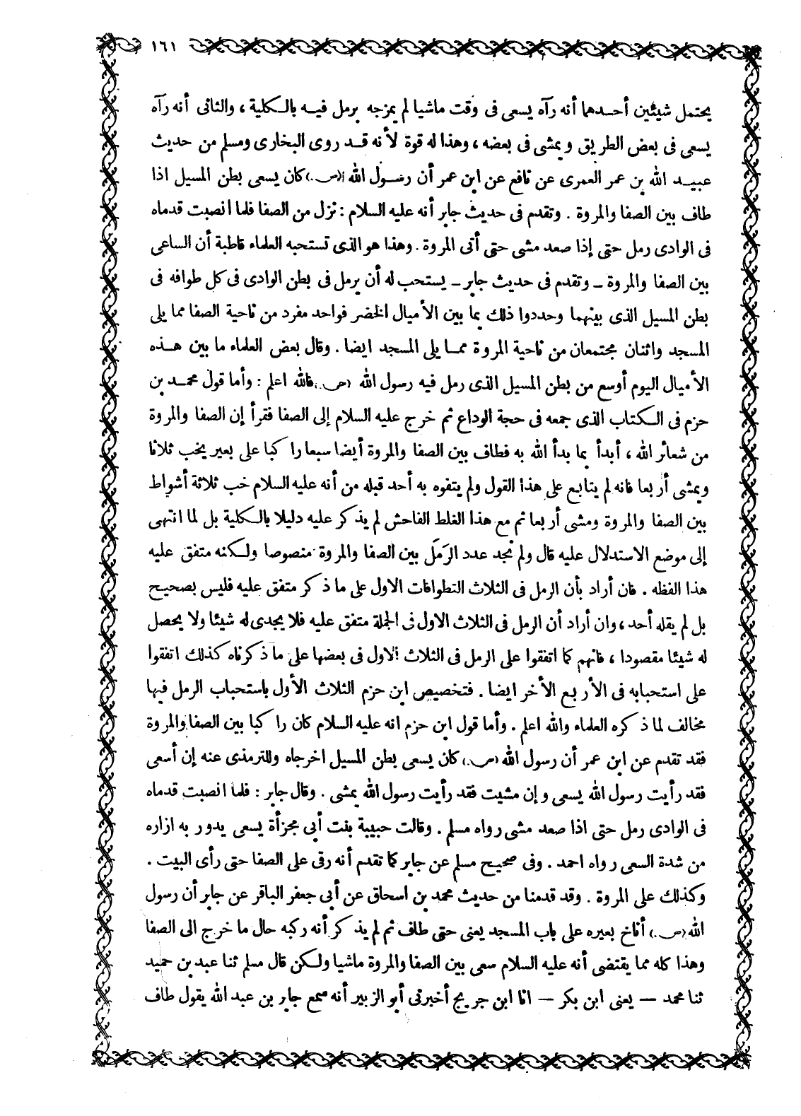 يَحْتَمِلُ شَيْئَيْنِ أَحَدُهُمَا أَنَّهُ رَآهُ يَسْعَى فِي وَقْتٍ مَاشِيًا لَمْ يَمْزُجْهُ بِرَمَلٍ فِيهِ بِالْكُلِّيَّةِ، وَالثَّانِي أَنَّهُ رَآهُ يَسْعَى فِي بَعْضِ الطَّرِيقِ وَيَمْشِي فِي بَعْضِهِ، وَهَذَا لَهُ قُوَّةٌ لِأَنَّهُ قَدْ رَوَى الْبُخَارِيُّ وَمُسْلِمٌ مِنْ حَدِيثِ عُبَيْدِ اللَّهِ بْنِ عُمَرَ الْعُمَرِيِّ عَنْ نَافِعٍ عَنِ ابْنِ عُمَرَ أَنَّ رَسُولَ اللَّهِ صَلَّى اللَّهُ عَلَيْهِ وَسَلَّمَ كَانَ يَسْعَى بَطْنَ الْمَسِيلِ إِذَا طَافَ بَيْنَ الصَّفَا وَالْمَرْوَةِ. وَتَقَدَّمَ فِي حَدِيثِ جابر أنه عليه السلام: نَزَلَ مِنَ الصَّفَا فَلَمَّا انْصَبَّتْ قَدَمَاهُ فِي الْوَادِي رَمَلَ حَتَّى إِذَا صَعِدَ مَشَى حَتَّى أَتَى الْمَرْوَةَ وَهَذَا هُوَ الَّذِي تَسْتَحِبُّهُ الْعُلَمَاءُ قاطبة أن الساعي بَيْنَ الصَّفَا وَالْمَرْوَةِ- وَتَقَدَّمَ فِي حَدِيثِ جَابِرٍ- يُسْتَحَبُّ لَهُ أَنْ يَرْمُلَ فِي بَطْنِ الْوَادِي في كل طوافه فِي بَطْنِ الْمَسِيلِ الَّذِي بَيْنَهُمَا وَحَدَّدُوا ذَلِكَ بِمَا بَيْنَ الْأَمْيَالِ الْخُضْرِ فَوَاحِدٌ مُفْرَدٌ مِنْ نَاحِيَةِ الصَّفَا مِمَّا يَلِي الْمَسْجِدَ وَاثْنَانِ مُجْتَمِعَانِ مِنْ نَاحِيَةِ الْمَرْوَةِ مِمَّا يَلِي الْمَسْجِدَ أَيْضًا. وَقَالَ بَعْضُ الْعُلَمَاءِ مَا بَيْنَ هَذِهِ الْأَمْيَالِ الْيَوْمَ أَوْسَعُ مِنْ بَطْنِ الْمَسِيلِ الَّذِي رَمَلَ فِيهِ رَسُولُ اللَّهِ صَلَّى اللَّهُ عَلَيْهِ وَسَلَّمَ فاللَّه أَعْلَمُ: وَأَمَّا قَوْلُ مُحَمَّدِ بْنِ حَزْمٍ فِي الْكِتَابِ الَّذِي جَمَعَهُ فِي حَجَّةِ الْوَدَاعِ ثم خرج عليه السلام إِلَى الصَّفَا فَقَرَأَ إِنَّ الصَّفَا وَالْمَرْوَةَ مِنْ شعائر الله، أَبْدَأُ بِمَا بَدَأَ اللَّهُ بِهِ فَطَافَ بَيْنَ الصَّفَا وَالْمَرْوَةِ أَيْضًا سَبْعًا رَاكِبًا عَلَى بَعِيرٍ يَخُبُّ ثَلَاثًا وَيَمْشِي أَرْبَعًا فَإِنَّهُ لَمْ يُتَابِعْ عَلَى هَذَا الْقَوْلِ وَلَمْ يَتَفَوَّهْ بِهِ أَحَدٌ قبله من أنه عليه السلام خَبَّ ثَلَاثَةَ أَشْوَاطٍ بَيْنَ الصَّفَا وَالْمَرْوَةِ وَمَشَى أَرْبَعًا ثُمَّ مَعَ هَذَا الْغَلَطِ الْفَاحِشِ لَمْ يَذْكُرْ عَلَيْهِ دَلِيلًا بِالْكُلِّيَّةِ بَلْ لَمَّا انْتَهَى إِلَى مَوْضِعِ الِاسْتِدْلَالِ عَلَيْهِ قَالَ وَلَمْ نَجِدْ عَدَدَ الرَّمَلِ بَيْنَ الصَّفَا وَالْمَرْوَةِ مَنْصُوصًا وَلَكِنَّهُ متفق عليه هذا لفظه. فان أراد بأن الرمل في الثلاث التطوافات الْأُوَلِ عَلَى مَا ذَكَرَ مُتَّفَقٌ عَلَيْهِ فَلَيْسَ بِصَحِيحٍ بَلْ لَمْ يَقُلْهُ أَحَدٌ، وَإِنْ أَرَادَ أَنَّ الرَّمَلَ فِي الثَّلَاثِ الْأُوَلِ فِي الْجُمْلَةِ مُتَّفَقٌ عَلَيْهِ فَلَا يُجْدِي لَهُ شَيْئًا وَلَا يحصل له شيئا مَقْصُودًا، فَإِنَّهُمْ كَمَا اتَّفَقُوا عَلَى الرَّمَلِ فِي الثَّلَاثِ الْأُوَلِ فِي بَعْضِهَا عَلَى مَا ذَكَرْنَاهُ كَذَلِكَ اتَّفَقُوا عَلَى اسْتِحْبَابِهِ فِي الْأَرْبَعِ الْأُخَرِ أَيْضًا. فَتَخْصِيصُ ابْنِ حَزْمٍ الثَّلَاثَ الْأُوَلَ بِاسْتِحْبَابِ الرَّمَلِ فِيهَا مُخَالِفٌ لِمَا ذَكَرَهُ الْعُلَمَاءُ وَاللَّهُ أَعْلَمُ. وَأَمَّا قَوْلُ ابْنِ حَزْمٍ أَنَّهُ عَلَيْهِ السلام كَانَ رَاكِبًا بَيْنَ الصَّفَا وَالْمَرْوَةِ فَقَدْ تَقَدَّمَ عَنِ ابْنِ عُمَرَ أَنَّ رَسُولَ اللَّهِ صَلَّى اللَّهُ عَلَيْهِ وَسَلَّمَ كَانَ يَسْعَى بَطْنَ الْمَسِيلِ أَخْرَجَاهُ وَلِلتِّرْمِذِيِّ عَنْهُ إِنْ أَسْعَى فَقَدْ رَأَيْتُ رسول الله يَسْعَى وَإِنْ مَشَيْتُ فَقَدْ رَأَيْتُ رَسُولَ اللَّهِ يَمْشِي. وَقَالَ جَابِرٌ: فَلَمَّا انْصَبَّتْ قَدَمَاهُ فِي الْوَادِي رَمَلَ حَتَّى إِذَا صَعِدَ مَشَى رَوَاهُ مسلم. وقالت حبيبة بنت أبى مجزأة يَسْعَى يَدُورُ بِهِ إِزَارُهُ مِنْ شِدَّةِ السَّعْيِ رَوَ