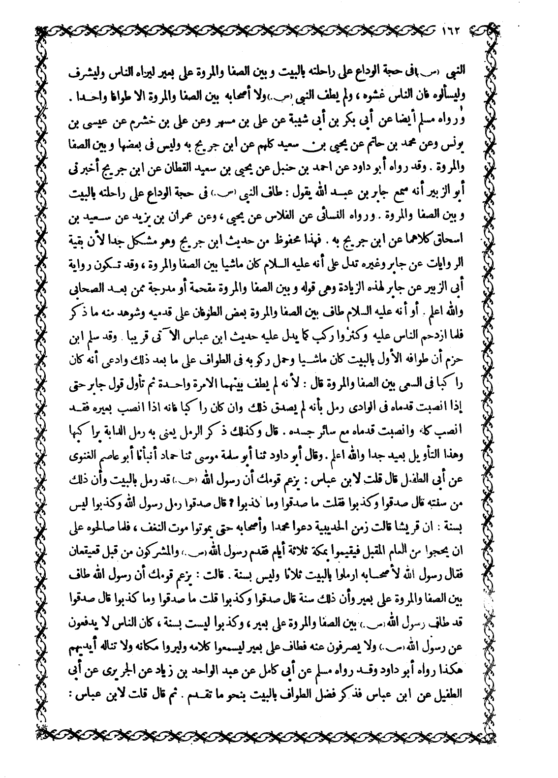 وَرَوَاهُ مُسْلِمٌ أَيْضًا عَنْ أَبِي بَكْرِ بْنِ أَبِي شَيْبَةَ عَنْ عَلِيِّ بْنِ مُسْهِرٍ وَعَنْ عَلِيِّ بْنِ خَشْرَمٍ عَنْ عِيسَى بْنِ يُونُسَ وَعَنْ مُحَمَّدِ بْنِ حَاتِمٍ عَنْ يَحْيَى بْنِ سَعِيدٍ كُلُّهُمْ عَنِ ابْنِ جُرَيْجٍ بِهِ وَلَيْسَ فِي بَعْضِهَا وَبَيْنَ الصَّفَا وَالْمَرْوَةِ. وَقَدْ رَوَاهُ أَبُو دَاوُدَ عَنْ أَحْمَدُ بْنُ حَنْبَلٍ عَنْ يَحْيَى بْنِ سَعِيدٍ الْقَطَّانِ عَنِ ابْنُ جُرَيْجٍ أَخْبَرَنِي أَبُو الزُّبَيْرِ أَنَّهُ سَمِعَ جَابِرَ بْنَ عَبْدِ اللَّهِ يَقُولُ: طَافَ النَّبِيُّ صَلَّى اللَّهُ عَلَيْهِ وَسَلَّمَ فِي حَجَّةِ الْوَدَاعِ عَلَى رَاحِلَتِهِ بِالْبَيْتِ وَبَيْنَ الصَّفَا وَالْمَرْوَةِ. وَرَوَاهُ النَّسَائِيُّ عَنِ الْفَلَّاسِ عَنْ يَحْيَى، وَعَنْ عِمْرَانَ بْنِ يزيد عن سعيد بْنِ إِسْحَاقَ كِلَاهُمَا عَنِ ابْنِ جُرَيْجٍ بِهِ. فَهَذَا مَحْفُوظٌ مِنْ حَدِيثِ ابْنِ جُرَيْجٍ وَهُوَ مُشْكِلٌ جِدًّا لِأَنَّ. بَقِيَّةَ الرِّوَايَاتِ عَنْ جَابِرٍ وغيره تدل على أنه عليه السلام كَانَ مَاشِيًا بَيْنَ الصَّفَا وَالْمَرْوَةِ، وَقَدْ تَكُونُ رواية أبى الزبير عَنْ جَابِرٍ وَغَيْرِهِ تَدُلُّ عَلَى أَنَّهُ عَلَيْهِ السلام كَانَ مَاشِيًا بَيْنَ الصَّفَا وَالْمَرْوَةِ، وَقَدْ تَكُونُ رواية أبى الزبير عن جابر لهذه الزِّيَادَةِ وَهِيَ قَوْلُهُ وَبَيْنَ الصَّفَا وَالْمَرْوَةِ مُقْحَمَةً أو مدرجة ممن بعد الصجابى والله اعلم. أو أنه عليه السلام طاف بين الصفا والمروة بعض الطوفان عَلَى قَدَمَيْهِ وَشُوهِدَ مِنْهُ مَا ذُكِرَ فَلَمَّا ازْدَحَمَ النَّاسُ عَلَيْهِ وَكَثُرُوا رَكِبَ كَمَا يَدُلُّ عَلَيْهِ حَدِيثُ ابْنِ عَبَّاسٍ الْآتِي قَرِيبًا وَقَدْ سَلَّمَ ابْنُ حَزْمٍ أَنَّ طَوَافَهُ الْأَوَّلَ بِالْبَيْتِ كَانَ مَاشِيًا وَحَمَلَ رُكُوبَهُ فِي الطَّوَافِ عَلَى مَا بَعْدَ ذَلِكَ وَادَّعَى أَنَّهُ كَانَ رَاكِبًا فِي السَّعْيِ بَيْنَ الصَّفَا وَالْمَرْوَةِ قَالَ: لِأَنَّهُ لم يطف بينهما الامرة وَاحِدَةً ثُمَّ تَأَوَّلَ قَوْلَ جَابِرٍ حَتَّى إِذَا انصبت قدماه في الوادي رمل بأنه لم يُصَدِّقُ ذَلِكَ وَإِنْ كَانَ رَاكِبًا فَإِنَّهُ إِذَا انْصَبَّ بِعِيرُهُ فَقَدِ انْصَبَّ كُلُّهُ وَانْصَبَّتْ قَدَمَاهُ مَعَ سَائِرِ جَسَدِهِ. قَالَ وَكَذَلِكَ ذِكْرُ الرَّمَلِ يَعْنِي بِهِ رَمَلَ الدَّابَّةِ بِرَاكِبِهَا وَهَذَا التَّأْوِيلُ بَعِيدٌ جِدًّا وَاللَّهُ أَعْلَمُ. وَقَالَ أَبُو دَاوُدَ ثَنَا أَبُو سَلَمَةَ مُوسَى ثَنَا حَمَّادٌ أَنْبَأَنَا أَبُو عَاصِمٍ الْغَنَوِيُّ عَنْ أَبِي الطُّفَيْلِ قَالَ قُلْتُ لِابْنِ عَبَّاسٍ: يَزْعُمُ قَوْمُكَ أَنَّ رَسُولَ اللَّهِ صَلَّى اللَّهُ عَلَيْهِ وَسَلَّمَ قَدْ رَمَلَ بالبيت وأن ذلك من سنته قَالَ صَدَقُوا وَكَذَبُوا فَقُلْتُ مَا صَدَقُوا وَمَا كَذَبُوا؟ قَالَ صَدَقُوا رَمَلَ رسول الله وَكَذَبُوا لَيْسَ بِسُنَّةٍ: إِنَّ قُرَيْشًا قَالَتْ زَمَنَ الْحُدَيْبِيَةِ دَعُوا مُحَمَّدًا وَأَصْحَابَهُ حَتَّى يَمُوتُوا مَوْتَ النَّغَفِ، فلما صالحوه على ان يحجوا مِنَ الْعَامِ الْمُقْبِلِ فَيُقِيمُوا بِمَكَّةَ ثَلَاثَةَ أَيَّامٍ فَقَدِمَ رَسُولُ اللَّهِ صَلَّى اللَّهُ عَلَيْهِ وَسَلَّمَ وَالْمُشْرِكُونَ مِنْ قِبَلِ قُعَيْقِعَانَ فَقَالَ رَسُولُ اللَّهِ لأصحابه ارملوا بالبيت ثلاثا وليس بسنة. قالت: يزعم قومك أن رسول الله طَافَ بَيْنَ الصَّفَا وَالْمَرْوَةِ عَلَى بَعِيرٍ وَأَنَّ ذَلِكَ سُنَّةٌ قَالَ صَدَقُوا وَكَذَبُوا قُلْتُ مَا صَدَقُوا وَمَا كَذَبُوا قَالَ صَدَقُوا قَدْ طَافَ رَسُولُ اللَّهِ صَلَّى اللَّهُ عَلَيْهِ وَسَلَّمَ بَيْنَ الصَّفَا وَالْمَرْوَةِ عَلَى بَعِيرٍ، وَكَذَبُوا لَيْسَتْ بِسُنَّةٍ، كَانَ النَّاسُ لَا يُدْفَعُونَ عَنْ رَسُولِ ا