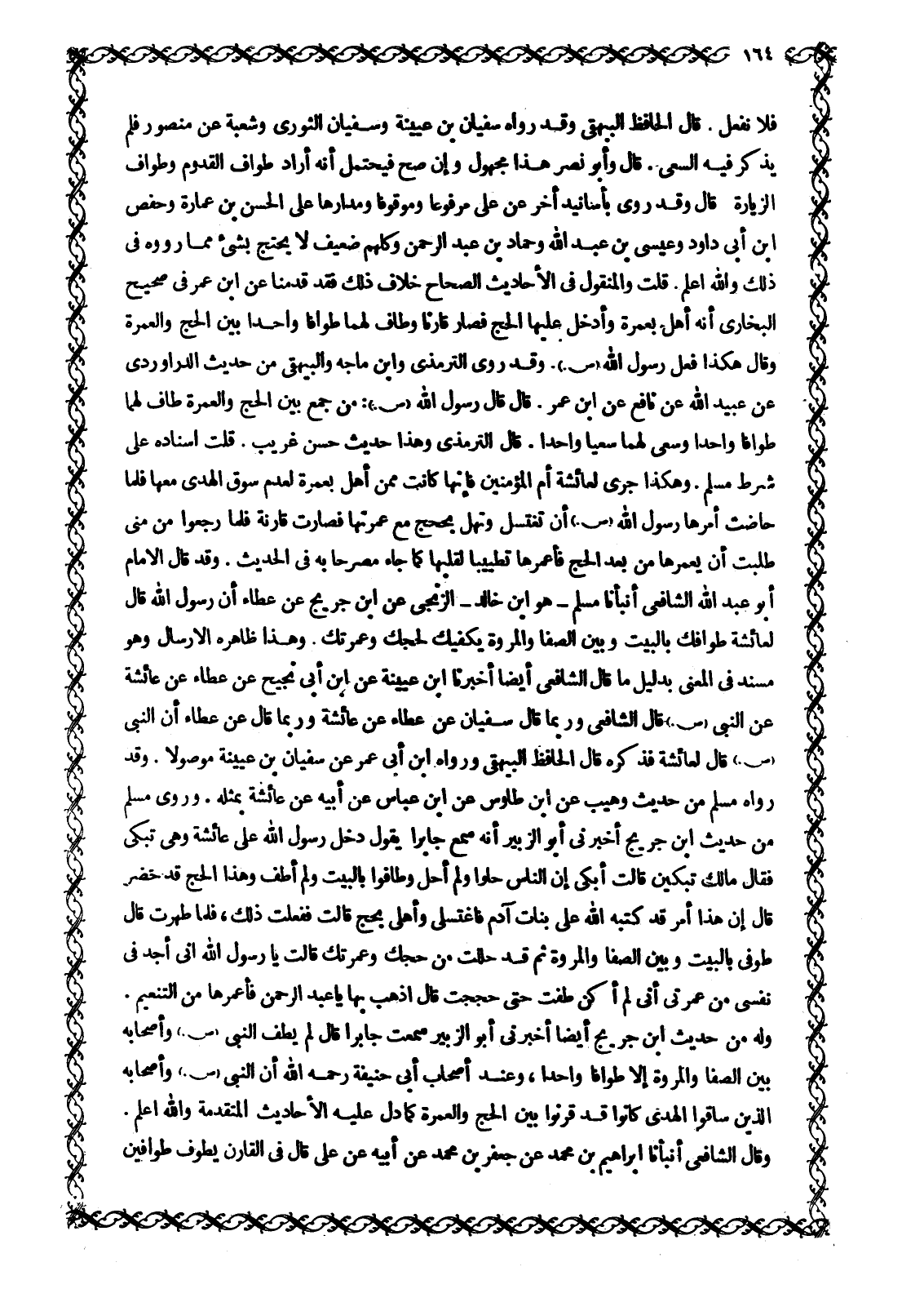 فَلَا نَفْعَلُ. قَالَ الْحَافِظُ الْبَيْهَقِيُّ وَقَدْ رَوَاهُ سُفْيَانُ بْنُ عُيَيْنَةَ وَسُفْيَانُ الثَّوْرِيُّ وَشُعْبَةُ عَنْ مَنْصُورٍ فَلَمْ يَذْكُرْ فِيهِ السَّعْيَ. قَالَ وَأَبُو نَصْرٍ هَذَا مَجْهُولٌ وَإِنْ صَحَّ فَيَحْتَمِلُ أَنَّهُ أَرَادَ طَوَافَ الْقُدُومِ وَطَوَافَ الزِّيَارَةِ قَالَ وَقَدْ رُوِيَ بِأَسَانِيدَ أُخَرَ عَنْ عَلِيٍّ مَرْفُوعًا وَمَوْقُوفًا ومدارها على الحسن بن عمارة وحفص ابن أَبِي دَاوُدَ وَعِيسَى بْنِ عَبْدِ اللَّهِ وَحَمَّادِ بْنِ عَبْدِ الرَّحْمَنِ وَكُلُّهُمْ ضَعِيفٌ لَا يُحْتَجُّ بِشَيْءٍ مِمَّا رَوَوْهُ فِي ذَلِكَ وَاللَّهُ أَعْلَمُ. قُلْتُ وَالْمَنْقُولُ فِي الْأَحَادِيثِ الصِّحَاحِ خِلَافُ ذَلِكَ فَقَدْ قَدَّمْنَا عَنِ ابْنِ عُمَرَ فِي صَحِيحِ الْبُخَارِيِّ أَنَّهُ أَهَلَّ بِعُمْرَةٍ وَأَدْخَلَ عَلَيْهَا الْحَجَّ فَصَارَ قَارِنًا وَطَافَ لَهُمَا طَوَافًا وَاحِدًا بَيْنَ الْحَجِّ وَالْعُمْرَةِ وَقَالَ هَكَذَا فَعَلَ رَسُولُ اللَّهِ صَلَّى اللَّهُ عَلَيْهِ وَسَلَّمَ. وَقَدْ رَوَى التِّرْمِذِيُّ وَابْنُ مَاجَهْ وَالْبَيْهَقِيُّ مِنْ حَدِيثِ الدراوَرْديّ عَنْ عُبَيْدِ اللَّهِ عَنْ نَافِعٍ عَنِ ابْنِ عُمَرَ. قَالَ قَالَ رَسُولُ اللَّهِ صَلَّى اللَّهُ عَلَيْهِ وَسَلَّمَ: مَنْ جَمَعَ بَيْنَ الْحَجِّ وَالْعُمْرَةِ طَافَ لَهُمَا طَوَافًا وَاحِدًا وَسَعَى لَهُمَا سَعْيًا وَاحِدًا. قَالَ التِّرْمِذِيُّ وَهَذَا حَدِيثٌ حَسَنٌ غَرِيبٌ. قُلْتُ إِسْنَادُهُ عَلَى شَرْطِ مُسْلِمٍ. وَهَكَذَا جَرَى لِعَائِشَةَ أُمِّ الْمُؤْمِنِينَ فَإِنَّهَا كَانَتْ مِمَّنْ أَهَلَّ بِعُمْرَةٍ لِعَدَمِ سَوْقِ الْهَدْيِ مَعَهَا فَلَمَّا حَاضَتْ أَمَرَهَا رَسُولُ اللَّهِ صَلَّى اللَّهُ عَلَيْهِ وَسَلَّمَ إِنَّ تَغْتَسِلَ وَتُهِلَّ بِحَجٍّ مَعَ عُمْرَتِهَا فَصَارَتْ قَارِنَةً فَلَمَّا رَجَعُوا مِنْ مِنًى طَلَبَتْ أَنْ يُعْمِرَهَا مِنْ بَعْدِ الْحَجِّ فَأَعْمَرَهَا تَطْيِيبًا لِقَلْبِهَا كَمَا جَاءَ مُصَرَّحًا بِهِ فِي الْحَدِيثِ. وَقَدْ قَالَ الْإِمَامُ أَبُو عَبْدِ اللَّهِ الشَّافِعِيُّ أَنْبَأَنَا مُسْلِمٌ- هُوَ ابْنُ خَالِدٍ- الزَّنْجِيُّ عَنِ ابْنِ جُرَيْجٍ عَنْ عَطَاءٍ أن رسول الله قَالَ لِعَائِشَةَ طَوَافُكِ بِالْبَيْتِ وَبَيْنَ الصَّفَا وَالْمَرْوَةِ يَكْفِيكِ لِحَجِّكِ وَعُمْرَتِكِ. وَهَذَا ظَاهِرُهُ الْإِرْسَالُ وَهُوَ مُسْنَدٌ فِي الْمَعْنَى بِدَلِيلِ مَا قَالَ الشَّافِعِيُّ أَيْضًا أَخْبَرَنَا ابْنُ عُيَيْنَةَ عَنِ ابْنِ أَبِي نَجِيحٍ عَنْ عَطَاءٍ عَنْ عَائِشَةَ عَنِ النَّبِيِّ صَلَّى اللَّهُ عَلَيْهِ وَسَلَّمَ قَالَ الشَّافِعِيُّ وَرُبَّمَا قَالَ سُفْيَانُ عَنْ عَطَاءٍ عَنْ عَائِشَةَ وَرُبَّمَا قَالَ عَنْ عَطَاءٍ أَنَّ النَّبِيَّ صَلَّى اللَّهُ عَلَيْهِ وَسَلَّمَ قَالَ لِعَائِشَةَ فَذَكَرَهُ قَالَ الْحَافِظُ البيهقي ورواه ابْنِ أَبِي عُمَرَ عَنْ سُفْيَانَ بْنِ عُيَيْنَةَ مَوْصُولًا. وَقَدْ رَوَاهُ مُسْلِمٌ مِنْ حَدِيثِ وُهَيْبٍ عَنِ ابْنِ طَاوُسٍ عَنْ ابن عباس عَنْ أَبِيهِ عَنْ عَائِشَةَ بِمِثْلِهِ. وَرَوَى مُسْلِمٌ مِنْ حَدِيثِ ابْنُ جُرَيْجٍ أَخْبَرَنِي أَبُو الزُّبَيْرِ أَنَّهُ سَمِعَ جَابِرًا يَقُولُ دَخَلَ رَسُولُ اللَّهِ عَلَى عَائِشَةَ وَهِيَ تَبْكِي فَقَالَ مَالَكِ تَبْكِينَ قَالَتْ أَبْكِي أَنَّ النَّاسَ حَلُّوا وَلَمْ أَحِلَّ وَطَافُوا بِالْبَيْتِ وَلَمْ أَطُفْ وَهَذَا الْحَجُّ قَدْ حَضَرَ قَالَ إِنَّ هَذَا أَمْرٌ قَدْ كَتَبَهُ اللَّهُ عَلَى بَنَاتِ آدَمَ فَاغْتَسِلِي وَأَهِلِّي بِحَجٍّ قَالَتْ فَفَعَلْتُ ذَلِكَ، فَلَمَّا طَهَرْتُ قَالَ طُوفِي بِالْبَيْتِ وَبَيْنَ الصَّفَا وَالْمَرْوَةِ ثُمَّ قَدْ حَلِلْتِ مِنْ حَجِّكِ وَعُ