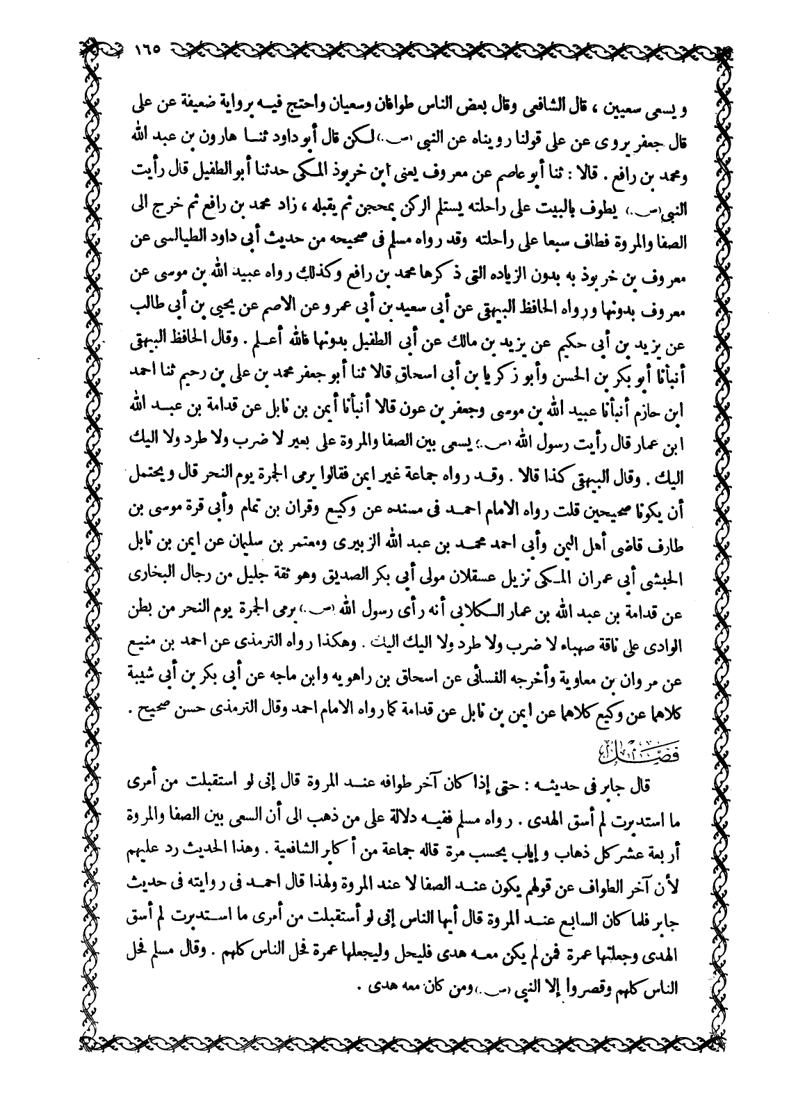 ويسعى سعيين، قَالَ الشَّافِعِيُّ وَقَالَ بَعْضُ النَّاسِ طَوَافَانِ وَسَعْيَانِ وَاحْتَجَّ فِيهِ بِرِوَايَةٍ ضَعِيفَةٍ عَنْ عَلِيٍّ قَالَ جعفر يروى عن على قولنا رويناه عن النبي صلّى الله عليه وسلّم لَكِنْ قَالَ أَبُو دَاوُدَ ثَنَا هَارُونُ بْنُ عَبْدِ اللَّهِ وَمُحَمَّدُ بْنُ رَافِعٍ. قَالَا: ثَنَا أَبُو عَاصِمٍ عَنْ مَعْرُوفٍ يَعْنِي ابْنَ خَرَّبُوذَ الْمَكِّيَّ حَدَّثَنَا أَبُو الطُّفَيْلِ قَالَ رَأَيْتُ النَّبِيَّ صَلَّى اللَّهُ عَلَيْهِ وَسَلَّمَ يَطُوفُ بِالْبَيْتِ عَلَى راحلته يستلم الركن بمحجن ثُمَّ يُقَبِّلُهُ، زَادَ مُحَمَّدُ بْنُ رَافِعٍ ثُمَّ خَرَجَ إِلَى الصَّفَا وَالْمَرْوَةِ فَطَافَ سَبْعًا عَلَى رَاحِلَتِهِ وَقَدْ رَوَاهُ مُسْلِمٌ فِي صَحِيحِهِ مِنْ حَدِيثِ أَبِي دَاوُدَ الطَّيَالِسِيِّ عَنْ مَعْرُوفِ بْنِ خَرَّبُوذَ بِهِ بِدُونِ الزِّيَادَةِ الَّتِي ذَكَرَهَا مُحَمَّدُ بْنُ رَافِعٍ وَكَذَلِكَ رَوَاهُ عُبَيْدُ اللَّهِ بْنُ مُوسَى عَنْ مَعْرُوفٍ بِدُونِهَا وَرَوَاهُ الْحَافِظُ الْبَيْهَقِيُّ عَنْ أَبِي سَعِيدِ بْنِ أَبِي عَمْرٍو عَنِ الْأَصَمِّ عَنْ يَحْيَى بْنِ أَبِي طَالِبٍ عَنْ يَزِيدَ بْنِ أَبِي حَكِيمٍ عَنْ يَزِيدَ بْنِ مالك عَنْ أَبِي الطُّفَيْلِ بِدُونِهَا فاللَّه أَعْلَمُ. وَقَالَ الْحَافِظُ الْبَيْهَقِيُّ أَنْبَأَنَا أَبُو بَكْرِ بْنُ الْحَسَنِ وَأَبُو زَكَرِيَّا بْنُ أَبِي إِسْحَاقَ قَالَا ثَنَا أبو جعفر محمد بن على بن رحيم ثنا احمد ابن حَازِمٍ أَنْبَأَنَا عُبَيْدُ اللَّهِ بْنُ مُوسَى وَجَعْفَرُ بْنُ عَوْنٍ قَالَا أَنْبَأَنَا أَيْمَنُ بْنُ نَابِلٍ عن قدامة بن عبد الله ابن عَمَّارٍ قَالَ رَأَيْتُ رَسُولَ اللَّهِ صَلَّى اللَّهُ عَلَيْهِ وَسَلَّمَ يَسْعَى بَيْنَ الصَّفَا وَالْمَرْوَةِ عَلَى بَعِيرٍ لَا ضَرْبٌ وَلَا طَرْدٌ وَلَا إِلَيْكَ إِلَيْكَ. وَقَالَ الْبَيْهَقِيُّ كَذَا قَالَا. وَقَدْ رَوَاهُ جماعة غير أَيْمَنَ فَقَالُوا يَرْمِي الْجَمْرَةَ يَوْمَ النَّحْرِ قَالَ وَيَحْتَمِلُ أَنْ يَكُونَا صَحِيحَيْنِ قُلْتُ رَوَاهُ الْإِمَامُ أَحْمَدُ فِي مُسْنَدِهِ عَنْ وَكِيعٍ وَقُرَّانَ بْنِ تمام وأبى قرة موسى بن طارف قَاضِي أَهْلِ الْيَمَنِ وَأَبِي أَحْمَدَ مُحَمَّدِ بْنِ عَبْدِ اللَّهِ الزُّبَيْرِيِّ وَمُعْتَمِرِ بْنِ سُلَيْمَانَ عَنْ أَيْمَنَ بْنِ نَابِلٍ الْحَبَشِيِّ أَبِي عِمْرَانَ الْمَكِّيِّ نَزِيلِ عَسْقَلَانَ مَوْلَى أَبِي بَكْرٍ الصِّدِّيقِ وَهُوَ ثِقَةٌ جَلِيلٌ مِنْ رِجَالِ الْبُخَارِيِّ عَنْ قُدَامَةَ بْنِ عَبْدِ اللَّهِ بْنِ عَمَّارٍ الْكِلَابِيِّ أَنَّهُ رَأَى رَسُولُ اللَّهِ صَلَّى اللَّهُ عَلَيْهِ وَسَلَّمَ يَرْمِي الْجَمْرَةَ يَوْمَ النَّحْرِ مِنْ بَطْنِ الْوَادِي عَلَى نَاقَةٍ صَهْبَاءَ لَا ضَرْبٌ وَلَا طَرْدٌ وَلَا إِلَيْكَ إِلَيْكَ. وَهَكَذَا رَوَاهُ التِّرْمِذِيُّ عَنْ أَحْمَدَ بْنِ مَنِيعٍ عَنْ مَرْوَانَ بْنِ مُعَاوِيَةَ وَأَخْرَجَهُ النَّسَائِيُّ عَنْ إِسْحَاقَ بْنِ رَاهَوَيْهِ وَابْنِ مَاجَهْ عَنْ أَبِي بَكْرِ بْنِ أَبِي شَيْبَةَ كِلَاهُمَا عَنْ وَكِيعٍ كِلَاهُمَا عَنْ أَيْمَنَ بْنِ نَابِلٍ عَنْ قُدَامَةَ كَمَا رَوَاهُ الْإِمَامُ أَحْمَدُ وقال الترمذي حسن صحيح.