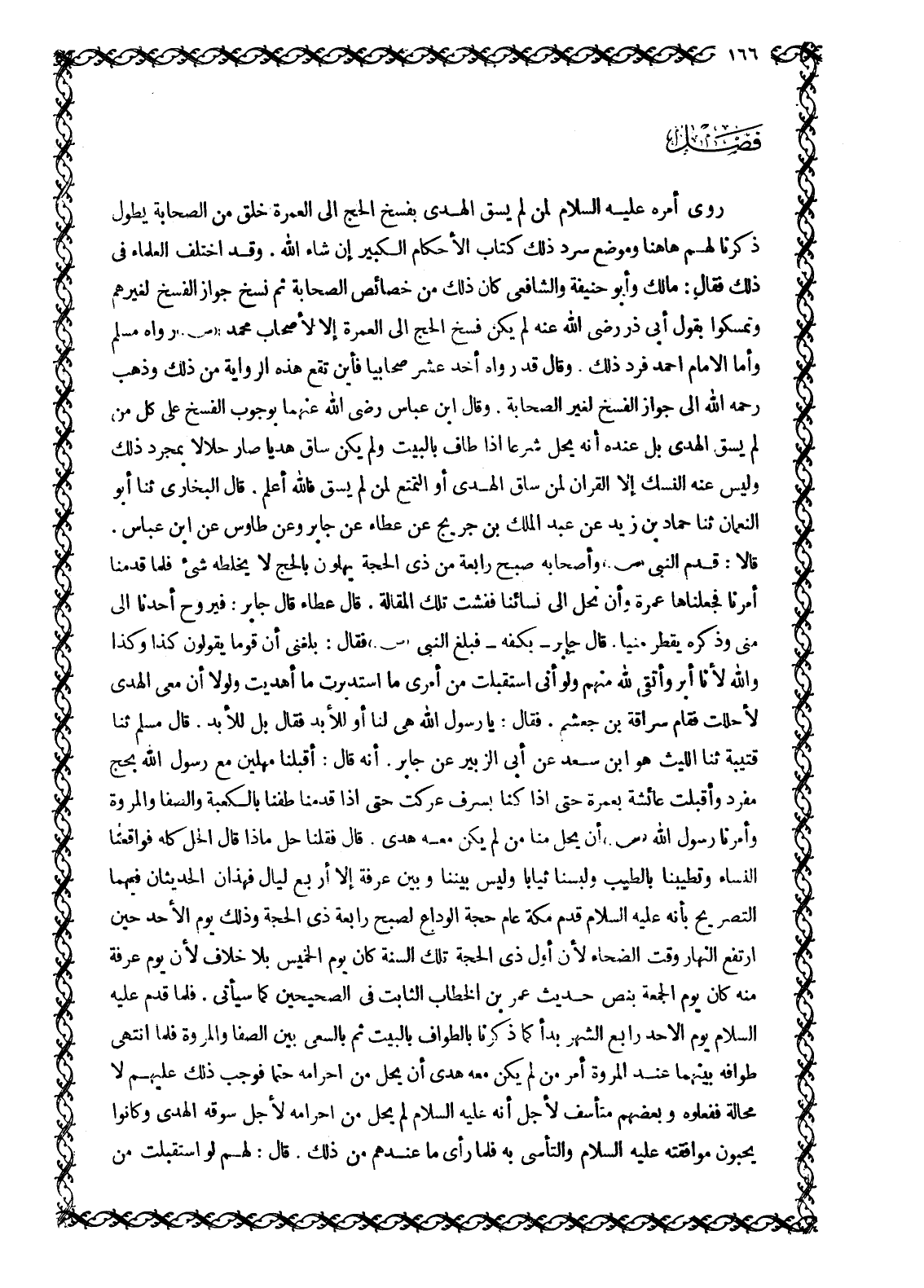روى أمره عليه السلام لِمَنْ لَمْ يَسُقِ الْهَدْيَ بِفَسْخِ الْحَجِّ إِلَى الْعُمْرَةِ خَلْقٌ مِنَ الصَّحَابَةِ يَطُولُ ذِكْرُنَا لَهُمْ ها هنا وَمَوْضِعُ سَرْدِ ذَلِكَ كِتَابُ الْأَحْكَامِ الْكَبِيرِ إِنْ شَاءَ اللَّهُ. وَقَدِ اخْتَلَفَ الْعُلَمَاءُ فِي ذَلِكَ فَقَالَ: مَالِكٌ وَأَبُو حَنِيفَةَ وَالشَّافِعِيُّ كَانَ ذَلِكَ مِنْ خَصَائِصِ الصَّحَابَةِ ثُمَّ نُسِخَ جَوَازُ الْفَسْخِ لِغَيْرِهِمْ وَتَمَسَّكُوا بِقَوْلِ أَبِي ذَرٍّ رَضِيَ اللَّهُ عَنْهُ لَمْ يَكُنْ فَسْخُ الْحَجِّ إِلَى الْعُمْرَةِ إِلَّا لِأَصْحَابِ مُحَمَّدٍ صَلَّى اللَّهُ عَلَيْهِ وَسَلَّمَ رَوَاهُ مُسْلِمٌ وَأَمَّا الْإِمَامُ أَحْمَدُ فَرَدَّ ذَلِكَ. وَقَالَ قَدْ رَوَاهُ أَحَدَ عَشَرَ صَحَابِيًّا فَأَيْنَ تَقَعُ هَذِهِ الرِّوَايَةُ مِنْ ذَلِكَ وَذَهَبَ رَحِمَهُ اللَّهُ إِلَى جَوَازِ الْفَسْخِ لِغَيْرِ الصَّحَابَةِ. وَقَالَ ابْنُ عَبَّاسٍ رَضِيَ اللَّهُ عَنْهُمَا بِوُجُوبِ الْفَسْخِ عَلَى كُلِّ مَنْ لَمْ يَسُقِ الْهَدْيَ بَلْ عِنْدَهُ أَنَّهُ يَحِلُّ شَرْعًا إِذَا طَافَ بِالْبَيْتِ وَلَمْ يَكُنْ سَاقَ هَدْيًا صَارَ حَلَالًا بِمُجَرَّدِ ذلك وليس عنه النُّسُكُ إِلَّا الْقِرَانُ لِمَنْ سَاقَ الْهَدْيَ أَوِ التَّمَتُّعُ لِمَنْ لَمْ يَسُقْ فاللَّه أَعْلَمُ. قَالَ الْبُخَارِيُّ ثَنَا أَبُو النُّعْمَانِ ثَنَا حَمَّادُ بْنُ زَيْدٍ عَنْ عَبْدِ الْمَلِكِ بْنِ جُرَيْجٍ عَنْ عَطَاءٍ عَنْ جَابِرٍ وَعَنْ طَاوُسٍ عَنِ ابْنِ عَبَّاسٍ.