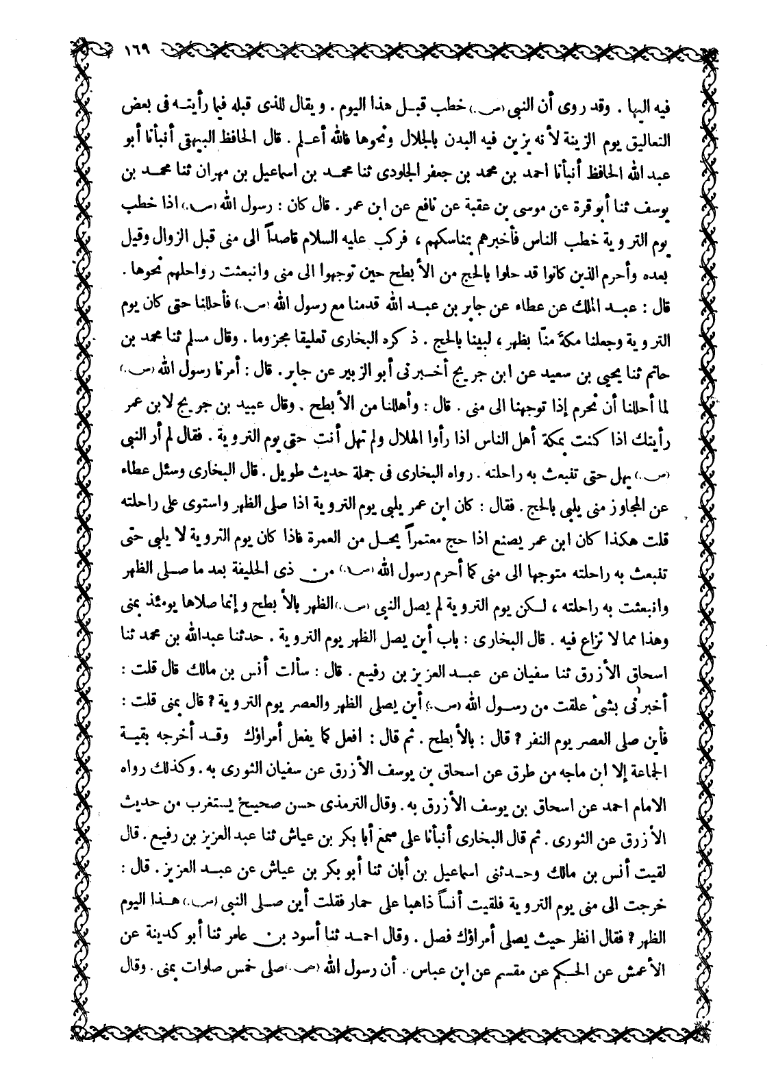 فِيهِ إِلَيْهَا. وَقَدْ رُوِيَ أَنَّ النَّبِيَّ صَلَّى اللَّهُ عَلَيْهِ وَسَلَّمَ خَطَبَ قَبْلَ هَذَا الْيَوْمِ. وَيُقَالُ لِلَّذِي قَبْلَهُ فِيمَا رَأَيْتُهُ فِي بَعْضِ التعاليق يوم الزينة لأنه يزين فِيهِ الْبُدْنُ بِالْجِلَالِ وَنَحْوِهَا فاللَّه أَعْلَمُ. قَالَ الْحَافِظُ الْبَيْهَقِيُّ أَنْبَأَنَا أَبُو عَبْدِ اللَّهِ الْحَافِظُ أَنْبَأَنَا أَحْمَدُ بْنُ مُحَمَّدِ بْنِ جَعْفَرٍ الْجُلُودِيُّ ثَنَا مُحَمَّدُ بْنُ إِسْمَاعِيلَ بْنِ مِهْرَانَ ثَنَا مُحَمَّدُ بْنُ يُوسُفَ ثَنَا أَبُو قُرَّةَ عَنْ مُوسَى بْنِ عُقْبَةَ عَنْ نَافِعٍ عَنِ ابْنِ عُمَرَ. قَالَ كَانَ: رَسُولُ اللَّهِ صَلَّى اللَّهُ عَلَيْهِ وَسَلَّمَ إِذَا خطب يَوْمِ التَّرْوِيَةِ خَطَبَ النَّاسَ فَأَخْبَرَهُمْ بِمَنَاسِكِهِمْ، فَرَكِبَ عليه السلام قَاصِدًا إِلَى مِنًى قَبْلَ الزَّوَالِ وَقِيلَ بَعْدَهُ وَأَحْرَمَ الَّذِينَ كَانُوا قَدْ حَلُّوا بِالْحَجِّ مِنَ الْأَبْطَحِ حِينَ تَوَجَّهُوا إِلَى مِنًى وَانْبَعَثَتْ رَوَاحِلُهُمْ نَحْوَهَا.