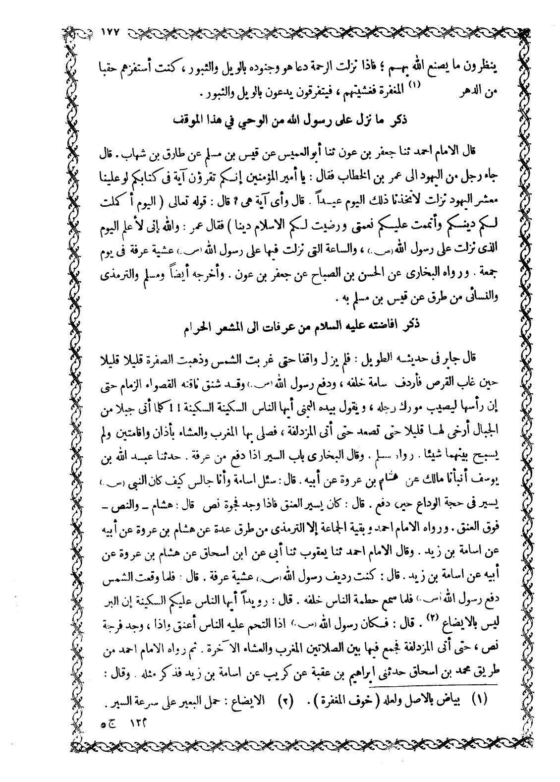قَالَ جَابِرٌ فِي حَدِيثِهِ الطَّوِيلِ: فَلَمْ يَزَلْ وَاقِفًا حَتَّى غربت الشمس وذهبت الصفرة قليلا قَلِيلًا حِينَ غَابَ الْقُرْصُ فَأَرْدَفَ أُسَامَةَ خَلْفَهُ، وَدَفَعَ رَسُولُ اللَّهِ صَلَّى اللَّهُ عَلَيْهِ وَسَلَّمَ وَقَدْ شنق ناقته القصواء الزمام حتى إن رأسها ليصيب مورك رجله، ويقول بيده اليمنى أيها الناس السكينة السكينة!! كُلَّمَا أَتَى جَبَلًا مِنَ الْجِبَالِ أَرْخَى لَهَا قَلِيلًا حَتَّى تَصْعَدَ حَتَّى أَتَى الْمُزْدَلِفَةَ، فَصَلَّى بِهَا الْمَغْرِبَ وَالْعِشَاءَ بِأَذَانٍ وَإِقَامَتَيْنِ وَلَمْ يُسَبِّحْ بَيْنَهُمَا شَيْئًا. رَوَاهُ مُسْلِمٌ. وَقَالَ الْبُخَارِيُّ بَابُ السَّيْرِ إِذَا دَفَعَ مِنْ عَرَفَةَ. حَدَّثَنَا عَبْدُ اللَّهِ بْنُ يُوسُفَ أَنْبَأَنَا مَالِكٌ عَنْ هِشَامِ بْنِ عُرْوَةَ عَنْ أَبِيهِ. قَالَ: سُئِلَ أُسَامَةُ وَأَنَا جَالِسٌ كَيْفَ كَانَ النَّبِيُّ صَلَّى اللَّهُ عَلَيْهِ وَسَلَّمَ يَسِيرُ فِي حَجَّةِ الْوَدَاعِ حِينَ دَفَعَ. قَالَ: كَانَ يَسِيرُ الْعَنَقَ فَإِذَا وَجَدَ فَجْوَةً نَصَّ. قَالَ: هِشَامٌ- وَالنَّصُّ- فَوْقَ الْعَنَقِ. وَرَوَاهُ الْإِمَامُ أَحْمَدُ وَبَقِيَّةُ الْجَمَاعَةِ إِلَّا التِّرْمِذِيَّ مِنْ طُرُقٍ عِدَّةٍ عَنْ هِشَامِ بْنِ عُرْوَةَ عَنْ أَبِيهِ عَنْ اسامة بن زيد. وَقَالَ الْإِمَامُ أَحْمَدُ ثَنَا يَعْقُوبُ ثَنَا أَبِي عَنِ ابْنِ إِسْحَاقَ عَنْ هِشَامِ بْنِ عُرْوَةَ عَنْ أَبِيهِ عَنْ أُسَامَةَ بْنِ زَيْدٍ. قَالَ: كُنْتُ رَدِيفِ رَسُولِ اللَّهِ صَلَّى اللَّهُ عَلَيْهِ وَسَلَّمَ عَشِيَّةَ عَرَفَةَ. قَالَ: فَلَمَّا وَقَعَتِ الشَّمْسُ دَفَعَ رَسُولُ اللَّهِ صَلَّى اللَّهُ عَلَيْهِ وَسَلَّمَ فَلَمَّا سَمِعَ حَطْمَةَ النَّاسِ خَلْفَهُ. قَالَ: رُوَيْدًا أَيُّهَا النَّاسُ عَلَيْكُمُ السَّكِينَةَ إِنَّ الْبِرَّ لَيْسَ بِالْإِيضَاعِ [2] . قَالَ: فَكَانَ رَسُولُ اللَّهِ صَلَّى اللَّهُ عَلَيْهِ وَسَلَّمَ إِذَا الْتَحَمَ عَلَيْهِ النَّاسُ أَعْنَقَ وَإِذَا، وَجَدَ فُرَجَةً نَصَّ، حَتَّى أَتَى الْمُزْدَلِفَةَ فجمع فيها بَيْنَ الصَّلَاتَيْنِ الْمَغْرِبِ وَالْعِشَاءِ الْآخِرَةِ. ثُمَّ رَوَاهُ الْإِمَامُ أَحْمَدُ مِنْ طَرِيقِ مُحَمَّدِ بْنِ إِسْحَاقَ حَدَّثَنِي إِبْرَاهِيمُ بْنُ عُقْبَةَ عَنْ كُرَيْبٍ عَنْ اسامة بن زيد فذكر مثله. وقال: