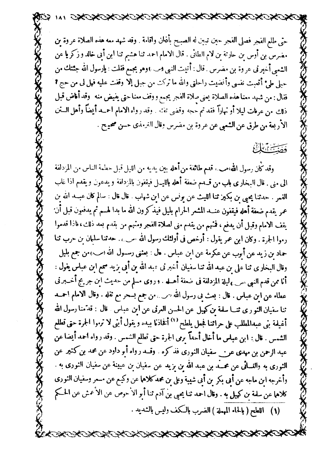 حَتَّى طَلَعَ الْفَجْرُ فَصَلَّى الْفَجْرَ حِينَ تَبَيَّنَ لَهُ الصُّبْحُ بِأَذَانٍ وَإِقَامَةٍ. وَقَدْ شَهِدَ مَعَهُ هَذِهِ الصَّلَاةَ عُرْوَةُ بْنُ مُضَرِّسِ بْنِ أَوْسِ بْنِ حَارِثَةَ بْنِ لَامٍ الطَّائِيُّ. قَالَ الْإِمَامُ أَحْمَدُ ثَنَا هُشَيْمٌ ثَنَا ابْنُ أَبِي خَالِدٍ وَزَكَرِيَّا عَنِ الشَّعْبِيِّ أَخْبَرَنِي عُرْوَةُ بْنُ مُضَرِّسٍ. قَالَ: أَتَيْتُ النَّبِيَّ صَلَّى اللَّهُ عَلَيْهِ وَسَلَّمَ وَهُوَ بِجَمْعٍ فَقُلْتُ: يَا رَسُولَ اللَّهِ جِئْتُكَ من جبلي طيِّئ أتعبت نفسي وأنضيت رَاحِلَتِي وَاللَّهِ مَا تَرَكْتُ مِنْ جَبَلٍ إِلَّا وَقَفْتُ عَلَيْهِ فَهَلْ لِي مِنْ حَجٍّ؟