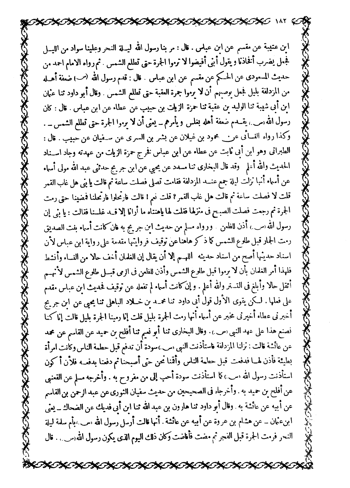 ابن عُتَيْبَةَ عَنْ مِقْسَمٍ عَنِ ابْنِ عَبَّاسٍ. قَالَ: مر بنا رسول الله لَيْلَةَ النَّحْرِ وَعَلَيْنَا سَوَادٌ مِنَ اللَّيْلِ فَجَعَلَ يضرب أفخاذنا ويقول أبني أفيضوا لا تَرْمُوا الْجَمْرَةَ حَتَّى تَطْلُعَ الشَّمْسُ. ثُمَّ رَوَاهُ الْإِمَامُ أَحْمَدُ مِنْ حَدِيثِ الْمَسْعُودِيِّ عَنِ الْحَكَمِ عَنْ مِقْسَمٍ عَنِ ابْنِ عَبَّاسٍ. قَالَ: قَدِمَ رَسُولُ اللَّهِ صَلَّى اللَّهُ عَلَيْهِ وَسَلَّمَ ضَعَفَةَ أهله من المزدلفة بليل فجعل يوصيهم أن لا يَرْمُوا جَمْرَةَ الْعَقَبَةِ حَتَّى تَطْلُعَ الشَّمْسُ. وَقَالَ أبو داود ثنا عثمان ابن أَبِي شَيْبَةَ ثَنَا الْوَلِيدُ بْنُ عُقْبَةَ ثَنَا حمزة الزيات بن حَبِيبٍ عَنْ عَطَاءٍ عَنِ ابْنِ عَبَّاسٍ. قَالَ: كَانَ رَسُولُ اللَّهِ صَلَّى اللَّهُ عَلَيْهِ وَسَلَّمَ يقدم ضعفة أهله بغلس ويأمرهم- يعنى أن لا يَرْمُوا الْجَمْرَةَ حَتَّى تَطْلُعَ الشَّمْسُ-.
