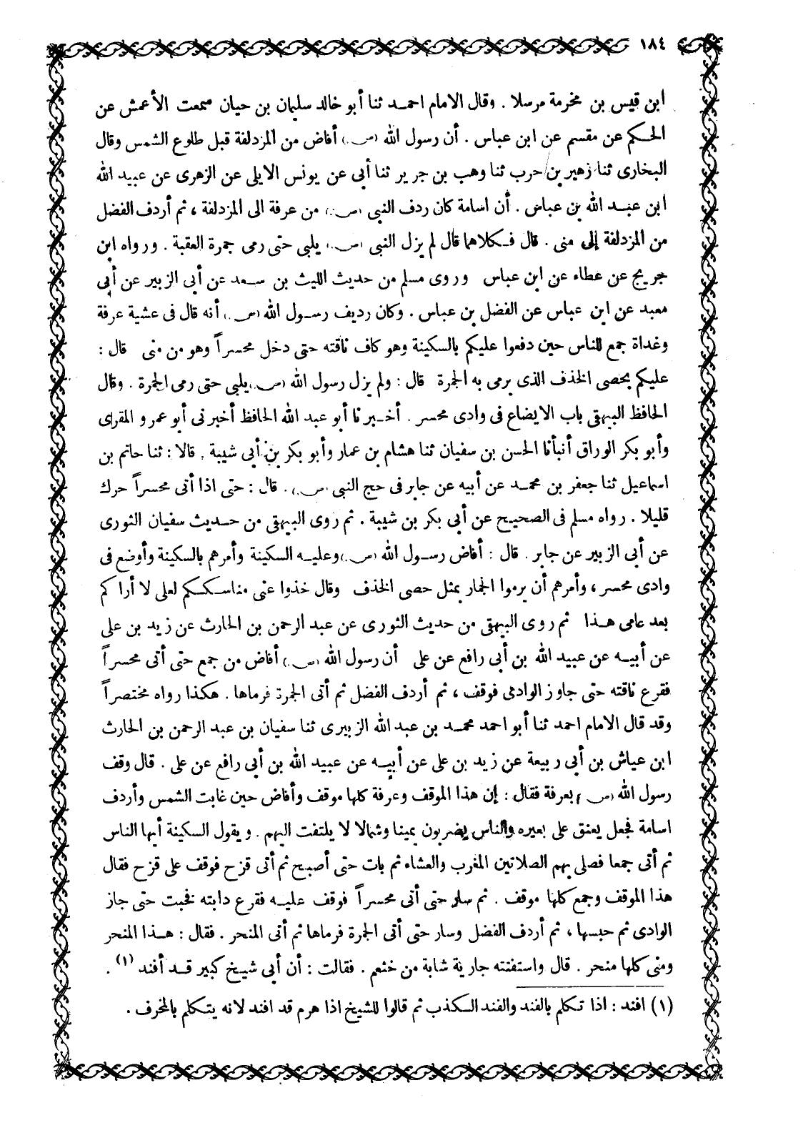 ابن قَيْسِ بْنِ مَخْرَمَةَ مُرْسَلًا. وَقَالَ الْإِمَامُ أَحْمَدُ ثنا أبو خالد سليمان بن حيان سَمِعْتُ الْأَعْمَشَ عَنِ الْحَكَمِ عَنْ مِقْسَمٍ عَنِ ابْنِ عَبَّاسٍ. أَنَّ رَسُولَ اللَّهِ صَلَّى اللَّهُ عَلَيْهِ وَسَلَّمَ أَفَاضَ مِنَ الْمُزْدَلِفَةِ قَبْلَ طُلُوعِ الشَّمْسِ وَقَالَ الْبُخَارِيُّ ثَنَا زُهَيْرُ بْنُ حَرْبٍ ثَنَا وَهْبُ بْنُ جَرِيرٍ ثَنَا أَبِي عَنْ يُونُسَ الْأَيْلِيِّ عَنِ الزُّهْرِيِّ عَنْ عُبَيْدِ اللَّهِ ابن عبد الله بن عباس. أن اسامة كَانَ رِدْفَ النَّبِيِّ صَلَّى اللَّهُ عَلَيْهِ وَسَلَّمَ مِنْ عَرَفَةَ إِلَى الْمُزْدَلِفَةِ، ثُمَّ أَرْدَفَ الْفَضْلَ مِنَ الْمُزْدَلِفَةِ إِلَى مِنًى. قَالَ فَكِلَاهُمَا قَالَ لَمْ يَزَلِ النَّبِيُّ صَلَّى اللَّهُ عَلَيْهِ وَسَلَّمَ يُلَبِّي حَتَّى رَمَى جَمْرَةَ الْعَقَبَةِ. وَرَوَاهُ ابْنِ جُرَيْجٍ عَنْ عَطَاءٍ عَنِ ابْنِ عَبَّاسٍ وَرَوَى مُسْلِمٌ مِنْ حَدِيثِ اللَّيْثُ بْنُ سَعْدٍ عَنْ أَبِي الزُّبَيْرِ عَنْ أَبِي مَعْبَدٍ عَنِ ابْنِ عَبَّاسٍ عَنِ الْفَضْلِ بْنِ عَبَّاسٍ. وَكَانَ رَدِيفِ رَسُولِ اللَّهِ صَلَّى اللَّهُ عَلَيْهِ وَسَلَّمَ أَنَّهُ قَالَ فِي عَشِيَّةِ عَرَفَةَ وَغَدَاةِ جَمْعٍ لِلنَّاسِ حِينَ دَفَعُوا عَلَيْكُمْ بِالسَّكِينَةِ وَهُوَ كَافٌّ نَاقَتَهُ حَتَّى دَخَلَ مُحَسِّرًا وَهُوَ مِنْ مِنًى. قَالَ:
