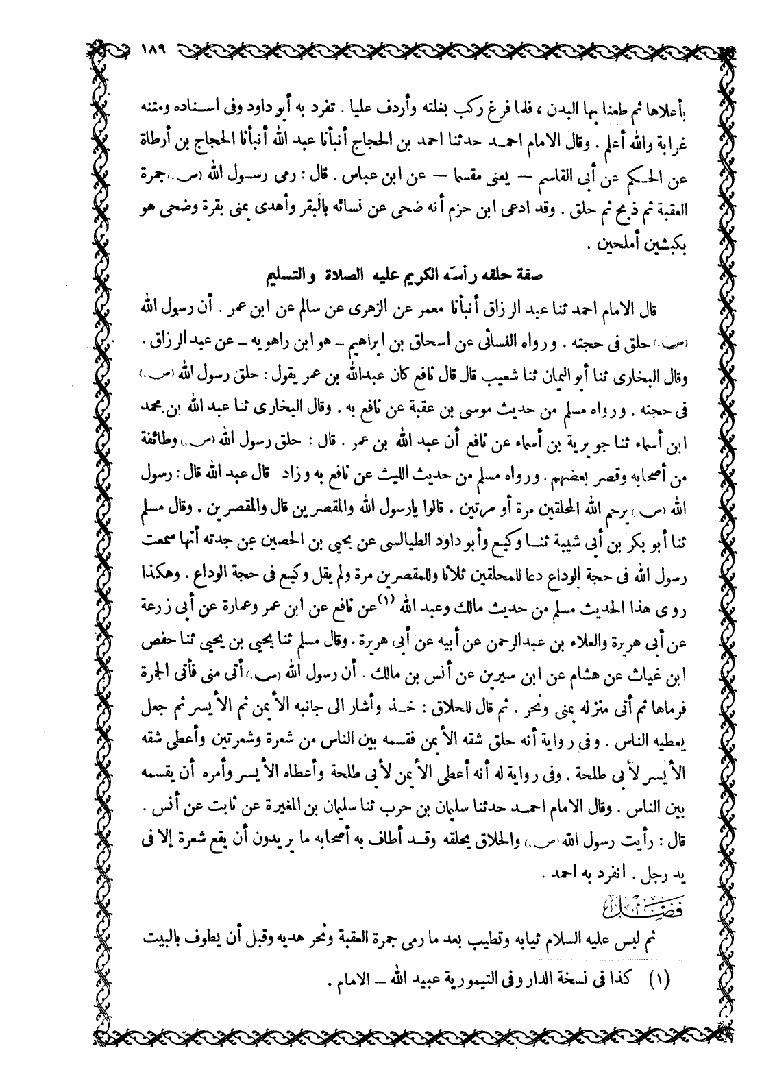 قَالَ الْإِمَامُ أَحْمَدُ ثَنَا عَبْدُ الرَّزَّاقِ أَنْبَأَنَا مَعْمَرٌ عَنِ الزُّهْرِيِّ عَنْ سَالِمٍ عَنِ ابْنِ عُمَرَ. أَنَّ رَسُولَ اللَّهِ صَلَّى اللَّهُ عَلَيْهِ وَسَلَّمَ حَلَقَ فِي حَجَّتِهِ. وَرَوَاهُ النَّسَائِيُّ عَنْ إِسْحَاقَ بْنِ إِبْرَاهِيمَ- هُوَ ابْنُ رَاهَوَيْهِ- عَنْ عَبْدِ الرَّزَّاقِ. وَقَالَ الْبُخَارِيُّ ثَنَا أَبُو الْيَمَانِ ثَنَا شُعَيْبٌ قَالَ قَالَ نَافِعٌ كَانَ عَبْدُ اللَّهِ بْنُ عُمَرَ يَقُولُ: حَلَقَ رَسُولُ اللَّهِ صَلَّى اللَّهُ عَلَيْهِ وَسَلَّمَ فِي حَجَّتِهِ. وَرَوَاهُ مُسْلِمٌ مِنْ حَدِيثِ مُوسَى بْنِ عُقْبَةَ عَنْ نَافِعٍ بِهِ. وَقَالَ الْبُخَارِيُّ ثَنَا عَبْدُ اللَّهِ بْنُ مُحَمَّدٍ ابن أَسْمَاءَ ثَنَا جُوَيْرِيَةُ بْنُ أَسْمَاءَ عَنْ نَافِعٍ أَنَّ عَبْدَ اللَّهِ بْنَ عُمَرَ. قَالَ: حَلَقَ رَسُولُ اللَّهِ صَلَّى اللَّهُ عَلَيْهِ وَسَلَّمَ وَطَائِفَةٌ مِنْ أَصْحَابِهِ وَقَصَّرَ بَعْضُهُمْ. وَرَوَاهُ مُسْلِمٌ مِنْ حَدِيثِ اللَّيْثِ عَنْ نَافِعٍ بِهِ وَزَادَ قَالَ عَبْدِ اللَّهِ قَالَ: رَسُولُ اللَّهِ صَلَّى اللَّهُ عَلَيْهِ وَسَلَّمَ يَرْحَمُ اللَّهُ الْمُحَلِّقِينَ مَرَّةً أَوْ مرتين. قالوا يا رسول الله والمقصرين قَالَ وَالْمُقَصِّرِينَ. وَقَالَ مُسْلِمٌ ثَنَا أَبُو بَكْرِ بْنُ أَبِي شَيْبَةَ ثَنَا وَكِيعٌ وَأَبُو دَاوُدَ الطيالسي عَنْ يَحْيَى بْنِ الْحُصَيْنِ عَنْ جَدَّتِهِ أَنَّهَا سمعت رسول الله فِي حَجَّةِ الْوَدَاعِ دَعَا لِلْمُحَلِّقِينَ ثَلَاثًا وَلِلْمُقَصِّرِينَ مَرَّةً وَلَمْ يَقُلْ وَكِيعٌ فِي حَجَّةِ الْوَدَاعِ. وَهَكَذَا رَوَى هَذَا الْحَدِيثَ مُسْلِمٌ مِنْ حَدِيثِ مالك وعبد اللَّهِ [1] عَنْ نَافِعٍ عَنِ ابْنِ عُمَرَ وَعُمَارَةَ عَنْ أَبِي زُرْعَةَ عَنْ أَبِي هُرَيْرَةَ وَالْعَلَاءِ بْنِ عَبْدِ الرَّحْمَنِ عَنْ أَبِيهِ عَنْ أَبِي هُرَيْرَةَ. وَقَالَ مُسْلِمٌ ثَنَا يَحْيَى بْنُ يَحْيَى ثنا حفص ابن غِيَاثٍ عَنْ هِشَامٍ عَنِ ابْنِ سِيرِينَ عَنْ أَنَسِ بْنِ مَالِكٍ. أَنَّ رَسُولَ اللَّهِ صَلَّى اللَّهُ عَلَيْهِ وَسَلَّمَ أَتَى مِنًى فَأَتَى الْجَمْرَةَ فَرَمَاهَا ثُمَّ أَتَى مَنْزِلَهُ بِمِنًى وَنَحَرَ. ثُمَّ قَالَ لِلْحَلَّاقِ: خُذْ وَأَشَارَ إِلَى جَانِبِهِ الْأَيْمَنِ ثُمَّ الْأَيْسَرِ ثُمَّ جَعَلَ يُعْطِيهِ النَّاسَ. وَفِي رواية أَنَّهُ حَلَقَ شِقَّهُ الْأَيْمَنَ فَقَسَمَهُ بَيْنَ النَّاسِ مِنْ شَعْرَةٍ وَشَعْرَتَيْنِ وَأَعْطَى شِقَّهُ الْأَيْسَرَ لِأَبِي طَلْحَةَ. وَفِي رِوَايَةٍ لَهُ أَنَّهُ أَعْطَى الْأَيْمَنَ لِأَبِي طَلْحَةَ وَأَعْطَاهُ الْأَيْسَرَ وَأَمَرَهُ أَنْ يَقْسِمَهُ بَيْنَ النَّاسِ. وَقَالَ الْإِمَامُ أَحْمَدُ حَدَّثَنَا سُلَيْمَانُ بْنُ حَرْبٍ ثَنَا سُلَيْمَانَ بْنِ الْمُغِيرَةِ عَنْ ثَابِتٍ عَنْ أَنَسٍ.