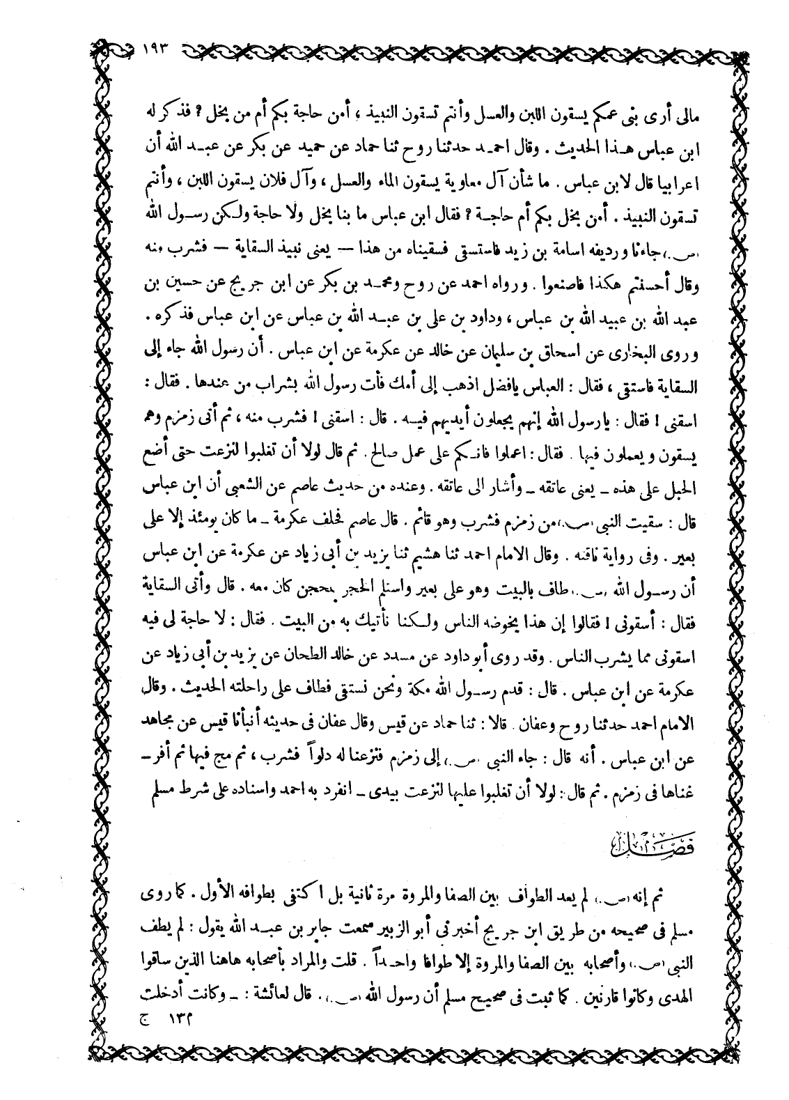 ما لي أَرَى بَنِي عَمِّكُمْ يَسْقُونَ اللَّبْنَ وَالْعَسَلَ وَأَنْتُمْ تَسْقُونَ النَّبِيذَ، أَمِنْ حَاجَةٍ بِكُمْ أَمْ مِنْ بُخْلٍ؟ فَذَكَرَ لَهُ ابْنُ عَبَّاسٍ هَذَا الْحَدِيثَ. وَقَالَ أَحْمَدُ حَدَّثَنَا رَوْحٌ ثَنَا حَمَّادٌ عَنْ حُمَيْدٍ عَنْ بَكْرٍ عَنْ عَبْدِ اللَّهِ أَنَّ أَعْرَابِيًّا قَالَ لِابْنِ عَبَّاسٍ. مَا شَأْنُ آلِ مُعَاوِيَةَ يَسْقُونَ الْمَاءَ وَالْعَسَلَ، وَآلِ فُلَانٍ يَسْقُونَ اللَّبَنَ، وَأَنْتُمْ تَسْقُونَ النَّبِيذَ. أَمِنْ بُخْلٍ بِكُمْ أم حَاجَةٍ؟ فَقَالَ ابْنُ عَبَّاسٍ مَا بِنَا بُخْلٌ وَلَا حَاجَةٌ وَلَكِنَّ رَسُولَ اللَّهِ صَلَّى اللَّهُ عَلَيْهِ وَسَلَّمَ جَاءَنَا وَرَدِيفُهُ أُسَامَةُ بْنُ زَيْدٍ فَاسْتَسْقَى فَسَقَيْنَاهُ مِنْ هَذَا- يَعْنِي نَبِيذَ السِّقَايَةِ- فَشَرِبَ مِنْهُ وَقَالَ أَحْسَنْتُمْ هَكَذَا فَاصْنَعُوا. وَرَوَاهُ أَحْمَدُ عَنْ رَوْحٍ وَمُحَمَّدِ بْنِ بَكْرٍ عَنِ ابن جريج عن حُسَيْنُ بْنُ عَبْدِ اللَّهِ بْنِ عُبَيْدِ اللَّهِ بْنِ عَبَّاسٍ، وَدَاوُدَ بْنِ عَلِيِّ بْنِ عَبْدِ اللَّهِ بْنِ عَبَّاسٍ عَنْ ابْنِ عَبَّاسٍ فَذَكَرَهُ.