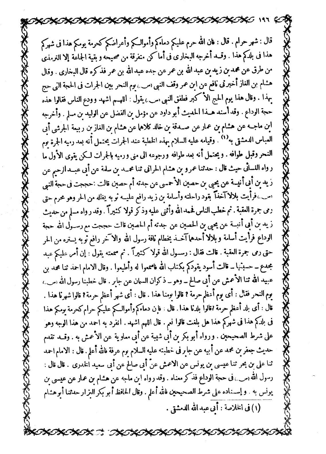 قَالَ: شَهْرٌ حَرَامٌ. قَالَ: فَإِنَّ اللَّهَ حَرَّمَ عَلَيْكُمْ دِمَاءَكُمْ وَأَمْوَالَكُمْ وَأَعْرَاضَكُمْ كَحُرْمَةِ يَوْمِكُمْ هَذَا فِي شَهْرِكُمْ هَذَا فِي بَلَدِكُمْ هَذَا. وَقَدْ أَخْرَجَهُ الْبُخَارِيُّ فِي أَمَاكِنَ مُتَفَرِّقَةٍ مِنْ صَحِيحِهِ وَبَقِيَّةُ الْجَمَاعَةِ إِلَّا التِّرْمِذِيَّ مِنْ طُرُقٍ عَنْ مُحَمَّدِ بْنِ زَيْدِ بْنِ عَبْدِ اللَّهِ بْنِ عُمَرَ عَنْ جَدِّهِ عَبْدِ اللَّهِ بْنِ عُمَرَ فَذَكَرَهُ قَالَ الْبُخَارِيُّ. وَقَالَ هِشَامُ بْنُ الْغَازِ أخبرنى نافع عن ابن عمر وَقَفَ النَّبِيُّ صَلَّى اللَّهُ عَلَيْهِ وَسَلَّمَ يَوْمَ النَّحْرِ بَيْنَ الْجَمَرَاتِ فِي الْحَجَّةِ الَّتِي حَجَّ بِهَذَا. وَقَالَ هَذَا يَوْمُ الْحَجِّ الْأَكْبَرِ فَطَفِقَ النَّبِيُّ صَلَّى اللَّهُ عَلَيْهِ وَسَلَّمَ يَقُولُ: اللَّهمّ اشْهَدْ وَوَدَّعَ النَّاسَ فَقَالُوا هَذِهِ حَجَّةُ الْوَدَاعِ. وَقَدْ أَسْنَدَ هَذَا الْحَدِيثَ أَبُو دَاوُدَ عَنْ مُؤَمَّلِ بْنِ الْفَضْلِ عَنِ الْوَلِيدِ بْنِ مُسْلِمٍ. وَأَخْرَجَهُ ابْنُ مَاجَهْ عَنْ هِشَامِ بْنِ عَمَّارٍ عَنْ صَدَقَةَ بْنِ خَالِدٍ كِلَاهُمَا عَنْ هِشَامِ بْنِ الْغَازِ بْنِ رَبِيعَةَ الْجُرَشِيِّ أَبِي الْعَبَّاسِ الدمشقيّ به [1] . وقيامه عليه السلام بِهَذِهِ الْخُطْبَةِ عِنْدَ الْجَمَرَاتِ يَحْتَمِلُ أَنَّهُ بَعْدَ رَمْيِهِ الْجَمْرَةَ يَوْمَ النَّحْرِ وَقَبْلَ طَوَافِهِ. وَيَحْتَمِلُ أنه بعد طوافه ورجوعه الى منى ورميه بِالْجَمَرَاتِ لَكِنْ يُقَوِّي الْأَوَّلَ مَا رَوَاهُ النَّسَائِيُّ حَيْثُ قَالَ: حَدَّثَنَا عَمْرُو بْنُ هِشَامٍ الْحَرَّانِيُّ ثَنَا مُحَمَّدُ بْنُ سَلَمَةَ عَنْ أَبِي عَبْدِ الرَّحِيمِ عَنْ زَيْدِ بْنِ أَبِي أُنَيْسَةَ عَنْ يحيى بن حصين الْأَحْمَسِيِّ عَنْ جَدَّتِهِ أُمِّ حُصَيْنٍ قَالَتْ: حَجَجْتُ فِي حَجَّةِ النَّبِيِّ صَلَّى اللَّهُ عَلَيْهِ وَسَلَّمَ فرأيت بلالا آخذا بقود رَاحِلَتِهِ وَأُسَامَةُ بْنُ زَيْدٍ رَافِعٌ عَلَيْهِ ثَوْبَهُ يُظِلُّهُ مِنَ الْحَرِّ وَهُوَ مُحْرِمٌ حَتَّى رَمَى جَمْرَةَ الْعَقَبَةِ. ثُمَّ خَطَبَ النَّاسَ فَحَمِدَ اللَّهَ وَأَثْنَى عَلَيْهِ وَذَكَرَ قَوْلًا كَثِيرًا. وَقَدْ رَوَاهُ مُسْلِمٌ مِنْ حَدِيثِ زَيْدِ بْنِ أَبِي أُنَيْسَةَ عَنْ يَحْيَى بْنِ الْحُصَيْنِ عَنْ جَدَّتِهِ أُمِّ الحصين قالت حججت مع رسول الله حَجَّةَ الْوَدَاعِ فَرَأَيْتُ أُسَامَةَ وَبِلَالًا أَحَدُهُمَا آخِذٌ بخطام ناقة رسول الله وَالْآخَرُ رَافِعٌ ثَوْبَهُ يَسْتُرُهُ مِنَ الْحَرِّ حَتَّى رَمَى جَمْرَةَ الْعَقَبَةِ. قَالَتْ فَقَالَ: رَسُولُ اللَّهِ قَوْلًا كَثِيرًا. ثُمَّ سَمِعْتُهُ يَقُولُ: إِنَّ أُمِّرَ عَلَيْكُمْ عَبْدٌ مُجَدَّعٌ- حَسِبْتُهَا- قَالَتْ أَسْوَدُ يَقُودُكُمْ بكتاب الله فَاسْمَعُوا لَهُ وَأَطِيعُوا. وَقَالَ الْإِمَامُ أَحْمَدُ ثَنَا محمد بن عبيد الله ثَنَا الْأَعْمَشُ عَنْ أَبِي صَالِحٍ- وَهُوَ- ذَكْوَانُ السَّمَّانُ عَنْ جَابِرٍ. قَالَ خَطَبَنَا رَسُولُ اللَّهِ صَلَّى اللَّهُ عَلَيْهِ وَسَلَّمَ يَوْمَ النَّحْرِ فَقَالَ: أَيُّ يَوْمٍ أَعْظَمُ حُرْمَةً؟ قَالُوا يَوْمُنَا هَذَا. قَالَ: أَيُّ شَهْرٍ أَعْظَمُ حُرْمَةً؟ قَالُوا شَهْرُنَا هَذَا.
