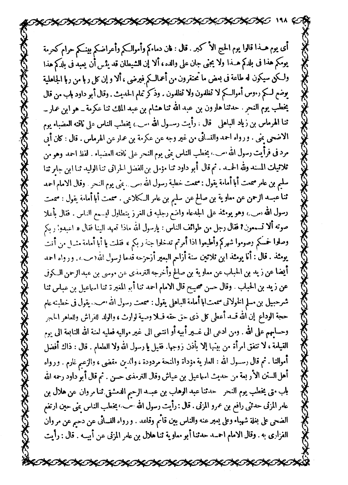 أي يوم هذا قالوا يَوْمُ الْحَجِّ الْأَكْبَرِ. قَالَ: فَإِنَّ دِمَاءَكُمْ وَأَمْوَالَكُمْ وَأَعْرَاضَكُمْ بَيْنَكُمْ حَرَامٌ كَحُرْمَةِ يَوْمِكُمْ هَذَا فِي بلدكم هذا ولا يجنى جان عَلَى وَالِدِهِ، أَلَا إِنَّ الشَّيْطَانَ قَدْ يَئِسَ أن يعبد في بلدكم هذا وَلَكِنْ سَيَكُونُ لَهُ طَاعَةٌ فِي بَعْضِ مَا تَحْتَقِرُونَ مِنْ أَعْمَالِكُمْ فَيَرْضَى، أَلَا وَإِنَّ كُلَّ رِبًا مِنْ رِبَا الْجَاهِلِيَّةِ يُوضَعُ لَكُمْ رُءُوسُ أَمْوَالِكُمْ لَا تَظْلِمُونَ وَلَا تُظْلَمُونَ. وَذَكَرَ تَمَامَ الْحَدِيثِ. وَقَالَ أَبُو دَاوُدَ بَابُ مَنْ قَالَ يخطب يَوْمَ النَّحْرِ. حَدَّثَنَا هَارُونُ بْنُ عَبْدِ اللَّهِ ثَنَا هِشَامُ بْنُ عَبْدِ الْمَلِكِ ثَنَا عِكْرِمَةُ- هُوَ ابْنُ عَمَّارٍ- ثَنَا الْهِرْمَاسُ بْنُ زِيَادٍ الْبَاهِلِيُّ قَالَ: رَأَيْتُ رَسُولَ اللَّهِ صَلَّى اللَّهُ عَلَيْهِ وَسَلَّمَ يَخْطُبُ النَّاسَ عَلَى نَاقَتِهِ الْعَضْبَاءِ يَوْمَ الْأَضْحَى بِمِنًى. وَرَوَاهُ أَحْمَدُ وَالنَّسَائِيُّ مِنْ غَيْرِ وَجْهٍ عَنْ عِكْرِمَةَ بْنِ عَمَّارٍ عَنِ الهرماس. قال: كان أبى مرد في فَرَأَيْتُ رَسُولَ اللَّهِ صَلَّى اللَّهُ عَلَيْهِ وَسَلَّمَ يَخْطُبُ النَّاسَ بِمِنًى يَوْمَ النَّحْرِ عَلَى نَاقَتِهِ الْعَضْبَاءِ. لَفْظُ أَحْمَدَ وَهُوَ مِنْ ثُلَاثِيَّاتِ الْمُسْنَدِ وللَّه الْحَمْدُ. ثُمَّ قَالَ أَبُو دَاوُدَ ثَنَا مُؤَمَّلُ بْنُ الْفَضْلِ الْحَرَّانِيُّ ثَنَا الْوَلِيدُ ثَنَا ابْنُ جَابِرٍ ثَنَا سُلَيْمُ بْنُ عَامِرٍ سَمِعْتُ أَبَا أُمَامَةَ يَقُولُ: سَمِعْتُ خُطْبَةِ رَسُولِ اللَّهِ صَلَّى اللَّهُ عَلَيْهِ وَسَلَّمَ بِمِنًى يَوْمَ النَّحْرِ. وَقَالَ الْإِمَامُ أَحْمَدُ ثَنَا عَبْدُ الرَّحْمَنِ عَنْ مُعَاوِيَةَ بْنِ صَالِحٍ عَنْ سُلَيْمِ بْنِ عَامِرٍ الْكَلَاعِيِّ. سَمِعْتُ أَبَا أُمَامَةَ يَقُولُ: سَمِعْتُ رَسُولَ اللَّهِ صَلَّى اللَّهُ عَلَيْهِ وَسَلَّمَ وَهُوَ يَوْمَئِذٌ عَلَى الْجَدْعَاءِ وَاضِعٌ رِجْلَيْهِ فِي الْغَرْزِ يَتَطَاوَلُ ليسمع النَّاسَ. فَقَالَ بِأَعْلَى صَوْتِهِ أَلَا تَسْمَعُونَ؟ فَقَالَ رَجُلٌ مِنْ طَوَائِفِ النَّاسِ: يَا رَسُولَ اللَّهِ مَاذَا تَعْهَدُ إِلَيْنَا فَقَالَ «اعْبُدُوا رَبَّكُمْ وَصَلُّوا خمسكم وصوموا شهركم وأطيعوا إذا أمرتم تَدْخُلُوا جَنَّةَ رَبِّكُمْ» فَقُلْتُ يَا أَبَا أُمَامَةَ مِثْلُ مَنْ أَنْتَ يَوْمَئِذٍ. قَالَ: أَنَا يَوْمَئِذٍ ابن ثلاثين سنة أزاحم البعير أزحزحه قدما لِرَسُولِ اللَّهِ صَلَّى اللَّهُ عَلَيْهِ وَسَلَّمَ. وَرَوَاهُ أَحْمَدُ أَيْضًا عَنْ زَيْدِ بْنِ الْحُبَابِ عَنْ مُعَاوِيَةَ بْنِ صَالِحٍ وَأَخْرَجَهُ التِّرْمِذِيُّ عَنْ مُوسَى بْنِ عَبْدِ الرَّحْمَنِ الْكُوفِيِّ عَنْ زَيْدِ بْنِ الْحُبَابِ. وَقَالَ حَسَنٌ صَحِيحٌ قَالَ الْإِمَامُ أَحْمَدُ ثَنَا أَبُو الْمُغِيرَةِ ثَنَا إسماعيل بن عباس ثَنَا شُرَحْبِيلُ بْنُ مُسْلِمٍ الْخَوْلَانِيُّ سَمِعْتُ أَبَا أُمَامَةَ الْبَاهِلِيَّ يَقُولُ: سَمِعْتُ رَسُولَ اللَّهِ صَلَّى اللَّهُ عَلَيْهِ وَسَلَّمَ يَقُولُ فِي خُطْبَتِهِ عَامَ حَجَّةِ الْوَدَاعِ إِنَّ اللَّهَ قَدْ أَعْطَى كُلَّ ذِي حَقٍّ حَقَّهُ فَلَا وَصِيَّةَ لِوَارِثٍ، وَالْوَلَدُ لِلْفِرَاشِ وَلِلْعَاهِرِ الْحَجَرُ وَحِسَابُهُمْ عَلَى اللَّهِ. وَمَنِ ادَّعَى إِلَى غَيْرِ أَبِيهِ أَوِ انْتَمَى إِلَى غَيْرِ مَوَالِيهِ فَعَلَيْهِ لَعْنَةُ اللَّهِ التَّابِعَةُ إِلَى يوم القيامة، لا تنفق امرأة مِنْ بَيْتِهَا إِلَّا بِإِذْنِ زَوْجِهَا. فَقِيلَ يَا رسول الله ولا الطعام. قال: ذاك أفضل أموالنا. ثم قال رسول الله: الْعَارِيَّةُ مُؤَدَّاةٌ وَالْمِنْحَةُ مَرْدُودَةٌ، وَالدَّيْنُ مَقْضِيٌّ، وَالزَّعِيمُ غَارِمٌ. وَرَوَاهُ أَهْلُ السُّنَنِ 