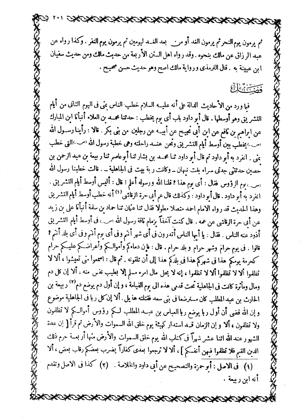 فِيمَا وَرَدَ مِنَ الْأَحَادِيثِ الدَّالَّةِ عَلَى أَنَّهُ عَلَيْهِ السَّلَامُ خَطَبَ النَّاسَ بِمِنًى فِي الْيَوْمِ الثَّانِي مِنْ أَيَّامِ التَّشْرِيقِ وَهُوَ أَوْسَطُهَا. قَالَ أَبُو دَاوُدَ بَابٌ أَيَّ يَوْمٍ يَخْطُبُ: حَدَّثَنَا مُحَمَّدُ بْنُ الْعَلَاءِ أَنْبَأَنَا ابْنُ الْمُبَارَكِ عَنْ إِبْرَاهِيمُ بْنُ نَافِعٍ عَنِ ابْنِ أَبِي نَجِيحٍ عَنْ أَبِيهِ عَنْ رَجُلَيْنِ مِنْ بَنِي بَكْرٍ. قَالَا: رَأَيْنَا رَسُولَ اللَّهِ صَلَّى اللَّهُ عَلَيْهِ وَسَلَّمَ يَخْطُبُ بَيْنَ أَوْسَطِ أَيَّامِ التَّشْرِيقِ وَنَحْنُ عِنْدَ رَاحِلَتِهِ وَهِيَ خُطْبَةِ رَسُولِ اللَّهِ صَلَّى اللَّهُ عَلَيْهِ وَسَلَّمَ الَّتِي خَطَبَ بِمِنًى. انْفَرَدَ بِهِ أَبُو دَاوُدَ ثُمَّ قَالَ أَبُو دَاوُدَ ثَنَا مُحَمَّدُ بْنُ بَشَّارٍ ثَنَا أَبُو عَاصِمٍ ثَنَا رَبِيعَةُ بْنُ عَبْدِ الرَّحْمَنِ بْنِ حصين حَدَّثَتْنِي جَدَّتِي سَرَّاءُ بِنْتُ نَبْهَانَ- وَكَانَتْ رَبَّةَ بَيْتٍ فِي الْجَاهِلِيَّةِ-. قَالَتْ خَطَبَنَا رَسُولُ اللَّهِ صَلَّى اللَّهُ عَلَيْهِ وَسَلَّمَ يَوْمَ الرُّءُوسِ فَقَالَ: أَيُّ يَوْمٍ هَذَا؟ قُلْنَا اللَّهُ وَرَسُولُهُ أَعْلَمُ! قَالَ: أَلَيْسَ أَوْسَطَ أَيَّامِ التَّشْرِيقِ. انْفَرَدَ بِهِ أَبُو دَاوُدَ. قَالَ أَبُو دَاوُدَ: وَكَذَلِكَ قَالَ عَمُّ أَبِي حُرَّةَ الرَّقَاشِيُّ [1] أَنَّهُ خَطَبَ أَوْسَطَ أَيَّامِ التَّشْرِيقِ وَهَذَا الْحَدِيثُ قَدْ رَوَاهُ الْإِمَامُ احمد متصلا مطولا فقال ثنا عثمان ثَنَا حَمَّادُ بْنُ سَلَمَةَ أَنْبَأَنَا عَلِيُّ بْنُ زَيْدٍ عَنْ أَبِي حُرَّةَ الرَّقَاشِيِّ عَنْ عَمِّهِ. قَالَ كُنْتُ آخِذًا بِزِمَامِ نَاقَةِ رَسُولِ اللَّهِ صَلَّى اللَّهُ عَلَيْهِ وَسَلَّمَ فِي أَوْسَطِ أَيَّامِ التَّشْرِيقِ أَذُودُ عَنْهُ النَّاسَ. فَقَالَ: يَا أَيُّهَا النَّاسُ أَتَدْرُونَ فِي أَيِّ شَهْرٍ أَنْتُمْ وَفِي أَيِّ يَوْمٍ أَنْتُمْ وَفِي أَيِّ بَلَدٍ أَنْتُمْ؟