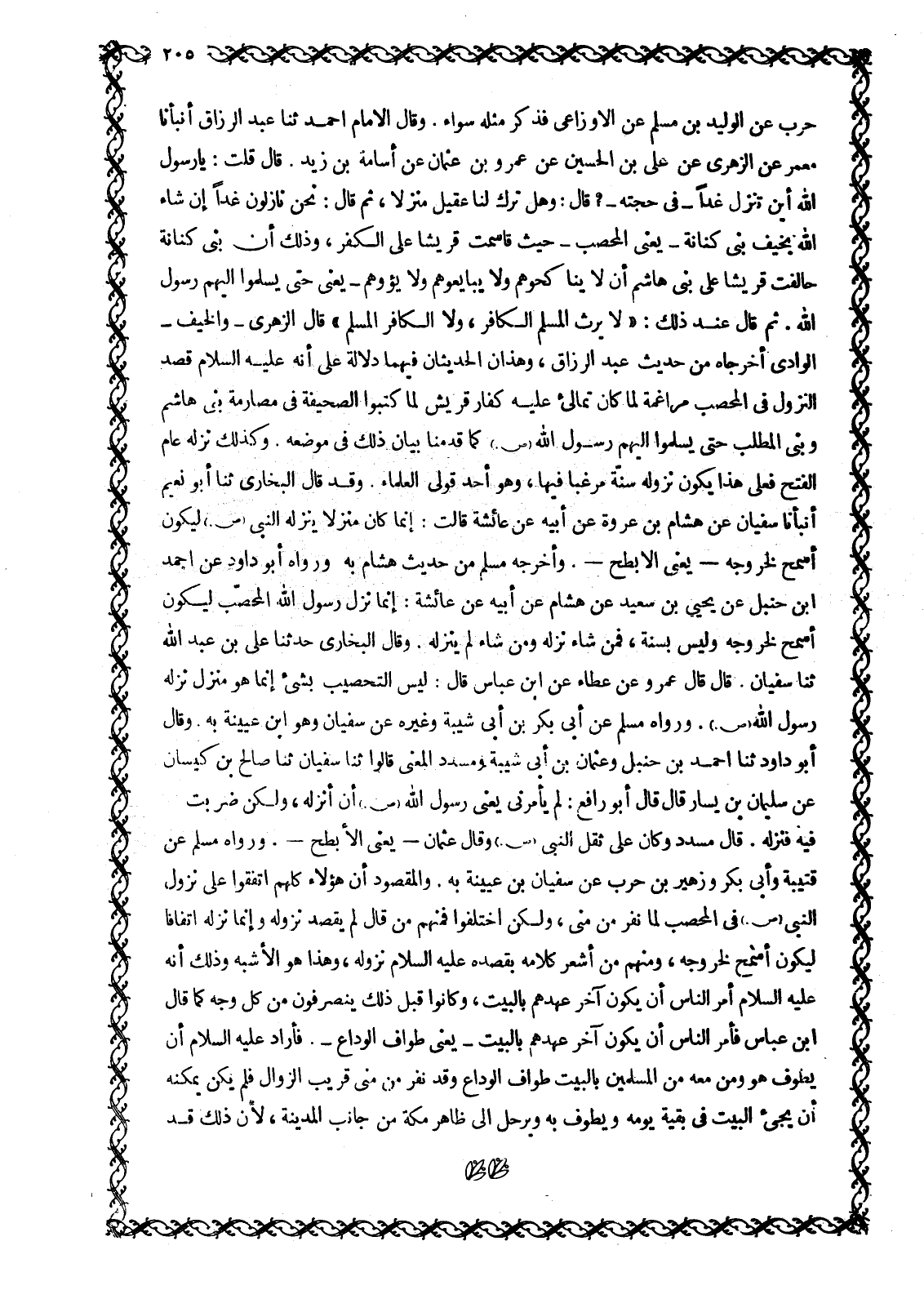 حَرْبٍ عَنِ الْوَلِيدِ بْنِ مُسْلِمٍ عَنِ الْأَوْزَاعِيِّ فَذَكَرَ مِثْلَهُ سَوَاءً. وَقَالَ الْإِمَامُ أَحْمَدُ ثَنَا عَبْدُ الرَّزَّاقِ أَنْبَأَنَا مَعْمَرٌ عَنِ الزُّهْرِيِّ عَنْ عَلِيِّ بْنِ الْحُسَيْنِ عَنْ عَمْرِو بْنِ عُثْمَانَ عَنْ أُسَامَةَ بْنِ زَيْدٍ. قَالَ قُلْتُ: يَا رَسُولَ اللَّهِ أَيْنَ تَنْزِلُ غَدًا- فِي حَجَّتِهِ-؟ قَالَ: وَهَلْ تَرَكَ لَنَا عَقِيلٌ مَنْزِلًا، ثُمَّ قَالَ: نَحْنُ نَازِلُونَ غَدًا إِنْ شَاءَ اللَّهُ بِخَيْفِ بَنِي كِنَانَةَ- يَعْنِي الْمُحَصَّبَ- حَيْثُ قاسمت قريشا عَلَى الْكُفْرِ، وَذَلِكَ أَنَّ بَنِي كِنَانَةَ حَالَفَتْ قُرَيْشًا عَلَى بَنِي هَاشِمٍ أَنْ لَا يُنَاكِحُوهُمْ ولا يبايعوهم ولا يؤوهم- يعنى حتى يسلموا اليهم رسول الله. ثُمَّ قَالَ عِنْدَ ذَلِكَ: «لَا يَرِثُ الْمُسْلِمُ الْكَافِرَ، وَلَا الْكَافِرُ الْمُسْلِمَ» قَالَ الزُّهْرِيُّ- وَالْخَيْفُ- الْوَادِي أَخْرَجَاهُ مِنْ حَدِيثِ عَبْدِ الرَّزَّاقِ، وَهَذَانَ الحديثان فيهما دلالة على أنه عليه السلام قَصَدَ النُّزُولَ فِي الْمُحَصَّبِ مُرَاغَمَةً لِمَا كَانَ تمالئ عَلَيْهِ كُفَّارُ قُرَيْشٍ لَمَّا كَتَبُوا الصَّحِيفَةَ فِي مُصَارَمَةِ بَنِي هَاشِمٍ وَبَنِي الْمُطَّلِبِ حَتَّى يُسْلِمُوا إِلَيْهِمْ رَسُولُ اللَّهِ صَلَّى اللَّهُ عَلَيْهِ وَسَلَّمَ كَمَا قَدَّمْنَا بَيَانَ ذَلِكَ فِي مَوْضِعِهِ. وَكَذَلِكَ نَزَلَهُ عَامَ الْفَتْحِ فَعَلَى هَذَا يَكُونُ نُزُولُهُ سُنَّةً مُرَغَّبًا فِيهَا، وَهُوَ أَحَدُ قَوْلَيِ الْعُلَمَاءِ. وقد قال البخاري ثنا أبو نعيم أنبأنا سُفْيَانُ عَنْ هِشَامِ بْنِ عُرْوَةَ عَنْ أَبِيهِ عَنْ عَائِشَةَ قَالَتْ: إِنَّمَا كَانَ مَنْزِلًا يَنْزِلُهُ النَّبِيُّ صَلَّى اللَّهُ عَلَيْهِ وَسَلَّمَ لِيَكُونَ أَسْمَحَ لِخُرُوجِهِ- يَعْنِي الْأَبْطَحَ-. وَأَخْرَجَهُ مُسْلِمٌ مِنْ حَدِيثِ هِشَامٍ بِهِ وَرَوَاهُ أَبُو دَاوُدَ عَنْ أَحْمَدَ ابن حَنْبَلٍ عَنْ يَحْيَى بْنِ سَعِيدٍ عَنْ هِشَامٍ عن أبيه عن عائشة: إنما نزل رسول الله الْمُحَصَّبَ لِيَكُونَ أَسْمَحَ لِخُرُوجِهِ وَلَيْسَ بِسُنَّةٍ، فَمَنْ شَاءَ نَزَلَهُ وَمَنْ شَاءَ لَمْ يَنْزِلْهُ. وَقَالَ الْبُخَارِيُّ حَدَّثَنَا عَلِيُّ بْنُ عَبْدِ اللَّهِ ثَنَا سُفْيَانُ. قَالَ قَالَ عَمْرٍو عَنْ عَطَاءٍ عَنِ ابْنِ عَبَّاسٍ قَالَ: لَيْسَ التَّحْصِيبُ بِشَيْءٍ إِنَّمَا هُوَ مَنْزِلٌ نَزَلَهُ رَسُولِ اللَّهِ صَلَّى اللَّهُ عَلَيْهِ وَسَلَّمَ. وَرَوَاهُ مُسْلِمٌ عَنْ أَبِي بَكْرِ بْنِ أَبِي شَيْبَةَ وَغَيْرِهِ عَنْ سُفْيَانَ وَهُوَ ابْنُ عُيَيْنَةَ بِهِ. وَقَالَ أَبُو دَاوُدَ ثَنَا أَحْمَدُ بْنُ حَنْبَلٍ وَعُثْمَانُ بْنُ أَبِي شَيْبَةَ وَمُسَدَّدٌ الْمَعْنَى قَالُوا ثَنَا سُفْيَانُ ثَنَا صَالِحُ بْنُ كَيْسَانَ عَنْ سُلَيْمَانَ بْنِ يَسَارٍ قَالَ قَالَ أَبُو رَافِعٍ: لَمْ يَأْمُرْنِي يَعْنِي رَسُولَ اللَّهِ صَلَّى اللَّهُ عَلَيْهِ وَسَلَّمَ أَنْ أَنْزِلَهُ، ولكن ضربت [1] فيه فَنَزَلَهُ. قَالَ مُسَدَّدٌ وَكَانَ عَلَى ثَقَلِ النَّبِيِّ صَلَّى اللَّهُ عَلَيْهِ وَسَلَّمَ وَقَالَ عُثْمَانُ- يَعْنِي الْأَبْطَحِ-. وَرَوَاهُ مُسْلِمٌ عَنْ قُتَيْبَةَ وَأَبِي بَكْرٍ وَزُهَيْرِ بْنِ حَرْبٍ عَنْ سُفْيَانَ بْنِ عُيَيْنَةَ بِهِ. وَالْمَقْصُودُ أَنَّ هَؤُلَاءِ كُلُّهُمُ اتَّفَقُوا عَلَى نُزُولِ النَّبِيِّ صَلَّى اللَّهُ عَلَيْهِ وَسَلَّمَ فِي الْمُحَصَّبِ لَمَّا نَفَرَ مِنْ مِنًى، وَلَكِنِ اخْتَلَفُوا فَمِنْهُمْ مَنْ قَالَ لَمْ يَقْصِدْ نُزُولَهُ وَإِنَّمَا نَزَلَهُ اتِّفَاقًا لِيَكُونَ أَسْمَحَ لِخُرُوجِهِ، وَمِنْهُمْ مَنْ أشعر كلامه بقصده عليه السلام نُزُولَهُ، وَهَذَا هُوَ الْأَشْبَهُ وَذَلِكَ أَنَّهُ عَلَيْهِ السلام أَمَرَ النَّاس