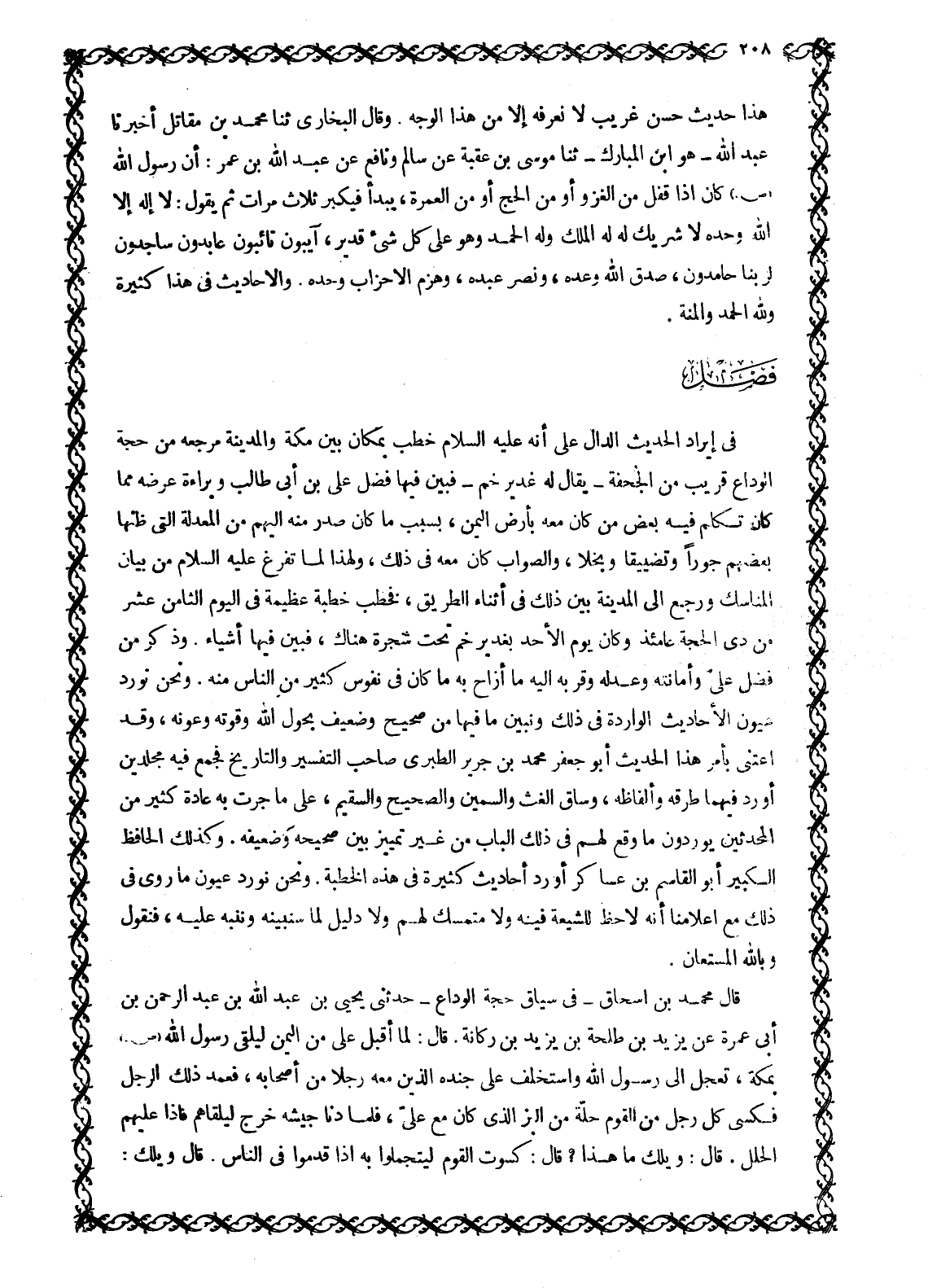 فِي إِيرَادِ الْحَدِيثِ الدَّالِّ عَلَى أَنَّهُ عليه السلام خَطَبَ بِمَكَانٍ بَيْنَ مَكَّةَ وَالْمَدِينَةِ مَرْجِعَهُ مِنْ حَجَّةِ الْوَدَاعِ قَرِيبٍ مِنَ الْجُحْفَةِ- يُقَالُ لَهُ غَدِيرُ خُمٍّ- فَبَيَّنَ فِيهَا فَضْلَ عَلِيِّ بْنِ أَبِي طَالِبٍ وَبَرَاءَةَ عِرْضِهِ مِمَّا كَانَ تَكَلَّمَ فِيهِ بَعْضُ مَنْ كَانَ مَعَهُ بِأَرْضِ الْيَمَنِ، بِسَبَبِ مَا كَانَ صَدَرَ مِنْهُ إِلَيْهِمْ مِنَ الْمَعْدِلَةِ الَّتِي ظَنَّهَا بَعْضُهُمْ جَوْرًا وَتَضْيِيقًا وَبُخْلًا، وَالصَّوَابُ كَانَ مَعَهُ فِي ذَلِكَ، وَلِهَذَا لَمَّا تفرغ عليه السلام مِنْ بَيَانِ الْمَنَاسِكِ وَرَجَعَ إِلَى الْمَدِينَةِ بَيَّنَ ذَلِكَ فِي أَثْنَاءِ الطَّرِيقِ، فَخَطَبَ خُطْبَةً عَظِيمَةً فِي الْيَوْمِ الثَّامِنَ عَشَرَ مِنْ ذِي الْحِجَّةِ عَامَئِذٍ وَكَانَ يَوْمَ الْأَحَدِ بِغَدِيرِ خُمٍّ تَحْتَ شَجَرَةٍ هُنَاكَ، فَبَيَّنَ فِيهَا أَشْيَاءَ. وَذَكَرَ مِنْ فَضْلِ عَلِيٍّ وَأَمَانَتِهِ وَعَدْلِهِ وَقُرْبِهِ إِلَيْهِ مَا أَزَاحَ بِهِ مَا كَانَ فِي نُفُوسِ كَثِيرٍ مِنَ النَّاسِ مِنْهُ. وَنَحْنُ نُورِدُ عُيُونَ الْأَحَادِيثِ الْوَارِدَةِ فِي ذَلِكَ وَنُبَيِّنُ مَا فِيهَا مِنْ صَحِيحٍ وَضَعِيفٍ بِحَوْلِ اللَّهِ وَقُوَّتِهِ وَعَوْنِهِ، وَقَدِ اعْتَنَى بِأَمْرِ هَذَا الْحَدِيثِ أَبُو جَعْفَرٍ مُحَمَّدُ بن جرير الطبري صاحب التفسير والتاريخ فَجَمَعَ فِيهِ مُجَلَّدَيْنِ أَوْرَدَ فِيهِمَا طُرُقَهُ وَأَلْفَاظَهُ، وَسَاقَ الْغَثَّ وَالسَّمِينَ وَالصَّحِيحَ وَالسَّقِيمَ، عَلَى مَا جَرَتْ بِهِ عَادَةُ كَثِيرٍ مِنَ الْمُحَدِّثِينَ يُورِدُونَ مَا وَقَعَ لَهُمْ فِي ذَلِكَ الْبَابِ مِنْ غَيْرِ تَمْيِيزٍ بَيْنَ صَحِيحِهِ وَضَعِيفِهِ. وَكَذَلِكَ الْحَافِظُ الْكَبِيرُ أَبُو الْقَاسِمِ بْنُ عَسَاكِرَ أَوْرَدَ أَحَادِيثَ كَثِيرَةً فِي هَذِهِ الْخُطْبَةِ. وَنَحْنُ نُورِدُ عُيُونَ مَا رُوِيَ فِي ذَلِكَ مَعَ إِعْلَامِنَا أَنَّهُ لَا حَظَّ لِلشِّيعَةِ فِيهِ وَلَا مُتَمَسَّكَ لَهُمْ وَلَا دَلِيلَ لِمَا سَنُبَيِّنُهُ وَنُنَبِّهُ عَلَيْهِ، فَنَقُولُ وباللَّه الْمُسْتَعَانُ.