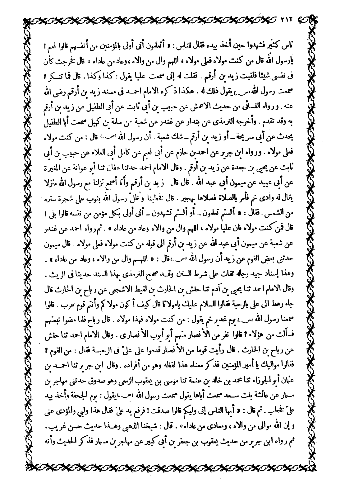 نَاسٌ كَثِيرٌ فَشَهِدُوا حِينَ أَخَذَ بِيَدِهِ فَقَالَ لِلنَّاسِ: «أَتَعْلَمُونَ أَنِّي أَوْلَى بِالْمُؤْمِنِينَ مِنْ أَنْفُسِهِمْ قَالُوا نَعَمْ! يَا رَسُولَ اللَّهِ قَالَ مَنْ كُنْتُ مَوْلَاهُ فَعَلِيٌّ مَوْلَاهُ، اللَّهمّ وَالِ مَنْ وَالَاهُ، وَعَادِ مَنْ عَادَاهُ» قَالَ فَخَرَجْتُ كَأَنَّ فِي نَفْسِي شَيْئًا فَلَقِيتُ زَيْدَ بْنَ أَرْقَمَ. فَقُلْتُ لَهُ إِنِّي سَمِعْتُ عَلِيًّا يَقُولُ: كَذَا وَكَذَا. قَالَ فَمَا تُنْكِرُ؟