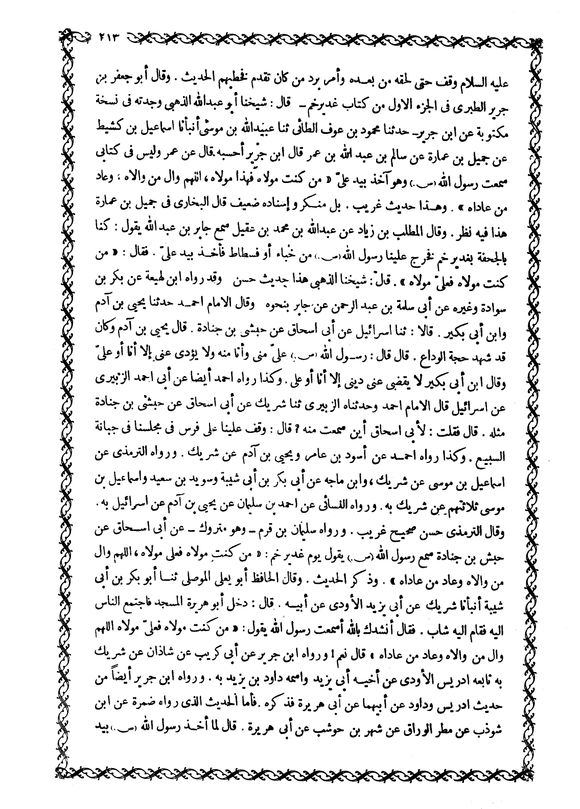 عليه السلام وَقَفَ حَتَّى لَحِقَهُ مَنْ بَعْدَهُ وَأَمَرَ بِرَدِّ مَنْ كَانَ تَقَدَّمَ فَخَطَبَهُمْ الْحَدِيثَ. وَقَالَ أَبُو جَعْفَرِ بْنُ جَرِيرٍ الطَّبَرِيُّ فِي الْجُزْءِ الْأَوَّلِ مِنْ كِتَابِ غَدِيرِ خُمٍّ- قَالَ: شَيْخُنَا أَبُو عَبْدِ اللَّهِ الذَّهَبِيُّ وَجَدْتُهُ فِي نُسْخَةٍ مَكْتُوبَةٍ عن ابن جرير- حدثنا محمود بْنُ عَوْفٍ الطَّائِيُّ ثَنَا عُبَيْدُ اللَّهِ بْنُ موسى أنبأنا إسماعيل بن كشيط عَنْ جَمِيلِ بْنِ عُمَارَةَ عَنْ سَالِمِ بْنِ عَبْدِ اللَّهِ بْنِ عُمَرَ قَالَ ابْنُ جَرِيرٍ أَحْسَبُهُ قَالَ عَنْ عُمَرَ وَلَيْسَ فِي كِتَابِي سَمِعْتُ رَسُولَ اللَّهِ صَلَّى اللَّهُ عَلَيْهِ وَسَلَّمَ وَهُوَ آخِذٌ بِيَدِ عَلِيٍّ «مَنْ كُنْتُ مَوْلَاهُ فَهَذَا مَوْلَاهُ، اللَّهمّ وَالِ مَنْ وَالَاهُ، وَعَادِ مَنْ عَادَاهُ» . وَهَذَا حَدِيثٌ غَرِيبٌ. بَلْ مُنْكَرٌ وَإِسْنَادُهُ ضَعِيفٌ قَالَ الْبُخَارِيُّ فِي جَمِيلِ بْنِ عُمَارَةَ هَذَا فِيهِ نَظَرٌ. وَقَالَ الْمُطَّلِبُ بْنُ زِيَادٍ عَنْ عَبْدِ اللَّهِ بْنِ مُحَمَّدِ بْنِ عَقِيلٍ سَمِعَ جَابِرَ بْنَ عَبْدِ اللَّهِ يَقُولُ: كُنَّا بِالْجُحْفَةِ بِغَدِيرِ خُمٍّ فَخَرَجَ عَلَيْنَا رَسُولُ اللَّهِ صَلَّى اللَّهُ عَلَيْهِ وَسَلَّمَ مِنْ خِبَاءٍ أَوْ فُسْطَاطٍ فَأَخَذَ بِيَدِ عَلِيٍّ. فَقَالَ: «مَنْ كُنْتُ مَوْلَاهُ فَعَلِيٌّ مَوْلَاهُ» . قَالَ: شَيْخُنَا الذَّهَبِيُّ هَذَا حَدِيثٌ حَسَنٌ وَقَدْ رَوَاهُ ابْنُ لَهِيعَةَ عَنْ بَكْرِ بْنِ سَوَادَةَ وَغَيْرِهِ عَنْ أَبِي سَلَمَةَ بْنِ عَبْدِ الرَّحْمَنِ عَنْ جَابِرٍ بِنَحْوِهِ. وَقَالَ الْإِمَامُ أَحْمَدُ حَدَّثَنَا يَحْيَى بْنُ آدَمَ وَابْنُ أَبِي بُكَيْرٍ. قَالَا: ثَنَا إِسْرَائِيلُ عَنْ أَبِي إِسْحَاقَ عَنْ حُبْشِيِّ بْنِ جُنَادَةَ. قَالَ يَحْيَى بْنُ آدَمَ وَكَانَ قَدْ شَهِدَ حَجَّةَ الْوَدَاعِ. قَالَ قَالَ: رَسُولُ اللَّهِ صَلَّى اللَّهُ عَلَيْهِ وَسَلَّمَ عَلِيٌّ مِنِّي وَأَنَا مِنْهُ وَلَا يُؤَدِّي عَنِّي إِلَّا أَنَا أَوْ عَلِيٌّ وَقَالَ ابْنُ أَبِي بُكَيْرٍ لَا يَقْضِي عَنِّي دَيْنِي إِلَّا أَنَا أَوْ عَلِيٌّ. وَكَذَا رَوَاهُ أَحْمَدُ أَيْضًا عَنْ أَبِي أَحْمَدَ الزُّبَيْرِيِّ عَنْ إِسْرَائِيلَ قَالَ الْإِمَامُ أَحْمَدُ وَحَدَّثَنَاهُ الزُّبَيْرِيُّ ثَنَا شَرِيكٌ عَنْ أَبِي إِسْحَاقَ عَنْ حُبْشِيِّ بْنِ جُنَادَةَ مِثْلَهُ. قَالَ فَقُلْتُ: لِأَبِي إِسْحَاقَ أَيْنَ سَمِعْتَ منه؟ قال: وقف علينا على فرس فِي مَجْلِسِنَا فِي جَبَّانَةِ السَّبِيعِ. وَكَذَا رَوَاهُ أَحْمَدُ عَنْ أَسْوَدَ بْنِ عَامِرٍ وَيَحْيَى بْنِ آدَمَ عَنْ شَرِيكٍ. وَرَوَاهُ التِّرْمِذِيُّ عَنْ إِسْمَاعِيلَ بْنِ مُوسَى عَنْ شَرِيكٍ، وَابْنِ مَاجَهْ عَنْ أَبِي بَكْرِ بْنِ أَبِي شَيْبَةَ وَسُوَيْدِ بْنِ سَعِيدٍ وَإِسْمَاعِيلَ بْنِ مُوسَى ثَلَاثَتُهُمْ عَنْ شَرِيكٍ بِهِ. وَرَوَاهُ النَّسَائِيُّ عَنْ أَحْمَدَ بْنِ سُلَيْمَانَ عَنْ يَحْيَى بْنِ آدَمَ عَنْ إِسْرَائِيلَ بِهِ.
