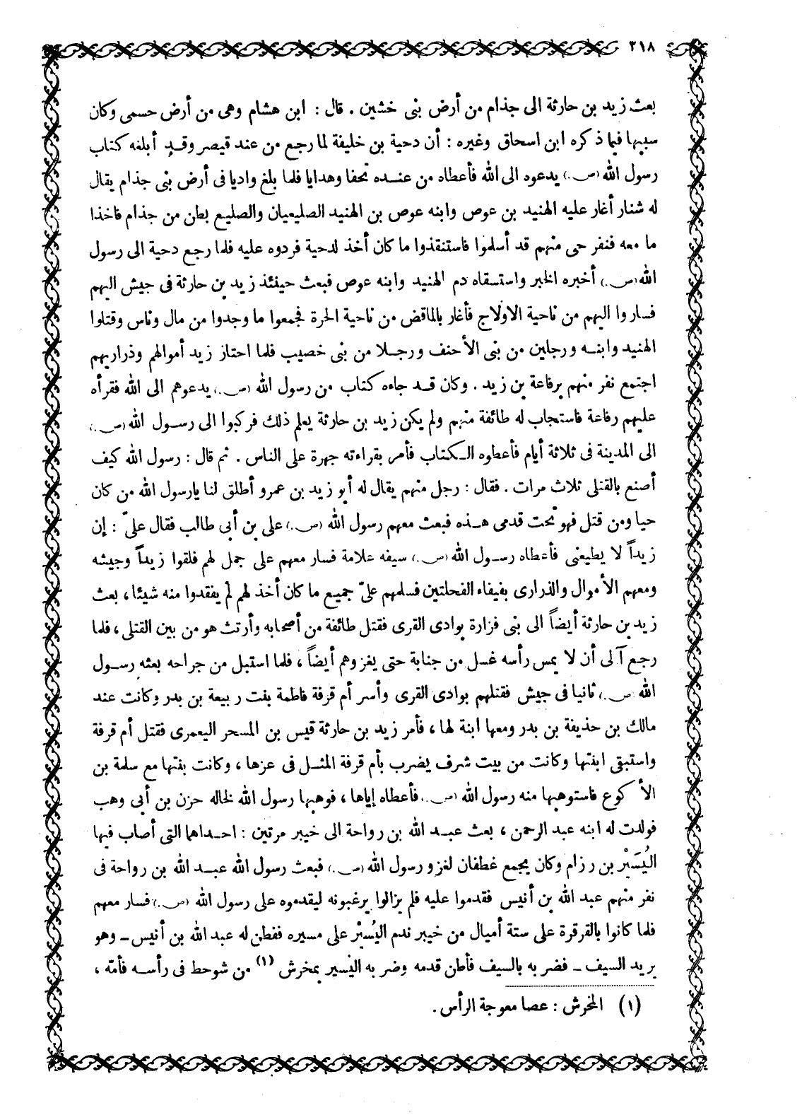 بَعْثُ زَيْدِ بْنِ حَارِثَةَ إِلَى جُذَامٍ مِنْ أَرْضِ بَنِي خُشَيْنٍ. قَالَ: ابْنُ هِشَامٍ وَهِيَ من أرض حسمى وكان سبيها فِيمَا ذَكَرَهُ ابْنُ إِسْحَاقَ وَغَيْرُهُ: أَنَّ دِحْيَةَ بْنَ خَلِيفَةَ لَمَّا رَجَعَ مِنْ عِنْدِ قَيْصَرَ وَقَدْ أَبْلَغَهُ كِتَابَ رَسُولُ اللَّهِ صَلَّى اللَّهُ عَلَيْهِ وَسَلَّمَ يَدْعُوهُ إِلَى اللَّهِ فَأَعْطَاهُ مِنْ عِنْدِهِ تُحَفًا وَهَدَايَا فَلَمَّا بَلَغَ وَادِيًا فِي أَرْضِ بَنِي جُذَامٍ يُقَالُ لَهُ شَنَارٌ أَغَارَ عَلَيْهِ الْهُنَيْدُ بْنُ عَوْصٍ وَابْنُهُ عَوْصُ بْنُ الْهُنَيْدِ الصُّلَيْعِيَّانِ وَالصُّلَيْعُ بَطْنٌ مِنْ جُذَامٍ فَأَخَذَا مَا مَعَهُ فَنَفَرَ حَيٌّ مِنْهُمْ قَدْ أَسْلَمُوا فَاسْتَنْقَذُوا مَا كَانَ أُخِذَ لِدِحْيَةَ فَرَدُّوهُ عَلَيْهِ فَلَمَّا رَجَعَ دِحْيَةُ إِلَى رَسُولِ اللَّهِ صَلَّى اللَّهُ عَلَيْهِ وَسَلَّمَ أَخْبَرَهُ الْخَبَرَ وَاسْتَسْقَاهُ دَمَ الْهُنَيْدِ وَابْنِهِ عَوْصٍ فَبَعَثَ حِينَئِذٍ زَيْدَ بْنَ حَارِثَةَ فِي جَيْشٍ إِلَيْهِمْ فَسَارُوا إِلَيْهِمْ مِنْ ناحية الاولاج فأغار بالماقض مِنْ نَاحِيَةِ الْحَرَّةِ فَجَمَعُوا مَا وَجَدُوا مِنْ مَالٍ وَنَاسٍ وَقَتَلُوا الْهُنَيْدَ وَابْنَهُ وَرَجُلَيْنِ مِنْ بَنِي الْأَحْنَفِ وَرَجُلًا مِنْ بَنِي خَصِيبٍ فَلَمَّا احْتَازَ زَيْدٌ أَمْوَالَهُمْ وَذَرَارِيَّهِمُ اجْتَمَعَ نَفَرٌ مِنْهُمْ بِرِفَاعَةَ بْنِ زَيْدٍ. وَكَانَ قَدْ جَاءَهُ كِتَابٌ مِنْ رَسُولِ اللَّهِ صَلَّى اللَّهُ عَلَيْهِ وَسَلَّمَ يَدْعُوهُمْ إِلَى اللَّهِ فَقَرَأَهُ عَلَيْهِمْ رِفَاعَةُ فَاسْتَجَابَ لَهُ طَائِفَةٌ مِنْهُمْ وَلَمْ يَكُنْ زَيْدُ بْنُ حارثة يعلم ذلك فَرَكِبُوا إِلَى رَسُولِ اللَّهِ صَلَّى اللَّهُ عَلَيْهِ وَسَلَّمَ إِلَى الْمَدِينَةِ فِي ثَلَاثَةِ أَيَّامٍ فَأَعْطَوْهُ الْكِتَابَ فَأَمَرَ بِقِرَاءَتِهِ جَهْرَةً عَلَى النَّاسِ. ثُمَّ قال: رسول الله كَيْفَ أَصْنَعُ بِالْقَتْلَى ثَلَاثَ مَرَّاتٍ. فَقَالَ: رَجُلٌ مِنْهُمْ يُقَالُ لَهُ أَبُو زَيْدِ بْنُ عَمْرٍو أَطْلِقْ لَنَا يَا رَسُولَ اللَّهِ مَنْ كَانَ حَيًّا وَمَنْ قُتِلَ فَهُوَ تَحْتَ قَدَمِي هَذِهِ فَبَعَثَ مَعَهُمْ رَسُولُ اللَّهِ صَلَّى اللَّهُ عَلَيْهِ وَسَلَّمَ عَلِيَّ بْنَ أَبِي طَالِبٍ فَقَالَ عَلِيٌّ: إِنَّ زَيْدًا لَا يُطِيعُنِي فَأَعْطَاهُ رَسُولُ اللَّهِ صَلَّى اللَّهُ عَلَيْهِ وَسَلَّمَ سَيْفَهُ عَلَامَةً فَسَارَ مَعَهُمْ عَلَى جَمَلٍ لَهُمْ فَلَقُوا زَيْدًا وَجَيْشَهُ وَمَعَهُمُ الْأَمْوَالُ وَالذَّرَارِيَّ بِفَيْفَاءِ الْفَحْلَتَيْنِ فَسَلَّمَهُمْ عَلِيٌّ جَمِيعَ مَا كَانَ أُخِذَ لَهُمْ لَمْ يَفْقِدُوا مِنْهُ شَيْئًا، بَعْثُ زَيْدِ بْنِ حَارِثَةَ أَيْضًا إِلَى بَنِي فَزَارَةَ بِوَادِي الْقُرَى فَقُتِلَ طَائِفَةٌ مِنْ أَصْحَابِهِ وَارْتَثَّ هُوَ مِنْ بَيْنِ الْقَتْلَى، فَلَمَّا رَجَعَ آلَى أَنْ لَا يَمَسَّ رَأْسَهُ غُسْلٌ مِنْ جَنَابَةٍ حَتَّى يَغْزُوَهُمْ أَيْضًا، فَلَمَّا اسْتَبَلَّ مِنْ جِرَاحِهِ بَعَثَهُ رَسُولُ اللَّهِ صَلَّى اللَّهُ عَلَيْهِ وَسَلَّمَ ثَانِيًا فِي جَيْشٍ فَقَتَلَهُمْ بِوَادِي الْقُرَى وَأَسَرَ أُمَّ قِرْفَةَ فَاطِمَةَ بِنْتَ رَبِيعَةَ بْنِ بَدْرٍ وَكَانَتْ عِنْدَ مَالِكِ بْنِ حُذَيْفَةَ بْنِ بَدْرٍ وَمَعَهَا ابْنَةٌ لَهَا، فَأَمَرَ زَيْدُ بْنُ حَارِثَةَ قَيْسَ بْنَ الْمُسَحَّرِ الْيَعْمَرِيَّ فَقَتَلَ أُمَّ قِرْفَةَ وَاسْتَبْقَى ابْنَتَهَا وَكَانَتْ مِنْ بَيْتِ شَرَفٍ يُضْرَبُ بِأُمِّ قِرْفَةَ الْمَثَلُ فِي عِزِّهَا، وَكَانَتْ بِنْتُهَا مَعَ سَلَمَةَ بْنِ الْأَكْوَعِ فَاسْتَوْهَبَهَا مِنْهُ رَسُولُ اللَّهِ صَلَّى اللَّهُ عَلَيْهِ وَسَلَّمَ فأعطاه إياها، فوهبها رسول الل