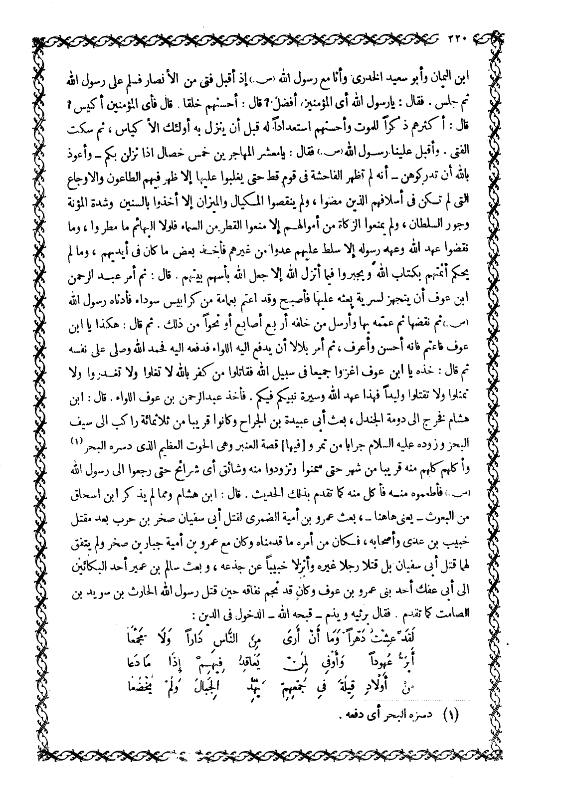 قَالَ: أَكْثَرُهُمْ ذِكْرًا لِلْمَوْتِ وَأَحْسَنُهُمُ اسْتِعْدَادًا لَهُ قَبْلَ أَنْ يَنْزِلَ بِهِ أُولَئِكَ الْأَكْيَاسُ، ثُمَّ سَكَتَ الْفَتَى. وَأَقْبَلَ عَلَيْنَا رَسُولُ اللَّهِ صَلَّى اللَّهُ عَلَيْهِ وَسَلَّمَ فَقَالَ: يَا مَعْشَرَ الْمُهَاجِرِينَ خَمْسُ خِصَالٍ إِذَا نَزَلْنَ بِكُمْ- وَأَعُوذُ باللَّه أَنْ تُدْرِكُوهُنَّ- إِنَّهُ لَمْ تَظْهَرِ الْفَاحِشَةُ فِي قَوْمٍ قَطُّ حَتَّى يغلبوا عليها إِلَّا ظَهَرَ فِيهِمُ الطَّاعُونُ وَالْأَوْجَاعُ الَّتِي لَمْ تَكُنْ فِي أَسْلَافِهِمُ الَّذِينَ مَضَوْا، وَلَمْ يَنْقُصُوا الْمِكْيَالَ وَالْمِيزَانَ إِلَّا أُخِذُوا بِالسِّنِينَ وَشِدَّةِ الْمُؤْنَةِ وَجَوْرِ السُّلْطَانِ، وَلَمْ يَمْنَعُوا الزَّكَاةَ مِنْ أَمْوَالِهِمْ إِلَّا مُنِعُوا الْقَطْرَ مِنَ السَّمَاءِ فَلَوْلَا الْبَهَائِمُ مَا مُطِرُوا، وَمَا نَقَضُوا عَهْدَ اللَّهِ وَعَهْدَ رسوله إلا سلط عَلَيْهِمْ عَدُوًّا مِنْ غَيْرِهِمْ فَأَخَذَ بَعْضَ مَا كَانَ فِي أَيْدِيهِمْ، وَمَا لَمْ يَحْكُمْ أَئِمَّتُهُمْ بكتاب الله ويجبروا فِيمَا أَنْزَلَ اللَّهُ إِلَّا جَعَلَ اللَّهُ بَأْسَهُمُ بَيْنَهُمْ. قال: ثم أمر عبد الرحمن ابن عَوْفٍ أَنْ يَتَجَهَّزَ لِسَرِيَّةٍ بَعَثَهُ عَلَيْهَا فَأَصْبَحَ وَقَدِ اعْتَمَّ بِعِمَامَةٍ مِنْ كَرَابِيسَ سَوْدَاءَ فَأَدْنَاهُ رَسُولُ اللَّهِ صَلَّى اللَّهُ عَلَيْهِ وَسَلَّمَ ثُمَّ نَقَضَهَا ثُمَّ عَمَّمَهُ بِهَا وَأَرْسَلَ مِنْ خَلْفِهِ أَرْبَعَ أَصَابِعَ أَوْ نَحْوًا مِنْ ذَلِكَ. ثُمَّ قَالَ: هَكَذَا يَا ابْنَ عَوْفٍ فَاعْتَمَّ فَإِنَّهُ أَحْسَنُ وَأَعْرَفُ، ثُمَّ أَمَرَ بِلَالًا أَنْ يَدْفَعَ إِلَيْهِ اللِّوَاءَ فَدَفَعَهُ إِلَيْهِ فَحَمِدَ اللَّهَ وَصَلَّى عَلَى نَفْسِهِ ثُمَّ قَالَ: خُذْهُ يَا ابْنَ عَوْفٍ اغْزُوا جَمِيعًا فِي سَبِيلِ اللَّهِ فَقَاتَلُوا مَنْ كَفَرَ باللَّه لَا تَغُلُّوا وَلَا تَغْدِرُوا وَلَا تُمَثِّلُوا وَلَا تَقْتُلُوا وَلِيدًا فَهَذَا عَهْدُ الله وسيرة نبيكم فِيكُمْ. فَأَخَذَ عَبْدُ الرَّحْمَنِ بْنُ عَوْفٍ اللِّوَاءَ. قَالَ: ابْنُ هِشَامٍ فَخَرَجَ إِلَى دُومَةِ الْجَنْدَلِ، بعث أبى عبيدة بن الجراح وَكَانُوا قَرِيبًا مِنْ ثَلَاثِمِائَةِ رَاكِبٍ إِلَى سِيفِ البحر وزوده عليه السلام جرابا من تمر و [فيها] قِصَّةُ الْعَنْبَرِ وَهِيَ الْحُوتُ الْعَظِيمُ الَّذِي دَسَرَهُ الْبَحْرُ [1] وَأَكْلُهُمْ كُلِّهِمْ مِنْهُ قَرِيبًا مِنْ شَهْرٍ حَتَّى سَمِنُوا وَتَزَوَّدُوا مِنْهُ وَشَائِقَ أَيْ شَرَائِحَ حَتَّى رَجَعُوا إِلَى رَسُولِ اللَّهِ صَلَّى اللَّهُ عَلَيْهِ وَسَلَّمَ فَأَطْعَمُوهُ مِنْهُ فَأَكَلَ مِنْهُ كَمَا تَقَدَّمَ بِذَلِكَ الْحَدِيثُ. قَالَ: ابْنُ هِشَامٍ وَمِمَّا لَمْ يَذْكُرِ ابْنُ إِسْحَاقَ مِنَ الْبُعُوثِ- يَعْنِي ها هنا-، بَعْثُ عَمْرِو بْنِ أُمَيَّةَ الضَّمْرِيِّ لِقَتْلِ أَبِي سُفْيَانَ صَخْرِ بْنِ حَرْبٍ بَعْدَ مَقْتَلِ خُبَيْبِ بْنِ عَدِيٍّ وَأَصْحَابِهِ، فَكَانَ مِنْ أَمْرِهِ مَا قَدَّمْنَاهُ وَكَانَ مَعَ عَمْرِو بْنِ أُمَيَّةَ جَبَّارُ بْنُ صَخْرٍ وَلَمْ يَتَّفِقْ لَهُمَا قَتْلُ أَبِي سُفْيَانَ بَلْ قَتَلَا رَجُلًا غَيْرَهُ وَأَنْزَلَا خُبَيْبًا عَنْ جِذْعِهِ، وَبَعْثُ سَالِمِ بْنِ عُمَيْرٍ أَحَدِ البكاءين إِلَى أَبِي عَفَكٍ أَحَدِ بَنِي عَمْرِو بْنِ عَوْفٍ وَكَانَ قَدْ نَجَمَ نِفَاقُهُ حِينَ قَتَلَ رسول الله الْحَارِثَ بْنَ سُوَيْدِ بْنِ الصَّامِتِ كَمَا تَقَدَّمَ. فَقَالَ يَرْثِيهِ وَيَذُمُّ- قَبَّحَهُ اللَّهُ- الدُّخُولَ فِي الدِّينِ: