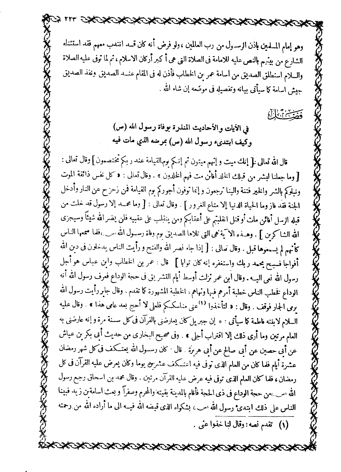 فَصْلٌ فِي الْآيَاتِ وَالْأَحَادِيثِ الْمُنْذِرَةِ بِوَفَاةِ رَسُولِ اللَّهِ صَلَّى اللَّهُ عَلَيْهِ وَسَلَّمَ وَكَيْفَ ابْتُدِئَ رَسُولُ اللَّهِ صَلَّى اللَّهُ عَلَيْهِ وَسَلَّمَ بِمَرَضِهِ الَّذِي مَاتَ فِيهِ