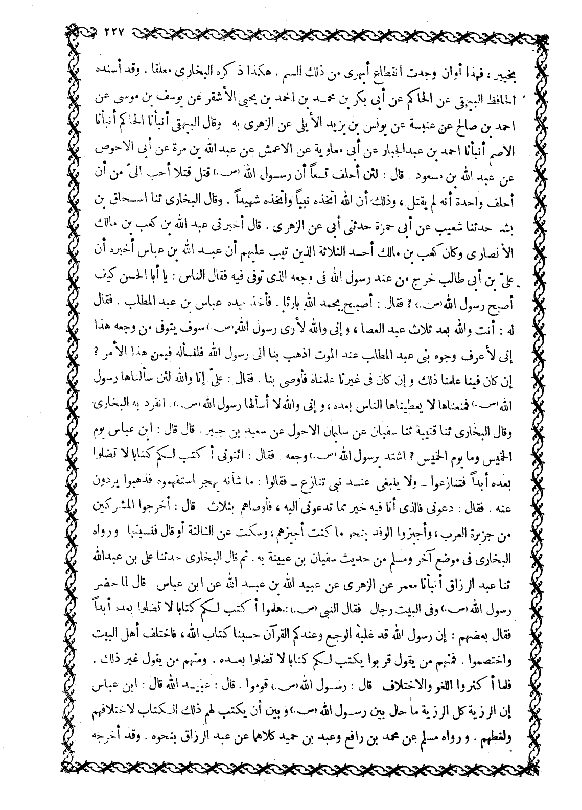 إِنْ كَانَ فِينَا عَلِمْنَا ذَلِكَ وَإِنْ كَانَ فِي غَيْرِنَا عَلِمْنَاهُ فَأَوْصَى بِنَا. فَقَالَ: عَلِيٌّ إِنَّا وَاللَّهِ لَئِنْ سَأَلْنَاهَا رَسُولَ اللَّهِ صَلَّى اللَّهُ عَلَيْهِ وَسَلَّمَ فَمَنَعَنَاهَا لَا يُعْطِينَاهَا النَّاسُ بَعْدَهُ، وَإِنِّي وَاللَّهِ لَا أَسْأَلُهَا رَسُولِ اللَّهِ صَلَّى اللَّهُ عَلَيْهِ وَسَلَّمَ. انْفَرَدَ بِهِ الْبُخَارِيُّ وَقَالَ الْبُخَارِيُّ ثَنَا قُتَيْبَةُ ثَنَا سُفْيَانُ عَنْ سُلَيْمَانَ الْأَحْوَلِ عَنْ سَعِيدِ بْنِ جُبَيْرٍ. قَالَ قَالَ: ابْنُ عَبَّاسٍ يَوْمُ الْخَمِيسِ وَمَا يَوْمُ الْخَمِيسِ؟ اشْتَدَّ بِرَسُولِ اللَّهِ صَلَّى اللَّهُ عَلَيْهِ وَسَلَّمَ وَجَعُهُ. فَقَالَ: ائتوني أكتب لكم كتابا لا تَضِلُّوا بَعْدَهُ أَبَدًا فَتَنَازَعُوا- وَلَا يَنْبَغِي عِنْدَ نَبِيٍّ تَنَازُعٌ- فَقَالُوا: مَا شَأْنُهُ يَهْجُرُ اسْتَفْهِمُوهُ فَذَهَبُوا يَرُدُّونَ عَنْهُ. فَقَالَ: دَعُونِي فَالَّذِي أَنَا فِيهِ خَيْرٌ مِمَّا تَدْعُونِي إِلَيْهِ، فَأَوْصَاهُمْ بِثَلَاثٍ. قَالَ: أَخْرِجُوا الْمُشْرِكِينَ مِنْ جَزِيرَةِ الْعَرَبِ، وَأَجِيزُوا الْوَفْدَ بِنَحْوِ مَا كُنْتُ أُجِيزُهُمْ، وَسَكَتَ عَنِ الثَّالِثَةِ أَوْ قَالَ فَنَسِيتُهَا وَرَوَاهُ الْبُخَارِيُّ فِي مَوْضِعٍ آخَرَ وَمُسْلِمٌ مِنْ حَدِيثِ سُفْيَانَ بْنِ عُيَيْنَةَ بِهِ. ثُمَّ قَالَ الْبُخَارِيُّ حَدَّثَنَا عَلِيُّ بْنُ عَبْدِ اللَّهِ ثَنَا عَبْدُ الرَّزَّاقِ أَنْبَأَنَا مَعْمَرٌ عَنِ الزُّهْرِيِّ عَنْ عُبَيْدِ اللَّهِ بْنِ عَبْدِ اللَّهِ عَنِ ابْنِ عَبَّاسٍ قَالَ لَمَّا حَضَرَ رَسُولِ اللَّهِ صَلَّى اللَّهُ عَلَيْهِ وَسَلَّمَ وَفِي الْبَيْتِ رِجَالٌ فَقَالَ النَّبِيُّ صَلَّى اللَّهُ عَلَيْهِ وَسَلَّمَ: هَلُمُّوا أَكْتُبْ لَكُمْ كِتَابًا لَا تضلوا بعده أبدا فَقَالَ بَعْضُهُمْ: إِنَّ رَسُولَ اللَّهِ قَدْ غَلَبَهُ الْوَجَعُ وَعِنْدَكُمُ الْقُرْآنُ حَسْبُنَا كِتَابُ اللَّهِ، فَاخْتَلَفَ أَهْلُ الْبَيْتِ وَاخْتَصَمُوا فَمِنْهُمْ مَنْ يَقُولُ قَرِّبُوا يَكْتُبْ لَكُمْ كِتَابًا لَا تَضِلُّوا بَعْدَهُ. وَمِنْهُمْ مَنْ يَقُولُ غَيْرَ ذَلِكَ.
